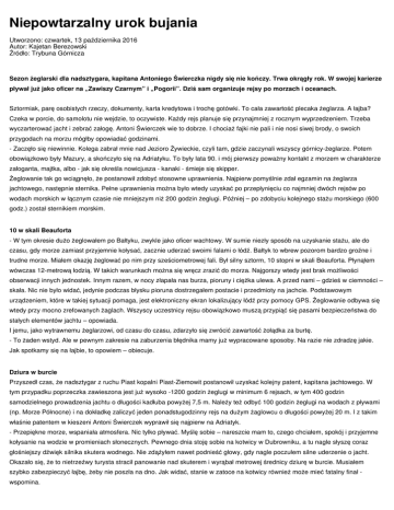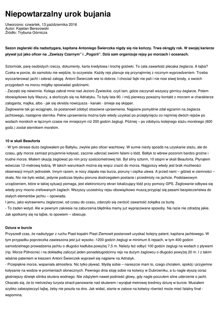Niepowtarzalny urok bujania Utworzono: czwartek, 13 października 2016 Autor: Kajetan Berezowski Źródło: Trybuna Górnicza Sezon żeglarski dla nadsztygara, kapitana Antoniego Świerczka nigdy się nie kończy. Trwa okrągły rok. W swojej karierze pływał już jako oficer na „Zawiszy Czarnym” i „Pogorii”. Dziś sam organizuje rejsy po morzach i oceanach. Sztormiak, parę osobistych rzeczy, dokumenty, karta kredytowa i trochę gotówki. To cała zawartość plecaka żeglarza. A łajba? Czeka w porcie, do samolotu nie wejdzie, to oczywiste. Każdy rejs planuje się przynajmniej z rocznym wyprzedzeniem. Trzeba wyczarterować jacht i zebrać załogę. Antoni Świerczek wie to dobrze. I chociaż fajki nie pali i nie nosi siwej brody, o swoich przygodach na morzu mógłby opowiadać godzinami. - Zaczęło się niewinnie. Kolega zabrał mnie nad Jezioro Żywieckie, czyli tam, gdzie zaczynali wszyscy górnicy-żeglarze. Potem obowiązkowo były Mazury, a skończyło się na Adriatyku. To były lata 90. i mój pierwszy poważny kontakt z morzem w charakterze załoganta, majtka, albo - jak się określa nowicjusza - kanaki - śmieje się skipper. Żeglowanie tak go wciągnęło, że postanowił zdobyć stosowne uprawnienia. Najpierw pomyślnie zdał egzamin na żeglarza jachtowego, następnie sternika. Pełne uprawnienia można było wtedy uzyskać po przepłynięciu co najmniej dwóch rejsów po wodach morskich w łącznym czasie nie mniejszym niż 200 godzin żeglugi. Później – po zdobyciu kolejnego stażu morskiego (600 godz.) został sternikiem morskim. 10 w skali Beauforta - W tym okresie dużo żeglowałem po Bałtyku, zwykle jako oficer wachtowy. W sumie niezły sposób na uzyskanie stażu, ale do czasu, gdy morze zamiast przyjemnie kołysać, zacznie uderzać swoimi falami o łódź. Bałtyk to wbrew pozorom bardzo groźne i trudne morze. Miałem okazję żeglować po nim przy sześciometrowej fali. Był silny sztorm, 10 stopni w skali Beauforta. Płynąłem wówczas 12-metrową łodzią. W takich warunkach można się wręcz zrazić do morza. Najgorszy wtedy jest brak możliwości obserwacji innych jednostek. Innym razem, w nocy złapała nas burza, pioruny i ciężka ulewa. A przed nami – gdzieś w ciemności – skała. Nic nie było widać, jedynie podczas błysku pioruna dostrzegałem postacie i przedmioty na jachcie. Podstawowym urządzeniem, które w takiej sytuacji pomaga, jest elektroniczny ekran lokalizujący łódź przy pomocy GPS. Żeglowanie odbywa się wtedy przy mocno zrefowanych żaglach. Wszyscy uczestnicy rejsu obowiązkowo muszą przypiąć się pasami bezpieczeństwa do stałych elementów jachtu – opowiada. I jemu, jako wytrawnemu żeglarzowi, od czasu do czasu, zdarzyło się zwrócić zawartość żołądka za burtę. - To żaden wstyd. Ale w pewnym zakresie na zaburzenia błędnika mamy już wypracowane sposoby. Na razie nie zdradzę jakie. Jak spotkamy się na łajbie, to opowiem – obiecuje. Dziura w burcie Przyszedł czas, że nadsztygar z ruchu Piast kopalni Piast-Ziemowit postanowił uzyskać kolejny patent, kapitana jachtowego. W tym przypadku poprzeczka zawieszona jest już wysoko -1200 godzin żeglugi w minimum 6 rejsach, w tym 400 godzin samodzielnego prowadzenia jachtu o długości kadłuba powyżej 7,5 m. Należy też odbyć 100 godzin żeglugi na wodach z pływami (np. Morze Północne) i na dokładkę zaliczyć jeden ponadstugodzinny rejs na dużym żaglowcu o długości powyżej 20 m. I z takim właśnie patentem w kieszeni Antoni Świerczek wyprawił się najpierw na Adriatyk. - Przepiękne morze, wspaniała atmosfera. Nic tylko pływać. Myślę sobie – nareszcie mam to, czego chciałem, spokój i przyjemne kołysanie na wodzie w promieniach słonecznych. Pewnego dnia stoję sobie na kotwicy w Dubrowniku, a tu nagle słyszę coraz głośniejszy dźwięk silnika skutera wodnego. Nie zdążyłem nawet podnieść głowy, gdy nagle poczułem silne uderzenie o jacht. Okazało się, że to nietrzeźwy turysta stracił panowanie nad skuterem i wyrąbał metrowej średnicy dziurę w burcie. Musiałem szybko zabezpieczyć łajbę, żeby nie poszła na dno. Jak widać, stanie w zatoce na kotwicy również może mieć fatalny finał wspomina. Marzą mu się fiordy Kapitan nadsztygar wrócił właśnie ze swego jesiennego i zarazem ostatniego tegorocznego rejsu u wybrzeży Grecji. Z Aten popłynął na Cyklady. Znowu nowe porty i kolejne doświadczenia. Jak sam powiada – pływanie na jachcie to najwspanialszy sposób zwiedzania świata. Po kilku latach spędzonych na rejsach po morzach południowych tęskno mu do fiordów Norwegii. - Zimno? Nie, dla kapitana nie ma złej lub dobrej pogody. Śnieg, deszcz, mgła. Żadne warunki nie mogą zniechęcać do rejsu. Bałtyk, Morze Północne i Norweskie mają swój niepowtarzalny urok. Kto nie miał okazji się przekonać, niech żałuje – zauważa skipper i przyznaje, że trudno skompletować załogę na taki właśnie sztormowy rejs. Cóż, większość amatorów żeglowania woli oglądać słońce niż przemakać na nocnej wachcie na pokładzie rzucanego przez fale jachtu. A może jednak ktoś się skusi popłynąć w siną dal z nadsztygarem w roli kapitana? Adrenalina murowana.