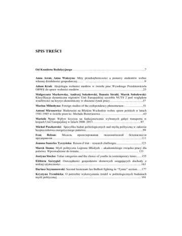 SPIS TREŚCI Od Komitetu Redakcyjnego ……………………………………………………………..7 Anna Arent, Anna Walczyna: Mity przedsiębiorczości a postawy studentów wobec własnej działalności gospodarczej…… ………………………………………………….9 Adam Kruk: Aksjologia wolności mediów w świetle prac Wysokiego Przedstawiciela OBWE do spraw wolności mediów………………………………………………………25 Małgorzata Markowska, Andrzej Sokołowski, Danuta Strahl, Marek Sobolewski: Klasyfikacja dynamiczna regionów Unii Europejskiej szczebla NUTS 2 pod względem wrażliwości na kryzys ekonomiczny w obszarze rynek pracy…………………………...37 Marina Milushyna: Foreign studies of the codependency phenomenon………………..51 Antoni Mironowicz: Białorusini na Bliskim Wschodzie wobec spraw polskich w latach 1941-1945 w świetle pism ks. Michała Bożerianowa…………………………………….63 Mariola Nycz: Wpływ kryzysu na funkcjonowanie wybranych gałęzi transportu w krajach Unii Europejskiej w latach 2008–2013………………………………………...87 Michał Paszkowski: Specyfika badań politologicznych nad myślą polityczną w zakresie bezpieczeństwa energetycznego państwa………………………………………………...99 Ivan Rekun: Модель проектирования экономической безопасности предприятия…………………………………………………………………………….111 Joanna Sanecka Tyczyńska: Raison d’état – research challenges.................................123 Marek Sioma: Myśl polityczna Legionu Młodych – akademickiego związku pracy dla państwa. Wprowadzenie do tematu………………………………………………….. 133 Justyna Stecko: Value categories and the choice of youths in contemporary times.......155 Elżbieta Szczygieł: Oszczędności gospodarstw domowych osiągających dochody o niskiej użyteczności……………………………………………………………..………163 Dariusz Szymanowski: Second lieutenant Jan Bołbott fighting in “Tynne” section…..177 Krystyna Trembicka: O potrzebie wykorzystania źródeł w politologicznych badaniach myśli politycznej……………………………………………………………………….. 191 CONTENTS From the Editorial Committee ……………………………..……………………………7 Anna Arent, Anna Walczyna: The myths of entrepreneurship vs the students’ attitudes towards their own business activity……………………………………………………..…9 Adam Kruk: Axiology freedom of the media in the light of the work of The Osce High representative on freedom of the media…………………………….…………………….25 Małgorzata Markowska, Andrzej Sokołowski, Danuta Strahl, Marek Sobolewski: Dynamic classification of the European Union NUTS 2 regions in terms of sensitivity to economic crisis (area: labour market)…………………………………………………….37 Marina Milushyna: Foreign studies of the codependency phenomenon………..………51 Antoni Mironowicz: Belarusians in the Middle East and Polish problems in 1941-1945 in the writings of rev. Michał Bożerianow……………………………………………..……63 Mariola Nycz: Influence of crisis on the functioning selected branches of transport in the European Union countries in the years 2008–2013............................................................87 Michał Paszkowski:Special features of reaserch on political thought in the field of energy security……………………………………………………………………………………99 Ivan Rekun: Model of designing of economic security………………………………111 Joanna Sanecka Tyczyńska: Raison d’état – research challenges.................................123 Marek Sioma: The political thought of Legion of the Young – ‘work for the state’ academic association. Introduction to the topic…………………………………………133 Justyna Stecko: Value categories and the choice of youths in contemporary times.......155 Elżbieta Szczygieł: The savings of households which achieved the low utilities income………………………………………………………………...…………………163 Dariusz Szymanowski: Second lieutenant Jan Bołbott fighting in “Tynne” section…………………………………………………………………………………...177 Krystyna Trembicka: About the need to use sources in political research of political thought………...………………………………………………………...………………191