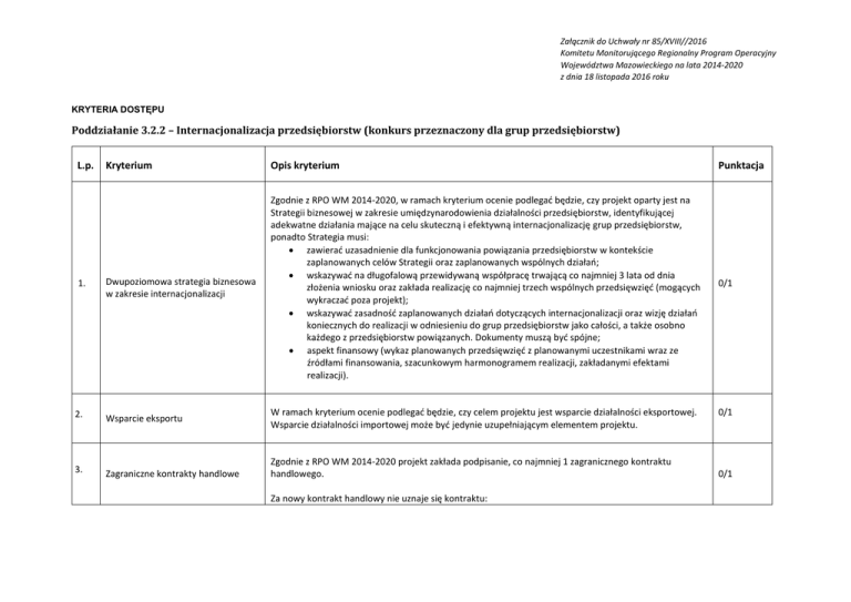 Załącznik do Uchwały nr 85/XVIII//2016 Komitetu Monitorującego Regionalny Program Operacyjny Województwa Mazowieckiego na lata 2014-2020 z dnia 18 listopada 2016 roku KRYTERIA DOSTĘPU Poddziałanie 3.2.2 – Internacjonalizacja przedsiębiorstw (konkurs przeznaczony dla grup przedsiębiorstw) L.p. Kryterium Opis kryterium Punktacja Dwupoziomowa strategia biznesowa w zakresie internacjonalizacji Zgodnie z RPO WM 2014-2020, w ramach kryterium ocenie podlegać będzie, czy projekt oparty jest na Strategii biznesowej w zakresie umiędzynarodowienia działalności przedsiębiorstw, identyfikującej adekwatne działania mające na celu skuteczną i efektywną internacjonalizację grup przedsiębiorstw, ponadto Strategia musi: zawierać uzasadnienie dla funkcjonowania powiązania przedsiębiorstw w kontekście zaplanowanych celów Strategii oraz zaplanowanych wspólnych działań; wskazywać na długofalową przewidywaną współpracę trwającą co najmniej 3 lata od dnia złożenia wniosku oraz zakłada realizację co najmniej trzech wspólnych przedsięwzięć (mogących wykraczać poza projekt); wskazywać zasadność zaplanowanych działań dotyczących internacjonalizacji oraz wizję działań koniecznych do realizacji w odniesieniu do grup przedsiębiorstw jako całości, a także osobno każdego z przedsiębiorstw powiązanych. Dokumenty muszą być spójne; aspekt finansowy (wykaz planowanych przedsięwzięć z planowanymi uczestnikami wraz ze źródłami finansowania, szacunkowym harmonogramem realizacji, zakładanymi efektami realizacji). 0/1 2. Wsparcie eksportu W ramach kryterium ocenie podlegać będzie, czy celem projektu jest wsparcie działalności eksportowej. Wsparcie działalności importowej może być jedynie uzupełniającym elementem projektu. 3. Zagraniczne kontrakty handlowe 1. Zgodnie z RPO WM 2014-2020 projekt zakłada podpisanie, co najmniej 1 zagranicznego kontraktu handlowego. Za nowy kontrakt handlowy nie uznaje się kontraktu: 0/1 0/1 podpisanego z przedsiębiorstwami powiązanymi w rozumieniu artykułu 3 Załącznika I do Rozporządzenia Komisji numer 651/2014 z dnia 17 czerwca 2014 r.; zawartego z kontrahentem, z którym partner lub członek grupy miał podpisaną umowę po 01.01.2011 r. na ten sam lub zbliżony produkt (wyrób lub usługę). Kryterium powiązane jest ze wskaźnikiem: „Liczba kontraktów handlowych zagranicznych podpisanych przez przedsiębiorstwa wsparte w zakresie internacjonalizacji” W ramach kryterium ocenie podlegać będzie, czy projekt jest skierowany do grupy przedsiębiorstw spełniającej łącznie następujące warunki: do grupy należy minimum 3 MŚP dla projektów spełniający poniższy warunek nr 1 lub 5 MŚP dla projektów spełniający poniższy warunek nr 2; przedsiębiorcy należący do grupy działają w tych samych lub pokrewnych sektorach; pomiędzy MŚP nie może zachodzić powiązanie w rozumieniu artykułu 3 Załącznika I do Rozporządzenia Komisji numer 651/2014 z dnia 17 czerwca 2014 r. 4. Charakterystyka grupy przedsiębiorstw Ponadto grupa przedsiębiorstw musi spełniać jeden z poniższych warunków: 1. grupa przedsiębiorstw musi mieć formę porozumienia lub umowy o partnerstwie (zgodnie z artykułem 33 ustęp 1 ustawy z dnia 11 lipca 2014 r. o zasadach realizacji programów w zakresie polityki spójności finansowanych w perspektywie finansowej 2014 – 2020 Dziennik Urzędowy z 2016 r., pozycja 217) dołączonej do dokumentacji; 2. projekt jest realizowany przez koordynatora na rzecz przedsiębiorstw współdziałających w ramach grupy. Pomiędzy koordynatorem a przedsiębiorstwami współdziałającymi w ramach grupy (odbiorcami wsparcia) nie może zachodzić powiązanie w rozumieniu artykułu 3 Załącznika I do Rozporządzenia Komisji numer 651/2014 z dnia 17 czerwca 2014 r. 5. Stabilność firmy W ramach kryterium ocenie podlegać będzie, czy każdy z partnerów lub przedsiębiorstw współdziałających w ramach grupy w ciągu ostatnich 3 lat obrachunkowych przed dniem złożenia 0/1 0/1 2 wniosku, zamknął przynajmniej jeden rok obrotowy trwający przynajmniej 12 miesięcy zakończony dodatnim wynikiem finansowym. W szczególności weryfikowana będzie sytuacja finansowa każdego z partnerów lub przedsiębiorstw współdziałających w ramach grupy gwarantująca zdolność do realizacji projektu. Wykonalność finansowa W ramach kryterium ocenie podlegać będzie, czy projekt jest wiarygodny oraz rzetelne analizy wskazują, że: koszty są kwalifikowalne w ramach działania oraz niezbędne do realizacji projektu i osiągnięcia jego celów; analiza finansowa i ekonomiczna jest poprawna, założenia do analizy, w szczególności – analizy przychodów, są uzasadnione i rzetelne (ocena uwzględnia sytuację finansową każdego z partnerów i koordynatora, i przedsiębiorstw współdziałających w ramach grupy); harmonogram rzeczowo-finansowy projektu jest czytelny i realny do przeprowadzenia, umożliwia prawidłową i terminową realizację przedsięwzięcia. Kryterium uznaje się za spełnione w sytuacji, gdy zostały spełnione wszystkie ww. warunki. Potencjał koordynatora grupy przedsiębiorstw1 W ramach kryterium ocenie podlegać będzie, czy koordynator grupy przedsiębiorstw funkcjonuje na rynku nie krócej niż 24 miesiące przed dniem złożenia wniosku i zrealizował co najmniej 3 przedsięwzięcia na rzecz MŚP. 6. 7. 0/1 0/1 Weryfikowana będzie również sytuacja finansowa koordynatora gwarantująca zdolność do realizacji projektu. 1 Kryterium zostanie zastosowane w przypadku realizacji projektów przez koordynatora na rzecz przedsiębiorstw współdziałających w ramach grupy, zgodnie z pkt 2 kryterium dostępu nr 4. 3 KRYTERIA MERYTORYCZNE – SZCZEGÓŁOWE Poddziałanie 3.2.2 – Internacjonalizacja przedsiębiorstw (konkurs przeznaczony dla grup przedsiębiorstw) L.p. Kryterium 1. Doświadczenie Opis kryterium Punktacja Kryterium promuje projekty, w których grupa prz