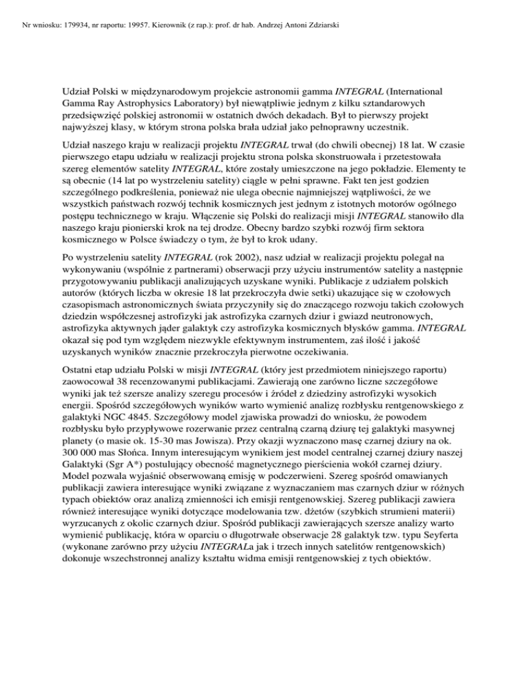 Nr wniosku: 179934, nr raportu: 19957. Kierownik (z rap.): prof. dr hab. Andrzej Antoni Zdziarski Udział Polski w międzynarodowym projekcie astronomii gamma INTEGRAL (International Gamma Ray Astrophysics Laboratory) był niewątpliwie jednym z kilku sztandarowych przedsięwzięć polskiej astronomii w ostatnich dwóch dekadach. Był to pierwszy projekt najwyższej klasy, w którym strona polska brała udział jako pełnoprawny uczestnik. Udział naszego kraju w realizacji projektu INTEGRAL trwał (do chwili obecnej) 18 lat. W czasie pierwszego etapu udziału w realizacji projektu strona polska skonstruowała i przetestowała szereg elementów satelity INTEGRAL, które zostały umieszczone na jego pokładzie. Elementy te są obecnie (14 lat po wystrzeleniu satelity) ciągle w pełni sprawne. Fakt ten jest godzien szczególnego podkreślenia, ponieważ nie ulega obecnie najmniejszej wątpliwości, że we wszystkich państwach rozwój technik kosmicznych jest jednym z istotnych motorów ogólnego postępu technicznego w kraju. Włączenie się Polski do realizacji misji INTEGRAL stanowiło dla naszego kraju pionierski krok na tej drodze. Obecny bardzo szybki rozwój firm sektora kosmicznego w Polsce świadczy o tym, że był to krok udany. Po wystrzeleniu satelity INTEGRAL (rok 2002), nasz udział w realizacji projektu polegał na wykonywaniu (wspólnie z partnerami) obserwacji przy użyciu instrumentów satelity a następnie przygotowywaniu publikacji analizujących uzyskane wyniki. Publikacje z udziałem polskich autorów (których liczba w okresie 18 lat przekroczyła dwie setki) ukazujące się w czołowych czasopismach astronomicznych świata przyczyniły się do znaczącego rozwoju takich czołowych dziedzin współczesnej astrofizyki jak astrofizyka czarnych dziur i gwiazd neutronowych, astrofizyka aktywnych jąder galaktyk czy astrofizyka kosmicznych błysków gamma. INTEGRAL okazał się pod tym względem niezwykle efektywnym instrumentem, zaś ilość i jakość uzyskanych wyników znacznie przekroczyła pierwotne oczekiwania. Ostatni etap udziału Polski w misji INTEGRAL (który jest przedmiotem niniejszego raportu) zaowocował 38 recenzowanymi publikacjami. Zawierają one zarówno liczne szczegółowe wyniki jak też szersze analizy szeregu procesów i źródeł z dziedziny astrofizyki wysokich energii. Spośród szczegółowych wyników warto wymienić analizę rozbłysku rentgenowskiego z galaktyki NGC 4845. Szczegółowy model zjawiska prowadzi do wniosku, że powodem rozbłysku było przypływowe rozerwanie przez centralną czarną dziurę tej galaktyki masywnej planety (o masie ok. 15-30 mas Jowisza). Przy okazji wyznaczono masę czarnej dziury na ok. 300 000 mas Słońca. Innym interesującym wynikiem jest model centralnej czarnej dziury naszej Galaktyki (Sgr A*) postulujący obecność magnetycznego pierścienia wokół czarnej dziury. Model pozwala wyjaśnić obserwowaną emisję w podczerwieni. Szereg spośród omawianych publikacji zawiera interesujące wyniki związane z wyznaczaniem mas czarnych dziur w różnych typach obiektów oraz analizą zmienności ich emisji rentgenowskiej. Szereg publikacji zawiera również interesujące wyniki dotyczące modelowania tzw. dżetów (szybkich strumieni materii) wyrzucanych z okolic czarnych dziur. Spośród publikacji zawierających szersze analizy warto wymienić publikację, która w oparciu o długotrwałe obserwacje 28 galaktyk tzw. typu Seyferta (wykonane zarówno przy użyciu INTEGRALa jak i trzech innych satelitów rentgenowskich) dokonuje wszechstronnej analizy kształtu widma emisji rentgenowskiej z tych obiektów.