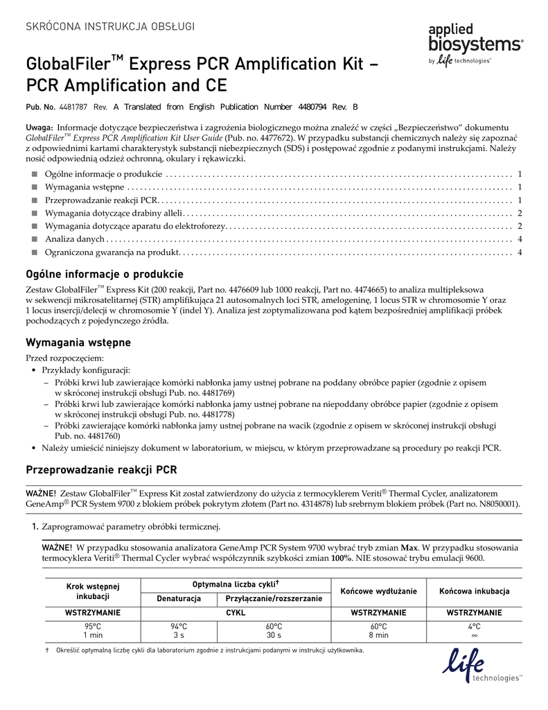 SKRÓCONA INSTRUKCJA OBSŁUGI GlobalFiler™ Express PCR Amplification Kit – PCR Amplification and CE Pub. No. 4481787 Rev. A Translated from English Publication Number 4480794 Rev. B Uwaga: Informacje dotyczące bezpieczeństwa i zagrożenia biologicznego można znaleźć w części „Bezpieczeństwo” dokumentu GlobalFiler™ Express PCR Amplification Kit User Guide (Pub. no. 4477672). W przypadku substancji chemicznych należy się zapoznać z odpowiednimi kartami charakterystyk substancji niebezpiecznych (SDS) i postępować zgodnie z podanymi instrukcjami. Należy nosić odpowiednią odzież ochronną, okulary i rękawiczki. ■ Ogólne informacje o produkcie . . . . . . . . . . . . . . . . . . . . . . . . . . . . . . . . . . . . . . . . . . . . . . . . . . . . . . . . . . . . . . . . . . . . . . . . . . . . . . . . . . 1 ■ Wymagania wstępne . . . . . . . . . . . . . . . . . . . . . . . . . . . . . . . . . . . . . . . . . . . . . . . . . . . . . . . . . . . . . . . . . . . . . . . . . . . . . . . . . . . . . . . . . . . 1 ■ Przeprowadzanie reakcji PCR. . . . . . . . . . . . . . . . . . . . . . . . . . . . . . . . . . . . . . . . . . . . . . . . . . . . . . . . . . . . . . . . . . . . . . . . . . . . . . . . . . . . 1 ■ Wymagania dotyczące drabiny alleli. . . . . . . . . . . . . . . . . . . . . . . . . . . . . . . . . . . . . . . . . . . . . . . . . . . . . . . . . . . . . . . . . . . . . . . . . . . . . . 2 ■ Wymagania dotyczące aparatu do elektroforezy. . . . . . . . . . . . . . . . . . . . . . . . . . . . . . . . . . . . . . . . . . . . . . . . . . . . . . . . . . . . . . . . . . . . 2 ■ Analiza danych . . . . . . . . . . . . . . . . . . . . . . . . . . . . . . . . . . . . . . . . . . . . . . . . . . . . . . . . . . . . . . . . . . . . . . . . . . . . . . . . . . . . . . . . . . . . . . . . 4 ■ Ograniczona gwarancja na produkt. . . . . . . . . . . . . . . . . . . . . . . . . . . . . . . . . . . . . . . . . . . . . . . . . . . . . . . . . . . . . . . . . . . . . . . . . . . . . . . 4 Ogólne informacje o produkcie Zestaw GlobalFiler™ Express Kit (200 reakcji, Part no. 4476609 lub 1000 reakcji, Part no. 4474665) to analiza multipleksowa w sekwencji mikrosatelitarnej (STR) amplifikująca 21 autosomalnych loci STR, amelogeninę, 1 locus STR w chromosomie Y oraz 1 locus insercji/delecji w chromosomie Y (indel Y). Analiza jest zoptymalizowana pod kątem bezpośredniej amplifikacji próbek pochodzących z pojedynczego źródła. Wymagania wstępne Przed rozpoczęciem: • Przykłady konfiguracji: – Próbki krwi lub zawierające komórki nabłonka jamy ustnej pobrane na poddany obróbce papier (zgodnie z opisem w skróconej instrukcji obsługi Pub. no. 4481769) – Próbki krwi lub zawierające komórki nabłonka jamy ustnej pobrane na niepoddany obróbce papier (zgodnie z opisem w skróconej instrukcji obsługi Pub. no. 4481778) – Próbki zawierające komórki nabłonka jamy ustnej pobrane na wacik (zgodnie z opisem w skróconej instrukcji obsługi Pub. no. 4481760) • Należy umieścić niniejszy dokument w laboratorium, w miejscu, w którym przeprowadzane są procedury po reakcji PCR. Przeprowadzanie reakcji PCR WAŻNE! Zestaw GlobalFiler™ Express Kit został zatwierdzony do użycia z termocyklerem Veriti® Thermal Cycler, analizatorem GeneAmp® PCR System 9700 z blokiem próbek pokrytym złotem (Part no. 4314878) lub srebrnym blokiem próbek (Part no. N8050001). 1. Zaprogramować parametry obróbki termicznej. WAŻNE! W przypadku stosowania analizatora GeneAmp PCR System 9700 wybrać tryb zmian Max. W przypadku stosowania termocyklera Veriti® Thermal Cycler wybrać współczynnik szybkości zmian 100%. NIE stosować trybu emulacji 9600. Krok wstępnej inkubacji Optymalna liczba cykli† Denaturacja WSTRZYMANIE 95°C 1 min † Przyłączanie/rozszerzanie CYKL 94°C 3s Końcowe wydłużanie Końcowa inkubacja WSTRZYMANIE WSTRZYMANIE 60°C 8 min 4°C ∞ 60°C 30 s Określić optymalną liczbę cykli dla laboratorium zgodnie z instrukcjami podanymi w instrukcji użytkownika. 2. Włożyć płytkę do termocyklera i zamknąć pokrywę grzejną. WAŻNE! W przypadku stosowania termocyklera 9700 z blokiem srebrnym lub srebrnym powlekanym złotem umieścić na płytce nakładkę kompresyjną MicroAmp® Compression Pad (Part no. 4312639) w celu dodatkowego zabezpieczenia przed parowaniem w trakcie obróbki termicznej. Termocykler Veriti® Thermal Cycler nie wymaga stosowania nakładki kompresyjnej. 3. Uruchomić proces amplifikacji. 4. Po zakończeniu reakcji zachować amplifikowany DNA. W przypadku przechowywania DNA przez... Umieścić w temperaturze... < 2 tygodnie Od 2 do 8°C > 2 tygodnie Od -15 do -25°C WAŻNE! Chronić produkty amplifikacji przed działaniem światła. Wymagania dotyczące drabiny alleli Aby uzyskać dokładny genotyp próbek, należy rozdzielić próbkę drabiny alleli równolegle z próbkami badanymi. Urządzenie Liczba drabin alleli do rozdzielenia Jeden nastrzyk to Liczba próbek na drabiny alleli 3130 1 na 4 nastrzyki 4 próbki 15 próbek + 1 drabina alleli 3130xl 1 na nastrzyk 16 próbek 15 próbek + 1 drabina alleli 3500 1 na 3 nastrzyki 8 próbek 23 próbki + 1 drabina alleli 3500xL 1 na nastrzyk 24 próbki 23 próbki + 1 drabina alleli 3730 3 na nastrzyk 48 próbek 15 próbek + 1 drabina alleli WAŻNE! Zmienna temperatura w laboratorium może wpłynąć na prędkość migracji fragmentów oraz spowodować różnice w wielkościach między poszczególnymi rozdzieleniami. Zaleca się zastosowanie powyższej częstotliwości nastrzyku drabin alleli, która powinna uwzględniać normalną zmienność szybkości rozdzielania. Wymaganą częstotliwość nastrzyku drabin alleli należy jednak zweryfikować w ramach wewnętrznych procedur walidacyjnych, aby mieć pewność uzyskiwania dokładnego genotypu wszystkich próbek w określonych warunkach laboratoryjnych. Uzyskiwanie genotypu poprzez rozdzielanie drabin alleli w takich samych waru