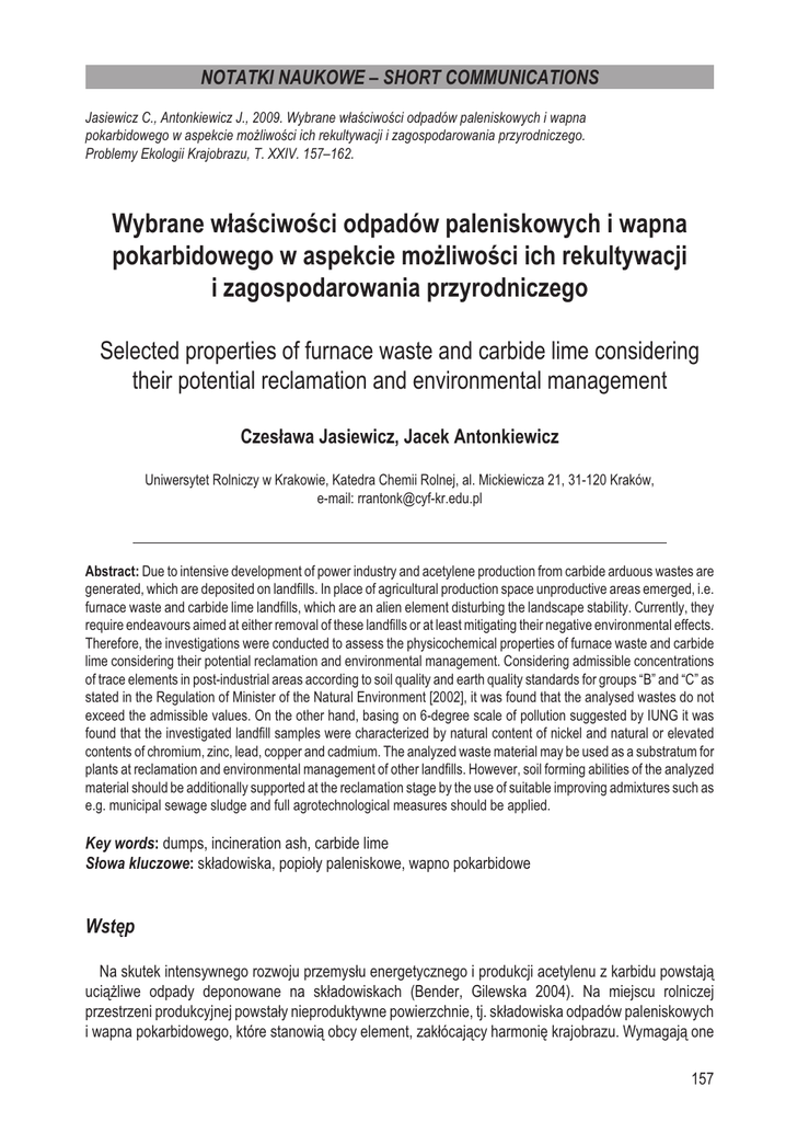 NOTATKI NAUKOWE – SHORT COMMUNICATIONS Jasiewicz C., Antonkiewicz J., 2009. Wybrane w³aœciwoœci odpadów paleniskowych i wapna pokarbidowego w aspekcie mo¿liwoœci ich rekultywacji i zagospodarowania przyrodniczego. Problemy Ekologii Krajobrazu, T. XXIV. 157–162. Wybrane w³aœciwoœci odpadów paleniskowych i wapna pokarbidowego w aspekcie mo¿liwoœci ich rekultywacji i zagospodarowania przyrodniczego Selected properties of furnace waste and carbide lime considering their potential reclamation and environmental management Czes³awa Jasiewicz, Jacek Antonkiewicz Uniwersytet Rolniczy w Krakowie, Katedra Chemii Rolnej, al. Mickiewicza 21, 31-120 Kraków, e-mail: [email protected] Abstract: Due to intensive development of power industry and acetylene production from carbide arduous wastes are generated, which are deposited on landfills. In place of agricultural production space unproductive areas emerged, i.e. furnace waste and carbide lime landfills, which are an alien element disturbing the landscape stability. Currently, they require endeavours aimed at either removal of these landfills or at least mitigating their negative environmental effects. Therefore, the investigations were conducted to assess the physicochemical properties of furnace waste and carbide lime considering their potential reclamation and environmental management. Considering admissible concentrations of trace elements in post-industrial areas according to soil quality and earth quality standards for groups “B” and “C” as stated in the Regulation of Minister of the Natural Environment [2002], it was found that the analysed wastes do not exceed the admissible values. On the other hand, basing on 6-degree scale of pollution suggested by IUNG it was found that the investigated landfill samples were characterized by natural content of nickel and natural or elevated contents of chromium, zinc, lead, copper and cadmium. The analyzed waste material may be used as a substratum for plants at reclamation and environmental management of other landfills. However, soil forming abilities of the analyzed material should be additionally supported at the reclamation stage by the use of suitable improving admixtures such as e.g. municipal sewage sludge and full agrotechnological measures should be applied. Key words: dumps, incineration ash, carbide lime S³owa kluczowe: sk³adowiska, popio³y paleniskowe, wapno pokarbidowe Wstêp Na skutek intensywnego rozwoju przemys³u energetycznego i produkcji acetylenu z karbidu powstaj¹ uci¹¿liwe odpady deponowane na sk³adowiskach (Bender, Gilewska 2004). Na miejscu rolniczej przestrzeni produkcyjnej powsta³y nieproduktywne powierzchnie, tj. sk³adowiska odpadów paleniskowych i wapna pokarbidowego, które stanowi¹ obcy element, zak³ócaj¹cy harmoniê krajobrazu. Wymagaj¹ one 157 Jasiewicz C., Antonkiewicz J. aktualnie przedsiêwziêæ zmierzaj¹cych, jeœli nie do usuniêcia tych sk³adowisk, to przynajmniej do z³agodzenia ujemnych skutków wywo³anych ich istnieniem (Kowalczyk 1995, Bender, Gilewska 2004). Sk³adowiska budowane w latach ubieg³ych bardzo czêsto mog¹ stanowiæ potencjalne zagro¿enie dla otaczaj¹cego œrodowiska. Obecnie podejmuje siê próby wprowadzenia roœlinnoœci pionierskiej w celu obudowy skarp i wierzchowin sk³adowisk. Roœlinnoœæ ta ma stanowiæ element poprawiaj¹cy estetykê terenu poprzemys³owego (Strzyszcz 2004, Antonkiewicz, Radkowski 2006). Biologiczna obudowa ma tak¿e na celu m.in. ograniczenie negatywnegi oddzia³ywania sk³adowiska na otaczaj¹ce œrodowisko (Rosik-Dulewska, Karwaczyñska 1995, Niemyska-£ukaszuk et al. 2003). St¹d celem podjêtych badañ by³a ocena w³aœciwoœci fizykochemicznych odpadów paleniskowych i wapna pokarbidowego w aspekcie mo¿liwoœci ich rekultywacji i zagospodarowania przyrodniczego. Materia³ i metody Wykorzystanie popio³ów paleniskowych i wapna pokarbidowego jako surowców do rekultywacji terenów poprzemys³owych oceniano m.in. na podstawie w³aœciwoœci fizycznochemicznych wy¿ej wymienionych odpadów. Analizie poddano ³¹cznie 50 próbek pobranych z g³êbokoœci 0–20 cm ze sk³adowisk odpadów paleniskowych i wapna pokarbidowego. Do analiz fizycznochemicznych pobrano materia³ reprezentuj¹cy osadnik III o powierzchni 23 ha, obejmuj¹cy trzy kwatery: 1. kwaterê nieczynn¹ L£ popio³ów paleniskowych, pobrano 20 próbek, w tym 10 z czaszy sk³adowiska oraz 10 z obwa³owañ, 2. kwaterê czynn¹ L£ popio³ów paleniskowych, pobrano 10 próbek, w tym 5 z czaszy sk³adowiska i 5 z obwa³owañ, 3. kwaterê wapienn¹ – sk³adowisko wapna pokarbidowego, otrzymywanego po produkcji acetylenu, pobrano 10 próbek z czaszy sk³adowiska i 10 próbek z obwa³owañ. W celu okreœlenia niektórych w³aœciwoœci fizykochemicznych badanego pod³o¿a oznaczono metodami powszechnie stosowanymi w chemii rolnej i gleboznawstwie (Ostrowska et al. 1991): sk³ad granulometryczny metod¹ Bouyoucosa-Casagrande w modyfikacji Prószyñskiego, odczyn w 1 mol . dm-3 KCl metod¹ potencjometryczn¹, zawartoœæ wêgla organicznego metod¹ Tiurina, zawartoœæ przyswajalnego fosforu i potasu metod¹ Egnera-Riehma i zawartoœæ przyswajalnego magnezu metod¹ Schachtschabela. Bior¹c pod uwagê zagro¿enia dla œrodowiska przyrodniczego, które mog¹ byæ zwi¹zane z podwy¿szon¹ zawartoœci¹ metali ciê¿kich, w ramach badañ oznaczono ca³kowit¹ zawartoœæ Cr, Zn, Pb, Cu, Cd, Ni po uprzednim trawieniu próbek w mieszaninie kwasu azotowego (V) i kwasu chlorowego (VII) o stosunku objêtoœciowym 3:2. Analiza materia³u roœlinnego obejmowa³a oznaczenie zawartoœci wymienionych metali po uprzedniej mineralizacji materia³u na „sucho”. Zawartoœæ tych pierwiastków w pod³o¿u i trzcinniku oznaczono metod¹ ICP-AES (inductively coupled plasma – atomowa spektrofotometria emisyjna oparta na palniku indukcyjnie wzbudzonej plazmy), za pomoc¹ spektrometru sekwencyjnego, model JY-238 Ultrace. Do oblicze
