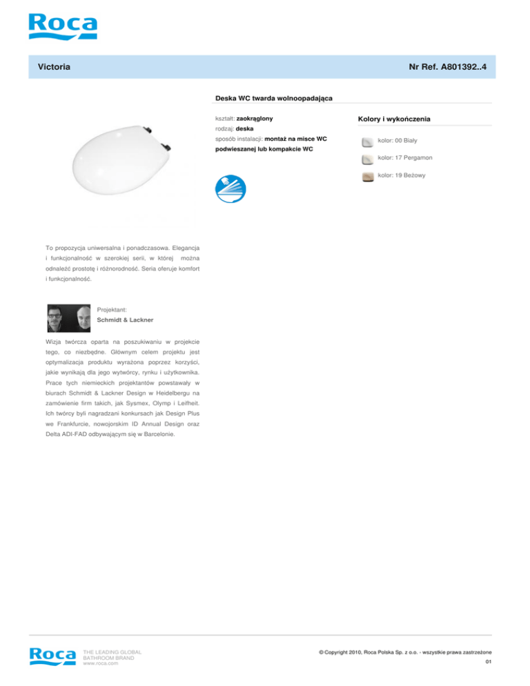 Victoria Nr Ref. A801392..4 Deska WC twarda wolnoopadająca kształt: zaokrąglony Kolory i wykończenia rodzaj: deska sposób instalacji: montaż na misce WC kolor: 00 Biały podwieszanej lub kompakcie WC kolor: 17 Pergamon kolor: 19 Beżowy To propozycja uniwersalna i ponadczasowa. Elegancja i funkcjonalność w szerokiej serii, w której można odnaleźć prostotę i różnorodność. Seria oferuje komfort i funkcjonalność. Projektant: Schmidt & Lackner Wizja twórcza oparta na poszukiwaniu w projekcie tego, co niezbędne. Głównym celem projektu jest optymalizacja produktu wyrażona poprzez korzyści, jakie wynikają dla jego wytwórcy, rynku i użytkownika. Prace tych niemieckich projektantów powstawały w biurach Schmidt & Lackner Design w Heidelbergu na zamówienie firm takich, jak Sysmex, Olymp i Leifheit. Ich twórcy byli nagradzani konkursach jak Design Plus we Frankfurcie, nowojorskim ID Annual Design oraz Delta ADI-FAD odbywającym się w Barcelonie. THE LEADING GLOBAL BATHROOM BRAND www.roca.com © Copyright 2010, Roca Polska Sp. z o.o. - wszystkie prawa zastrzeżone 01 Victoria Nr Ref. A801392..4 Aranżacje THE LEADING GLOBAL BATHROOM BRAND www.roca.com Powered by TCPDF (www.tcpdf.org) © Copyright 2010, Roca Polska Sp. z o.o. - wszystkie prawa zastrzeżone 02