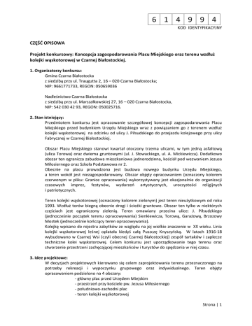 6 1 4 9 9 4 KOD IDENTYFIKACYJNY CZĘŚD OPISOWA Projekt konkursowy: Koncepcja zagospodarowania Placu Miejskiego oraz terenu wzdłuż kolejki wąskotorowej w Czarnej Białostockiej. 1. Organizatorzy konkursu: Gmina Czarna Białostocka z siedzibą przy ul. Traugutta 2, 16 – 020 Czarna Białostocka; NIP: 9661771733, REGON: 050659036 Nadleśnictwo Czarna Białostocka z siedzibą przy ul. Marszałkowskiej 27, 16 – 020 Czarna Białostocka, NIP: 542 030 42 93, REGON: 050025716. 2. Stan istniejący: Przedmiotem konkursu jest opracowanie szczegółowej koncepcji zagospodarowania Placu Miejskiego przed budynkiem Urzędu Miejskiego wraz z powiązaniem go z terenem wzdłuż kolejki wąskotorowej na odcinku od ulicy J. Piłsudskiego do przejazdu kolejowego przy ulicy Fabrycznej w Czarnej Białostockiej. Obszar Placu Miejskiego stanowi kwartał otoczony trzema ulicami, w tym jedną asfaltową (ulica Torowa) oraz dwiema gruntowymi (ul. J. Słowackiego, ul. A. Mickiewicza). Dodatkowo obszar ten ogranicza zabudowa mieszkaniowa jednorodzinna, kościół pod wezwaniem Jezusa Miłosiernego oraz Szkoła Podstawowa nr 2. Obecnie na placu prowadzona jest budowa nowego budynku Urzędu Miejskiego, a teren wokół jest niezagospodarowany. Obszar objęty opracowaniem (oznaczony kolorem czerwonym w pliku: Granice opracowania) wykorzystywany jest okazjonalnie do organizacji czasowych imprez, festynów, wydarzeo artystycznych, uroczystości religijnych i patriotycznych. Teren kolejki wąskotorowej (oznaczony kolorem zielonym) jest teren nieużytkowym od roku 1993. Wzdłuż torów biegną obecnie drogi i ścieżki gruntowe. Obszar ten tylko w niektórych częściach jest ograniczony zielenią. Teren omawiany przecina ulice: J. Piłsudzkiego (jednocześnie początek terenu opracowywania) Sienkiewicza, Torową, Garażową, Brzozowy Mostek (jednocześnie kooczący teren opracowywania). Kolejkę wpisano do rejestru zabytków ze względu na jej wielkie znaczenie w XX wieku. Linia kolejki wąskotorowej leśnej oplatała kiedyś całą Puszczę Knyszyoską. W latach 1916-18 wybudowano w Czarnej Wsi (czyli obecnej Czarnej Białostockiej) zespół tartaków i zaplecze techniczne kolei wąskotorowej. Celem konkursu jest uporządkowanie tego terenu oraz stworzenie przestrzeni zachęcającej mieszkaoców i turystów do spędzania w niej czasu. 3. Idee projektowe: W decyzjach projektowych kierowano się celem zaprojektowania terenu przeznaczonego na potrzeby rekreacji i wypoczynku grupowego oraz indywidualnego. Teren objęty opracowaniem podzielono na 4 obszary: - główny plac przed Urzędem Miejskim - przestrzeo przy kościele pw. Jezusa Miłosiernego - południowo-zachodni plac - teren kolejki wąskotorowej Strona | 1 6 1 4 9 9 4 KOD IDENTYFIKACYJNY Główny plac przed Urzędem Miejskim Teren placu oraz stanowiący jego integralną częśd budynek Urzędu Miejskiego będzie stanowił wizytówkę miasta Czarna Białostocka, dlatego teren ten zaprojektowano jako całkowicie utwardzony. Na rynku umieszczono kompozycję ławek i gazonów złożoną z modułów oraz podkreśloną innym materiałem w posadzce drewnem. Układ drewna położonego na ławkach jest równoległy do układu desek na elewacji Urzędu Miejskiego. Cała koncepcja jest podkreślona zmianą odcienia posadzki na ciemniejszy. Dodatkowo wyznaczono miejsce na scenę, która może byd lokalizowana w tym miejscu w trakcie ważnych wydarzeo. Koncepcja zakłada wykorzystanie zabytkowej kolejki do użytku mieszkaoców jako kawiarni. Na czas organizowanych wydarzeo będzie przesuwana na teren południowo-zachodniego placu opartego na siatce. Od strony południowej zaproponowano przestrzeo dla uczniów pobliskiej szkoły podstawowej, z możliwością wspólnego wypoczynku i prowadzenia zajęd oraz dyskusji na świeżym powietrzu. Zaprojektowano parking od strony wschodniej przy ulicy Słowackiego oraz parking dla pracowników Urzędu Miejskiego od strony ulicy Mickiewicza. Dodatkowo wprowadzono przestrzenie zielone oraz wykorzystano jasną kostkę granitową. Przy głównym placu zaproponowano szpaler drzew prowadzący do Placu Konstytucji 3 maja ulicą Torową, który podobnie jak projektowane założenie ma również prosty i geometryczny układ. Przestrzeo przy kościele pod wezwaniem Jezusa Miłosiernego Na przestrzeni po drugiej stronie placu zaplanowano fontannę z możliwością wykorzystania brodzika przez dzieci w okresie letnim. Dodatkowo zaplanowano układ ławek z gazonami na roślinnośd niską. Plac ten prowadzi na wschodnią częśd opracowywanego terenu. Południowo-zachodni plac Jest to propozycja stworzona na zasadzie ortogonalnej siatki z układem drzew i ławek. Podział siatki jest podkreślony zmianą odcienia posadzki na ciemniejszy. Teren kolejki wąskotorowej Projektowany teren kolejki wąskotorowej opiera się na wstędze torów zabytkowej kolejki z rozbudowanymi przestrzeniami przeznaczonymi na siłownie zewnętrzne, place zabaw oraz przestrzenie wypoczynkowe. Wzdłuż torów jest wyznaczona ścieżka pieszo-rowerowa. Cały obszar zachęca zarówno do spacerów jak i aktywnego wypoczynku. Wprowadzone układy ławek umożliwiają spacerowanie osób starszych oraz o ograniczonej zdolności ruchowej. Ponadto projekt nie przewiduje zmian w układzie terenu co umożliwia swobodne przemieszczanie się osób niepełnosprawnych. Dodatkową atrakcją są proponowane ciągi historyczne i rekreacyjne, które mają zachęcad do przebywania w tej przestrzeni. 4. Roboty przygotowawcze: Przewiduje się szereg prac przygotowawczych związanych z przebudową nawierzchni i ukształtowania terenu. Odnowienie nawierzchni chodnikowych oraz krawężników w obrębie inwestycji znajdującej się w centrum miasta i strefie reprezentacyjnej. Przewiduje się również Strona | 2 6 1 4 9 9 4 KOD IDENTYFIKACYJNY wyrównanie terenu i odsłonięcie zarośniętych torów kolejowych, które mają wyznaczad główny pas pieszy. 5. Projektowana mała architektura: Projekt na