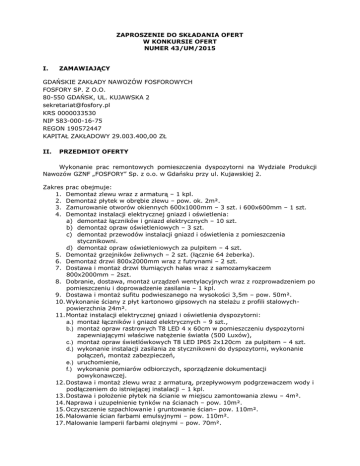 ZAPROSZENIE DO SKŁADANIA OFERT W KONKURSIE OFERT NUMER 43/UM/2015 I. ZAMAWIAJĄCY GDAŃSKIE ZAKŁADY NAWOZÓW FOSFOROWYCH FOSFORY SP. Z O.O. 80-550 GDAŃSK, UL. KUJAWSKA 2 [email protected] KRS 0000033530 NIP 583-000-16-75 REGON 190572447 KAPITAŁ ZAKŁADOWY 29.003.400,00 ZŁ II. PRZEDMIOT OFERTY Wykonanie prac remontowych pomieszczenia dyspozytorni na Wydziale Produkcji Nawozów GZNF „FOSFORY” Sp. z o.o. w Gdańsku przy ul. Kujawskiej 2. Zakres 1. 2. 3. 4. prac obejmuje: Demontaż zlewu wraz z armaturą – 1 kpl. Demontaż płytek w obrębie zlewu – pow. ok. 2m². Zamurowanie otworów okiennych 600x1000mm – 3 szt. i 600x600mm – 1 szt. Demontaż instalacji elektrycznej gniazd i oświetlenia: a) demontaż łączników i gniazd elektrycznych – 10 szt. b) demontaż opraw oświetleniowych – 3 szt. c) demontaż przewodów instalacji gniazd i oświetlenia z pomieszczenia stycznikowni. d) demontaż opraw oświetleniowych za pulpitem – 4 szt. 5. Demontaż grzejników żeliwnych – 2 szt. (łącznie 64 żeberka). 6. Demontaż drzwi 800x2000mm wraz z futrynami – 2 szt. 7. Dostawa i montaż drzwi tłumiących hałas wraz z samozamykaczem 800x2000mm – 2szt. 8. Dobranie, dostawa, montaż urządzeń wentylacyjnych wraz z rozprowadzeniem po pomieszczeniu i doprowadzenie zasilania – 1 kpl. 9. Dostawa i montaż sufitu podwieszanego na wysokości 3,5m – pow. 50m². 10. Wykonanie ściany z płyt kartonowo gipsowych na stelażu z profili stalowychpowierzchnia 24m². 11. Montaż instalacji elektrycznej gniazd i oświetlenia dyspozytorni: a.) montaż łączników i gniazd elektrycznych – 9 szt., b.) montaż opraw rastrowych T8 LED 4 x 60cm w pomieszczeniu dyspozytorni zapewniającymi właściwe natężenie światła (500 Luxów), c.) montaż opraw świetlówkowych T8 LED IP65 2x120cm za pulpitem – 4 szt. d.) wykonanie instalacji zasilania ze stycznikowni do dyspozytorni, wykonanie połączeń, montaż zabezpieczeń, e.) uruchomienie, f.) wykonanie pomiarów odbiorczych, sporządzenie dokumentacji powykonawczej. 12. Dostawa i montaż zlewu wraz z armaturą, przepływowym podgrzewaczem wody i podłączeniem do istniejącej instalacji – 1 kpl. 13. Dostawa i położenie płytek na ścianie w miejscu zamontowania zlewu – 4m². 14. Naprawa i uzupełnienie tynków na ścianach – pow. 10m². 15. Oczyszczenie szpachlowanie i gruntowanie ścian– pow. 110m². 16. Malowanie ścian farbami emulsyjnymi – pow. 110m². 17. Malowanie lamperii farbami olejnymi – pow. 70m². 18. Malowanie grzejników żeliwnych – 64 żeberka wraz z instalacją CO. 19. Montaż grzejników wraz z dostarczonym termostatem – 2 szt. Termin wykonania prac: w postoju remontowym - maj 2015 r. Oferenci muszą posiadać niezbędną wiedzę i doświadczenie oraz dysponować potencjałem technicznym i osobami uprawnionymi do wykonania zakresu prac. Do złożenia prawidłowej oferty konieczna jest wizyta w obiekcie na terenie GZNF „FOSFORY” Sp. z o.o. Materiały oraz sprzęt niezbędny do wykonania zakresu prac zapewnia wykonawca. Wszystkie odpady powstałe w wyniku prowadzenia prac należy wywieźć i odzyskać lub unieszkodliwić. III. INFORMACJE DOTYCZĄCE TERMINU I MIEJSCA SKŁADANIA OFERT Oferty należy składać w Kancelarii GZNF „FOSFORY” Sp. z o.o., 80-550 Gdańsk ul. Kujawska 2, budynek biurowca II piętro z dopiskiem „Oferta na wykonanie prac remontowych pomieszczenia dyspozytorni na Wydziale Produkcji Nawozów. Konkurs ofert nr 43/UM/2015”. Osobą uprawnioną do kontaktów z oferentami jest Pan Jarosław Malinowski tel. (58) 34 38 315, 669 600 415. Termin składania ofert upływa w dniu 22.04.2015 r. Za datę terminowego doręczenia oferty uważa się datę zarejestrowania oferty w Kancelarii GZNF „FOSFORY” Sp. z o.o. Oferty, które wpłyną po tym terminie nie będą rozpatrywane. IV. KRYTERIA OCENY SPEŁNIENIA DOSTAWCÓW/WYKONAWCÓW L.p. 1. 2. 3. 4. V. WARUNKÓW Kryteria Cena Czas realizacji Referencje Wiarygodność w ocenie członków Komisji WYMAGANYCH OD Znaczenie 70% 10% 10% 10% OFERTA POWINNA ZAWIERAĆ Szczegółowy zakres robót. Termin wykonania prac. Cenę ofertową. Warunki płatności. Warunki gwarancyjne. Informację o kwalifikacjach posiadanej kadry technicznej. Referencje lub informacje o wykonanych pracach podobnego typu. VI. WYMAGANE ZAŁĄCZNIKI Kserokopia dokumentu rejestrowego oferenta. Kserokopia numeru NIP, REGON. Dokumenty pozwalające ocenić wiarygodność techniczną i ekonomiczną oferenta (np. kadra techniczna, sprzęt itp.). Oświadczenie o sytuacji finansowej zapewniającej wykonanie zamówienia. Oświadczenie o braku wszczęcia w stosunku do oferenta postępowania upadłościowego lub układowego. Oświadczenie o nie zaleganiu z uiszczaniem podatków, opłat lub składek na ubezpieczenia społeczne. VII. UWAGI KOŃCOWE Wszystkie dokumenty ofertowe muszą być podpisane przez osoby uprawnione do reprezentowania firmy. W przypadku zawarcia umowy deklarowane parametry rozliczeń nie będą podlegały zmianie przez cały jej okres działania. W przypadku wątpliwości lub koniecznych uzupełnień po otwarciu ofert zastrzega się prawo do przeprowadzenia rozmów uzupełniających i ewentualnych negocjacji lub do zamknięcia konkursu ofert bez dokonania wyboru którejkolwiek z ofert bez podania przyczyny.