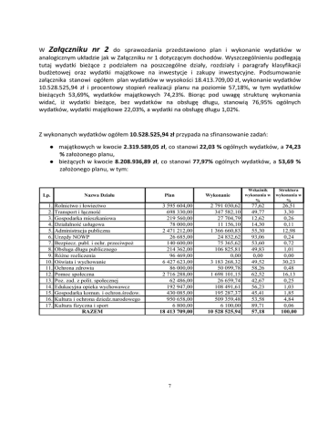 W Załączniku nr 2 do sprawozdania przedstawiono plan i wykonanie wydatków w analogicznym układzie jak w Załączniku nr 1 dotyczącym dochodów. Wyszczególnieniu podlegają tutaj wydatki bieżące z podziałem na poszczególne działy, rozdziały i paragrafy klasyfikacji budżetowej oraz wydatki majątkowe na inwestycje i zakupy inwestycyjne. Podsumowanie załącznika stanowi ogółem plan wydatków w wysokości 18.413.709,00 zł, wykonanie wydatków 10.528.525,94 zł i procentowy stopień realizacji planu na poziomie 57,18%, w tym wydatków bieżących 53,69%, wydatków majątkowych 74,23%. Biorąc pod uwagę strukturę wykonania widać, iż wydatki bieżące, bez wydatków na obsługę długu, stanowią 76,95% ogólnych wydatków, wydatki majątkowe 22,03%, a wydatki na obsługę długu 1,02%. Z wykonanych wydatków ogółem 10.528.525,94 zł przypada na sfinansowanie zadań: majątkowych w kwocie 2.319.589,05 zł, co stanowi 22,03 % ogólnych wydatków, a 74,23 % założonego planu, bieżących w kwocie 8.208.936,89 zł, co stanowi 77,97% ogólnych wydatków, a 53,69 % założonego planu, w tym: Lp. 1. 2. 3. 4. 5. 6. 7. 8. 9. 10. 11. 12. 13. 14. 15. 16. 17. Nazwa Działu Rolnictwo i łowiectwo Transport i łączność Gospodarka mieszkaniowa Działalność usługowa Administracja publiczna Urzędy NOWP Bezpiecz. publ. i ochr. przeciwpoż Obsługa długu publicznego Różne rozliczenia Oświata i wychowanie Ochrona zdrowia Pomoc społeczna Poz. zad. z polit. społecznej Edukacyjna opieka wychowawcz Gospodarka komun. i ochron.środow. Kultura i ochrona dziedz.narodowego Kultura fizyczna i sport RAZEM Plan 3 595 604,00 698 330,00 219 560,00 78 000,00 2 471 212,00 26 685,00 140 600,00 214 362,00 96 469,00 6 427 623,00 86 000,00 2 716 288,00 62 486,00 192 947,00 430 085,00 950 658,00 6 800,00 18 413 709,00 7 Wykonanie 2 791 030,62 347 582,10 27 704,79 11 156,10 1 366 660,83 24 832,62 75 365,62 106 825,81 0,00 3 183 268,32 50 099,78 1 698 101,15 26 659,74 108 491,61 195 287,37 509 359,48 6 100,00 10 528 525,94 Wskaźnik wykonania w % Struktura wykonania w % 77,62 49,77 12,62 14,30 55,30 93,06 53,60 49,83 0,00 49,52 58,26 62,52 42,67 56,23 45,41 53,58 89,71 57,18 26,51 3,30 0,26 0,11 12,98 0,24 0,72 1,01 0,00 30,23 0,48 16,13 0,25 1,03 1,85 4,84 0,06 100,00 REALIZACJA WYDATKÓW (wydatki wg działów klasyfikacji budżetowej): ROLNICTWO I ŁOWIECTWO Plan – 3.595.604,00 zł, wykonanie – 2.791.030,62 zł, Melioracje wodne Plan- 54.127,00 zł ; wykonanie – 9.737,88 zł, w tym: 8.871,69 zł - wynagrodzenia osobowe wraz z pochodnymi 866,19 zł - pozostałe wydatki (badania lekarskie, ekwiwalent za odzież, herbata, mydło) W I półroczu 2015 r. do prac melioracyjnych zatrudniono 3 pracowników w ramach robót publicznych. Infrastruktura wodociągowa i sanitacyjna wsi Plan – 3.151.387,00 zł, wykonanie – 2.502.350,23 zł, w tym: Oczyszczalnia ścieków i sieć kanalizacyjna: Wydatki bieżące: Plan 335.882,00 zł Wykonanie 139.665,09 zł, z tego: 896,62 zł - wydatki osobowe niezaliczane do wynagrodzeń (ręczniki, herbata, mydło, odzież robocza, ekwiwalent za pranie) 39.583,97 zł - wynagrodzenia osobowe 7.269,91 zł - pochodne od wynagrodzeń 3.509,77 zł - zakup materiałów i wyposażenia (paliwo, art. przemysłowe, elektryczne) 51.718,63 zł - zakup energii elektrycznej 25.563,91 zł - zakup usług pozostałych (monitoring, udrażnianie kanalizacji, badanie ścieków, wywóz osadu, przegląd obiektu) 816,68 zł - zakup usług telekomunikacyjnych 1.909,75 zł - podróże służbowe krajowe (ryczałty samochodowe) 6.754,95 zł - różne opłaty i składki (opłata za umieszczenie urządzeń w pasie drogi) 1.640,90 zł - odpisy na ZFŚS Liczba pracowników – 2 Liczba pracowników w przeliczeniu na etaty – 2 8 Hydrofornia i sieć wodociągowa: Wydatki bieżące: Plan 379.910,00 zł Wykonanie 185.721,74 zł, z tego: 571,93 zł - wydatki osobowe (ręczniki, mydło, herbata, odzież robocza, ekwiwalent za pranie odzieży) 40.062,35 zł - wynagrodzenia osobowe 7.793,39 zł - pochodne od wynagrodzeń 23.905,99 zł - zakup materiałów i wyposażenia (paliwo, art. hydrauliczne, wodomierze, art. przemysłowe) 85.643,97 zł - zakup energii elektrycznej 12.540,23 zł - zakup usług pozostałych (monitoring, usługa koparki, badanie wody, przegląd obiektu) 644,46 zł - zakup usług telekomunikacyjnych 3.055,60 zł - podróże służbowe krajowe (ryczałty samochodowe) 9.726,18 zł - różne opłaty i składki (opłata za umieszczenie urządzeń w pasie drogi) 1.777,64 zł - odpisy na ZFŚS Liczba pracowników – 2 Liczba pracowników w przeliczeniu na etaty – 2 Na wydatki i zakupy inwestycyjne zaplanowano kwotę 2.434.095,00 zł, z czego wydatkowano kwotę 2.176.963,40 zł, z tego: - 1.943,94 zł – Budowa kanalizacji sanitarnej w miejscowości Kopytkowo (wykonanie przyłącza kablowego do przepompowni, wydzielenie działki pod przepompownie); - 1.766.893,61 zł – Budowa kolektora zrzutowego z oczyszczalni ścieków w Kopytkowie do rzeki Janka (roboty budowlane, nadzór inwestorski, opłaty za zajęcie pasa, operat szacunkowy); - 408.125,85 zł – Budowa sieci wodociągowej w miejscowości Stara Jania oraz budowa kanalizacji sanitarnej w Smętowie Granicznym ul. Okrężna (roboty budowlane, inspektor nadzoru, opłaty za zajęcie pasa); Izby rolnicze Plan – 19.061,00 zł, wykonanie – 8.443,64 zł Kwotę 8.443,64 zł przeznaczono na obowiązkowe opłacenie składki w wysokości 2% podatku rolnego. Wyłączenie z produkcji gruntów rolnych Plan – 100.000,00 zł, wykonanie – 470,00 zł Kwotę w wysokości 470,00 zł wydatkowano na sporządzenie dokumentacji kosztorysowej na realizację inwestycji pn. ”Modernizacji drogi transportu rolnego Kościelna Jania – Bobrowiec etap V”. Na realizację zadania złożono wniosek o dofinansowanie z Terenowego Funduszu Ochrony Gruntów Rolnych. W miesiącu lipcu podpisano umowę o dofinansowanie zadania w 9 wysokości 71.000,00 zł.