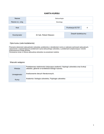 KARTA KURSU Nazwa Seksuologia Nazwa w j. ang. Sexology Kod Punktacja ECTS* Koordynator Dr hab. Robert Stawarz 4 Zespół dydaktyczny Opis kursu (cele kształcenia) Poznanie złożoności seksualności człowieka, problemów z określeniem normy w zakresie zachowań seksualnych, zapoznanie z najważniejszymi problemami życia seksualnego człowieka, z problemami antykoncepcji i chorób przenoszonych drogą płciową. Omówienie zmian w sferze seksualnej człowieka na przestrzeni wieków Warunki wstępne Wiedza Umiejętności Kursy Podstawowe wiadomości dotyczące anatomii i fizjologii człowieka oraz funkcji układów, głównie w kontekście biologii rozrodu. Analizowanie danych literaturowych, Anatomia i biologia człowieka, Fizjologia człowieka 1 Efekty kształcenia Efekt kształcenia dla kursu Wiedza Umiejętności Odniesienie do efektów kierunkowych W01 Zna fazy rozwoju wiedzy seksuologicznej. K_W11 W02 Wymienia najważniejsze postaci rozwoju seksuologii. K_W11 W03 Posiada wiedzę na temat podstawowych praw rozwoju sfery emocjonalno-seksualnej człowieka K_W10 W04 Klasyfikuje dewiacje i zaburzenia seksualne. K_W11 W05 Wymienia rodzaje środków antykoncepcyjnych. K_W10 W06 Wylicza kryteria normy. K_W11 W07 Ma wiedzę dotycząca higieny życia płciowego K_W10 W08 Zna podstawowe pojęcia psychofizjologii seksualnej oraz modele seksualności. K_W10 W09 Zna zjawiska fizjologiczne K_W09, K_W10 W10 Ma wiedzę na temat biologii rozwoju człowieka K_W10 W11 Charakteryzuje czynniki rozwoju człowieka K_W09 W12 Klasyfikuje przyczyny powstawania zaburzeń sfery emocjonalno-seksualnej K_W11 Efekt kształcenia dla kursu Odniesienie do efektów kierunkowych 2 U01 Objaśnia etiologię zaburzeń seksualnych. K_U09 U02 Rozpoznaje szczegóły budowy narządów na modelu K_U03 i rysunku. U03 Charakteryzuje budowę i funkcje narządów. K_U09 U04 Analizuje funkcje poszczególnych układów i ich działanie K_U09 U05 Rozróżnia rodzaje popędu płciowego K_U10 W06 Charakteryzuje podstawowe prawa rozwoju sfery emocjonalno-seksualnej człowieka K_U09, K_U10 W07 Prawidłowo charakteryzuje dewiacje i zaburzenia seksualne. K_U10 W08 Charakteryzuje poszczególne rodzaje środków antykoncepcyjnych. K_U03 W09 Charakteryzuje choroby przenoszone drogą płciową K_U10 W10 Opisuje różnego rodzaju reakcje seksualne i objaśnia ich uwarunkowania fizjologiczne. K_U09, K_U10 U11 Posługuje się fachową literaturą naukową dotyczącą K_U03 anatomii biologii człowieka U12 Przygotowuje samodzielnie prezentacje dotyczące seksuologii i chorób przenoszonych drogą płciową. K_U05, K_U12 U13 Czyta ze zrozumieniem naukowe teksty dotyczące seksuologii K_U04 Efekt kształcenia dla kursu Kompetencje społeczne Odniesienie do efektów kierunkowych K01 Rozumie potrzebę prawidłowej higieny układów ciała. K_K04 K02 Rozumie zasady skutecznego uczenia się. K_K01 3 Organizacja Forma zajęć Ćwiczenia w grupach Wykład (W) A Liczba godzin 10 K L S P E 10 Opis metod prowadzenia zajęć Wykłady: Wykłady wprowadzające, rozwijające i podsumowujące zagadnienia oraz systematyzujące pojęcia. Prezentacje multimedialne ilustrujące zagadnienie. Ćwiczenia: Prezentacje multimedialne ilustrujące zagadnienie, praca indywidualna, referaty. Obserwacja modeli. Prezentacja multimedialna Egzamin pisemny X X X X X X X X X X X X X X X X X X X X X X X Egzamin ustny X X X X X X X X X X X X X X X X X X X X X X X Praca pisemna (esej) X X X X X X X X X X X X X X X X X X X X X X X Referat Udział w dyskusji Praca laboratoryjna Zajęcia terenowe Ćwiczenia w szkole Projekt grupowy X X X X X X X X X X X X X X X X X X X X X X X Projekt indywidualny W01 W02 W03 W04 W05 W06 W07 W08 W09 W10 W11 W12 U01 U02 U03 U04 U05 U06 U07 U08 U09 U10 U11 Gry dydaktyczne E – learning Formy sprawdzania efektów kształcenia X X X X X X X X X X X X X X X X X X X X X X X 4 U12 U13 K01 K02 X X X X Kryteria oceny X X X X X X X X X X X X Zaliczenie na podstawie testu. Uwagi Treści merytoryczne (wykaz tematów) Zakres seksuologii. Seksualność człowieka w mitologii i historii. Natura popędu seksualnego u człowieka. Rozwój emocjonalno-seksualny człowieka. Psychospołeczne podłoże seksualności. Psychospołeczne problemy seksualności: rewolucja seksualna, uspołecznienie seksualności, pornografia. Podstawowe pojęcia psychofizjologii seksualnej oraz modele seksualności. Psychofizjologia seksualności. Reakcje seksualne i ich uwarunkowania fizjologiczne. Metody i środki antykoncepcyjne. Choroby przenoszone drogą płciową. Klasyfikacja zaburzeń seksualnych. Dysfunkcje seksualne — podstawowe pojęcia i podział. Dewiacje seksualne. Etiopatogeneza dewiacji seksualnych. Homoseksualizm. Transseksualizm, zespół dezaprobaty płci, kazirodztwo. Odchylenia seksualne patologiczne (zboczenia płciowe). Objawowe dysfunkcje i dewiacje seksualne. Psychofizjologia seksualna w ujęciu psychoanalitycznym. Wykaz literatury podstawowej Lew-Starowicz, Z., Skrzypulec V. Podstawy seksuologii. Wydawnictwo Lekarskie PZWL. 2010 Imieliński K. Seksiatria T I, T II. Warszawa 1990. Brook Ch., Marshall N. Podstawy endokrynologii. Wrocław 2000 Wykaz literatury uzupełniającej Imieliński K. Seksuologia kulturowa. Warszawa 1984. Skałba P. Endokrynologia ginekologiczna. Warszawa 1998. Lew-Starowicz Z. Seksuologia sądowa. Warszawa 2000 Wydawnictwa periodyczne seksuologiczne i poruszające problemy seksuologiczne: Problemy 5 rodziny. Materiały z konferencji seksuologicznych. Psychoterapia. International Journal of Sexuology (ang.). Wiadomości lekarskie. Psychiatria Polska, Sexuologie (niem.). Bilans godzinowy zgodny z CNPS (Całkowity Nakład Pracy Studenta) Ilość godzin w kontakcie z prowadzącymi Ilość godzin pracy studenta bez kontaktu z prowadzącymi Wykład 10 Konwersatorium (ćwiczenia, laboratorium itd.) 10 Pozostałe godziny kontaktu studenta z prowadzącym Lektura w ramach przygotowania do zajęć 10 Przygotowanie krótkiej pracy pisemnej lub referatu po