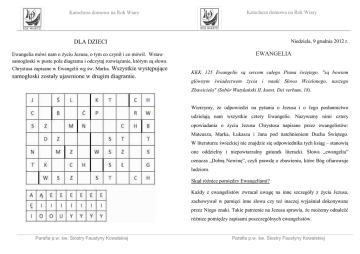 Katecheza domowa na Rok Wiary Katecheza domowa na Rok Wiary Niedziela, 9 grudnia 2012 r. DLA DZIECI Ewangelia mówi nam o życiu Jezusa, o tym co czynił i co mówił. Wstaw samogłoski w puste pola diagramu i odczytaj rozwiązanie, którym są słowa Chrystusa zapisane w Ewangelii wg św. Marka. Wszystkie występujące samogłoski zostały ujawnione w drugim diagramie. EWANGELIA KKK 125 Ewangelie są sercem całego Pisma świętego, "są bowiem głównym świadectwem życia i nauki Słowa Wcielonego, naszego Zbawiciela" (Sobór Watykański II, konst. Dei verbum, 18). Wierzymy, że odpowiedzi na pytania o Jezusa i o Jego posłannictwo udzielają nam wszystkie cztery Ewangelie. Nazywamy nimi cztery opowiadania o życiu Jezusa Chrystusa napisane przez ewangelistów: Mateusza, Marka, Łukasza i Jana pod natchnieniem Ducha Świętego. W literaturze świeckiej nie znajdzie się odpowiednika tych ksiąg – stanowią one oddzielny i niepowtarzalny gatunek literacki. Słowa „ewangelia” oznacza „Dobrą Nowinę”, czyli prawdę o zbawieniu, które Bóg ofiarowuje ludziom. Skąd różnice pomiędzy Ewangeliami? Każdy z ewangelistów zwracał uwagę na inne szczegóły z życia Jezusa, zachowywał w pamięci inne słowa czy też inaczej wyjaśniał dokonywane przez Niego znaki. Takie patrzenie na Jezusa sprawia, że możemy odnaleźć różnice pomiędzy zapisami poszczególnych ewangelistów. Parafia p.w. św. Siostry Faustyny Kowalskiej Parafia p.w. św. Siostry Faustyny Kowalskiej Katecheza domowa na Rok Wiary Katecheza domowa na Rok Wiary Ile jest Ewangelii? Ewangelia Judasza? Tomasza? Ewangelia, Dobra Nowina o Jezusie Chrystusie jest tylko jedna, lecz Kiedy słyszymy słowo „ewangelia”, od razu myślimy o czterech w czterech spojrzeniach – jak portret Jezusa tworzony przez różnych Ewangeliach, które stanowią część Nowego Testamentu. Może nas więc malarzy. Każdy z Ewangelistów zwracał uwagę na inne cechy naszego zaniepokoić, że pojawia się jakieś dzieło noszące ten tytuł, a jednocześnie Pana. Dlatego nie można odrzucić żadnego spojrzenia ani wybrać jednego przypisane jednemu z Apostołów. Tymczasem „ewangelia” w sensie z nich. ogólnym jest terminem technicznym, określającym każde opowiadanie Powstawanie Ewangelii o życiu Jezusa Chrystusa. Dlatego też możemy tak nazywać nie tylko cztery W formowaniu Ewangelii można wyróżnić trzy etapy: Ewangelie kanoniczne, ale też pokaźną grupę pism, które do kanonu 1. Życie i nauczanie Jezusa. Kościół stanowczo utrzymuje, że cztery Nowego Testamentu nigdy nie weszły. Ewangelie, "których historyczność bez wahania stwierdza, podają wiernie to, co Jezus, Syn Boży, żyjąc wśród ludzi, dla wiecznego ich zbawienia Ludzie szukający rozgłosu przedstawiają ewangelie Tomasza i Judasza jako pisma ściśle ukrywane przez Watykan, w których znajdują rzeczywiście uczynił i czego uczył aż do dnia, w którym został wzięty do nieba". się 2. Tradycja ustna. "Apostołowie po wniebowstąpieniu Pana to, co On Tymczasem teksty te są szeroko dostępne dla każdego i nie zawierają powiedział i czynił, przekazali słuchaczom w pełniejszym zrozumieniu, w sobie niczego, co mogłoby podważyć kościelną naukę. prawdy mogące podważyć prawdziwość nauczania Kościoła. którym cieszyli się, pouczeni chwalebnymi wydarzeniami życia Jezusa oraz światłem Ducha Prawdy oświeceni". 3. Spisanie Ewangelii. "Święci autorzy napisali cztery Ewangelie, wybierając niektóre z wielu wiadomości przekazanych ustnie lub pisemnie; ujmując W czasie moich modlitw zatrzymuję się przede wszystkim przy Ewangelii; w niej znajduję wszystko, co konieczne dla mojej biednej duszy. Św. Teresa od Dzieciątka Jezus pewne rzeczy syntetycznie lub objaśniając, przy uwzględnieniu sytuacji Kościołów; zachowując wreszcie formę przepowiadania, ale zawsze tak, aby nam przekazać szczerą prawdę o Jezusie" (KKK 126) Nie bójmy się w tym wyjątkowym czasie Adwentu sięgnąć po Pismo Święte i zagłębić się w słowa Ewangelii. Jezus Chrystus wychodzi nam naprzeciw. Pragnie spotkania z nami. Odnajdźmy Go w Jego słowie. Parafia p.w. św. Siostry Faustyny Kowalskiej Parafia p.w. św. Siostry Faustyny Kowalskiej