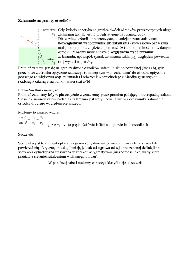 Załamanie na granicy ośrodków Gdy światło napotyka na granice dwóch ośrodków przezroczystych ulega załamaniu tak jak jest to przedstawione na rysunku obok. Dla każdego ośrodka przezroczystego istnieje pewna stała zwana bezwzględnym współczynnikiem załamania (zwyczajowo oznaczana małą literą n), n=c/v; gdzie c- prędkość światła, v-prędkość fali w danym ośrodku. Możemy mówić także o względnym współczynniku załamania, np. współczynnik załamania szkła (n2) względem powietrza (n1) wynosi n12=n2/n1. Promień załamujący się na granicy dwóch ośrodków załamuje się do normalnej (kąt a>b), gdy przechodzi z ośrodka optycznie rzadszego (o mniejszym wsp. załamania) do ośrodka optycznie gęstszego (o większym wsp. załamania) i odwrotnie - przechodząc z ośrodka gęstszego do rzadszego załamuje się od normalnej (kąt a<b) Prawo Snelliusa mówi, że: Promień załamany leży w płaszczyźnie wyznaczonej przez promień padający i prostopadłą padania. Stosunek sinusów kątów padania i załamania jest stały i nosi nazwę współczynnika załamania ośrodka drugiego względem pierwszego. Możemy to zapisać wzorem: ; gdzie v1 i v1 to prędkości światła/fali w odpowiednich ośrodkach. Soczewki Soczewka jest to element optyczny ograniczony dwiema powierzchniami sferycznymi lub powierzchnią sferyczną i płaską. Istnieją jednak odstępstwa od tej uproszczonej definicji np. soczewka cylindryczna stosowana w korekcji astygmatyzmu (niezborności oka, wady która przejawia się zniekształceniem widzianego obrazu). W poniższej tabeli możemy zobaczyć klasyfikacje soczewek Równanie soczewki przedstawia się następująco: , gdzie n2 to współczynnik załamania materiału z jakiego wykonano soczewkę, n1 współczynnik załamania ośrodka w jakim znajduje się soczewka (dla powietrza uznaje się, że wynosi 1, w rzeczywistości tylko w próżni ten współczynnik będzie wynosił dokładnie 1), R1 - promień pierwszej krzywizny, R2 - promień drugiej krzywizny. Jeśli krzywizna jest wypukła to przyjmuje się, że R>0 natomiast dla krzywizny wklęsłej przyjmujemy R<0. Równanie soczewki możemy przedstawiać również w skróconej formie: , gdzie f - ogniskowa, x - odległość przedmiotu, y - odległość obrazu. Należy pamiętać, że jeżeli obraz powstaje po tej samej stronie, gdzie umieszczony jest przedmiot mówimy o obrazie pozornym. W związku z tym odległość y będzie mniejsza od 0, co przy wyliczeniach z tego wzoru należy uwzględnić zapisując przed wartością y minus. Podobnie jak przy zwierciadłach tutaj również mamy do czynienia z powiększeniem. Wzór na powiększenie przedstawia się następująco: W przypadku soczewek możemy mówić o zdolności skupiającej. Zdolność skupiająca jest odwrotnością ogniskowej: Jednostką ogniskowej jest dioptria ( [1D]=[1/m] ). Jeżeli zdolność skupiająca soczewki jest większa od zera to soczewka jest soczewką skupiającą, a w przypadku gdy Z<0 jest to soczewka rozpraszająca. Należy jednak pamiętać, że zdolność skupiająca soczewki zmienia się w zalezności od wsp. załamania ośrodka, w któtrym znajduje się soczewka. Tak więc soczewka, która jest skupiająca w powietrzu może okazać się rozpraszającą w wodzie. Konstruując obrazy przyjmujemy następujące symbole dla soczewki: skupiającej rozpraszającej Cechy obrazów zostaną szczegółowo omówione w dalszych punktach. Soczewka skupiająca W tym punkcie skupimy się na przedstawieniu konstrukcji i cech obrazu otrzymanego a pomocą soczewki skupiającej. Położenie przedmiotu: 0<x<f Cechy obrazu: - pozorny; utworzony przez przecięcie przedłużeń promieni świetlnych - prosty, czyli nie odwrócony - powiększony; p>1 Odległość obrazu: - y<0 Położenie przedmiotu: x=f Cechy obrazu: - brak; obraz nie powstał. Promienie ani ich przedłużenia nie przetną się, ponieważ są do siebie równoległe. Odległość obrazu: - obraz nie powstał Położenie przedmiotu: f<x<2f Cechy obrazu: - rzeczywisty; utworzony przez przecięcie promieni świetlnych - odwrócony - powiększony; p>1 Odległość obrazu: - y>2f Położenie przedmiotu: x=2f Cechy obrazu: - rzeczywisty; utworzony przez przecięcie promieni świetlnych - odwrócony - niepowiększony - rzeczywistych rozmiarów; p=1 Odległość obrazu: - y=2f Położenie przedmiotu: x>2f Cechy obrazu: - rzeczywisty; utworzony przez przecięcie promieni świetlnych - odwrócony - pomniejszony; p<1 Odległość obrazu: - f<y<2f Soczewka rozpraszająca W tym punkcie skupimy się na przedstawieniu konstrukcji i cech obrazu otrzymanego a pomocą soczewki rozpraszającej. W przypadku soczewki rozpraszającej cechy obrazu zawsze są identyczne bez względu na odległość przedmiotu od soczewki (naturalnie wartość np. pomniejszenia ulega zmianie wraz ze zmianą odległości, jednak cechą obrazu zawsze będzie to, że jest pomniejszony; p<1) Cechy obrazu: - zawsze pozorny; utworzony przez przecięcie promienia świetlnego i przedłużenia promienia świetlnego - zawsze prosty, czyli nieodwrócony - zawsze pomniejszony; p<1 Odległość obrazu: - obraz powstaje zawsze w odległości -f<y<0 Układ optyczny soczewka-soczewka Układ optyczny soczewka-soczewka jak sama nazwa wskazuje składa się z dwóch soczewek. Na rysunku poniżej przedstawiliśmy przykładowy układ składający się z soczewki skupiającej i rozpraszającej. Zdolność skupiająca takiego układu jest sumą zdolności skupiających wszystkich jego elementów. W tym przypadku: Zu=Z1+Z2