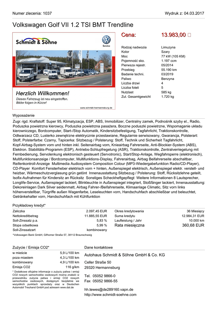Numer zlecenia: 1037 Wydruk z: 04.03.2017 Volkswagen Golf VII 1.2 TSI BMT Trendline Cena: 13.983,00 Rodzaj nadwozia Kolor Moc Pojemność sko. Pierwsza rejestr. Przebieg Badanie techni. Paliwo Liczba drzwi Liczba foteli Nutzlast Zul. Gesamtgewicht Limuzyna Szary 77 kW (105 KM) 1.197 ccm 05/2014 55.190 km 03/2019 Benzyna 4 5 585 kg 1.720 kg Wyposażenie Zugr.-lgd. Kraftstoff: Super 95, Klimatyzacja, ESP, ABS, Immobilizer, Centralny zamek, Podnośnik szyby el., Radio, Poduszka powietrzna kierowcy, Poduszka powietrzna pasażera, Boczne poduszki powietrzne, Wspomaganie układu kierowniczego, Bordcomputer, Start-/Stop Automatik, Kindersitzbefestigung, Tagfahrlicht, Traktionskontrolle, Odtwarzacz CD, Lusterko zewnętrzne elektrycznie przestawiane, Regularnie serwisowany, Gwarancja, Polsterart: Stoff, Polsterfarbe: Czarny, Tapicerka: Sitzbezug / Polsterung: Stoff, Technik und Sicherheit Tagfahrlicht, Kopf-Airbag-System vorn und hinten inkl. Seitenairbag vorn, Knieairbag Fahrerseite, Anti-Blockier-System (ABS), Elektron. Stabilitäts-Programm (ESP), Antriebs-Schlupfregelung (ASR), Traktionskontrolle, Zentralverriegelung mit Fernbedienung, Servolenkung elektronisch gesteuert (Servotronic), Start/Stop-Anlage, Wegfahrsperre (elektronisch), Multifunktionsanzeige / Bordcomputer, Multifunktions-Display, Fahrerairbag, Airbag Beifahrerseite abschaltbar, Reifenkontroll-Anzeige Multimedia Audiosystem Composition Colour (MP3-Wiedergabefunktion Radio/CD-Player), CD-Player Komfort Fensterheber elektrisch vorn + hinten, Außenspiegel elektrisch, Außenspiegel elektr. verstell- und heizbar, Wärmeschutzverglasung grün getönt Innenausstattung Sitzbezug / Polsterung: Stoff, Rücksitzlehne geteilt, Isofix-Aufnahmen für Kindersitz an Rücksitz Sonstiges Scheckheftgepflegt Weitere Informationen 8 Lautsprecher, Longlife-Service, Außenspiegel lackiert, Blinkleuchte in Außenspiegel integriert, Stoßfänger lackiert, Innenausstattung: Dekoreinlagen Dark Silver seidenmatt, Airbag Fahrer-/Beifahrerseite, Klimaanlage Climatic, Sitz vorn links höhenverstellbar, Türgriffe außen Wagenfarbe, Leseleuchten vorn, Handschuhfach abschließbar und beleuchtet, Getränkehalter vorn, Handschuhfach mit Kühlfunktion Przykładowy kredyt* Zaliczka Nettokreditbetrag Soll-Zinssatz p.a. Stopa odsetkowa Soll-Zinssatzart 2.097,45 EUR 11.885,55 EUR 5,83 % 5,99 % kombinowany Okres kredytowania Suma kredytu Laufleistung / Jahr 36 Miesięcy 12.984,31 EUR 10.000 km Rata miesięczna 360,68 EUR *Volkswagen Bank GmbH, Gifhorner Straße 57, 38112 Braunschweig Zużycie / Emisja CO2* w mieście poza miastem kombinowany Emisja CO2 Dane kontaktowe 5,9 L/100 km 4,3 L/100 km 4,9 L/100 km 116 g/km * Dodatkowe oficjalne informacje o zużyciu paliwa i emisji CO2 nowych samochodów osobowych można znaleźć w przewodniku zużycia paliwa i emisji CO2 nowych samochodów osobowych, dostępnym bezpłatnie we wszystkich punktach sprzedaży oraz w Deutschen Automobil Treuhand GmbH pod adresem www.dat.de Autohaus Schmidt & Söhne GmbH & Co. KG Celler Straße 50 29320 Hermannsburg Tel. 05052 9866-0 Fax 05052 9866-55 [email protected] http://www.schmidt-soehne.com Numer zlecenia: 1037 Volkswagen Golf VII 1.2 TSI BMT Trendline Wydruk z: 04.03.2017