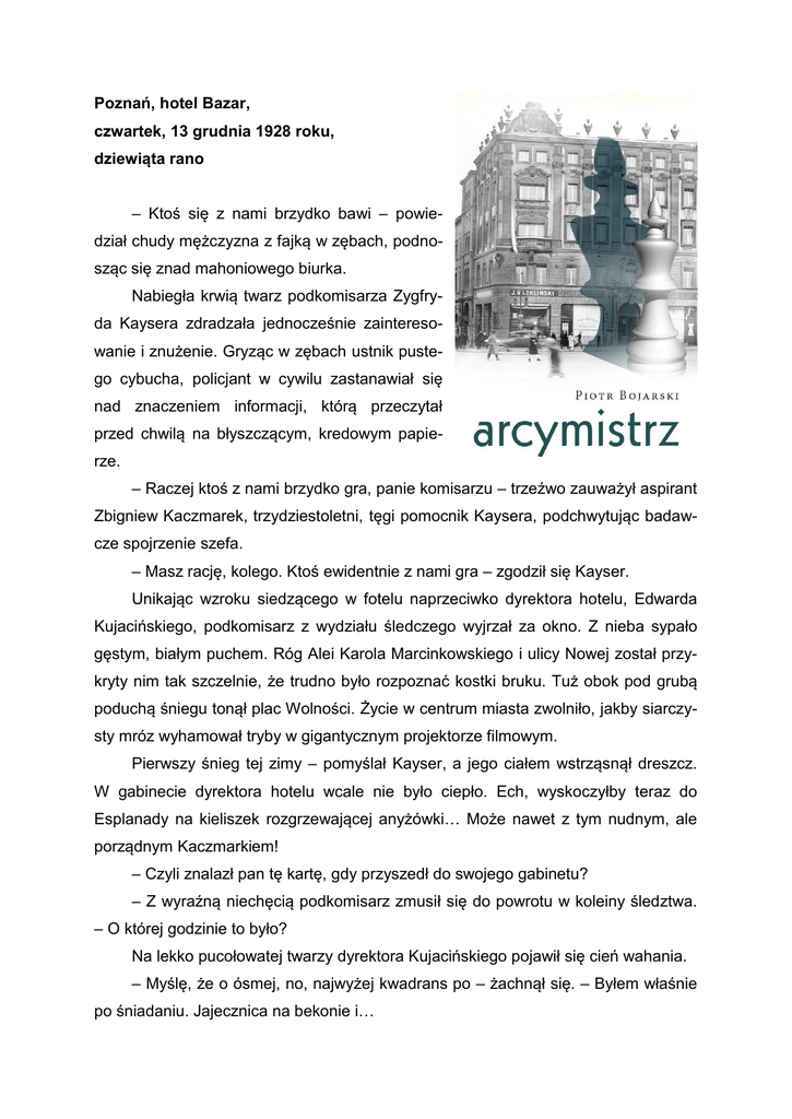 Poznań, hotel Bazar, czwartek, 13 grudnia 1928 roku, dziewiąta rano – Ktoś się z nami brzydko bawi – powiedział chudy mężczyzna z fajką w zębach, podnosząc się znad mahoniowego biurka. Nabiegła krwią twarz podkomisarza Zygfryda Kaysera zdradzała jednocześnie zainteresowanie i znużenie. Gryząc w zębach ustnik pustego cybucha, policjant w cywilu zastanawiał się nad znaczeniem informacji, którą przeczytał przed chwilą na błyszczącym, kredowym papierze. – Raczej ktoś z nami brzydko gra, panie komisarzu – trzeźwo zauważył aspirant Zbigniew Kaczmarek, trzydziestoletni, tęgi pomocnik Kaysera, podchwytując badawcze spojrzenie szefa. – Masz rację, kolego. Ktoś ewidentnie z nami gra – zgodził się Kayser. Unikając wzroku siedzącego w fotelu naprzeciwko dyrektora hotelu, Edwarda Kujacińskiego, podkomisarz z wydziału śledczego wyjrzał za okno. Z nieba sypało gęstym, białym puchem. Róg Alei Karola Marcinkowskiego i ulicy Nowej został przykryty nim tak szczelnie, że trudno było rozpoznać kostki bruku. Tuż obok pod grubą poduchą śniegu tonął plac Wolności. Życie w centrum miasta zwolniło, jakby siarczysty mróz wyhamował tryby w gigantycznym projektorze filmowym. Pierwszy śnieg tej zimy – pomyślał Kayser, a jego ciałem wstrząsnął dreszcz. W gabinecie dyrektora hotelu wcale nie było ciepło. Ech, wyskoczyłby teraz do Esplanady na kieliszek rozgrzewającej anyżówki… Może nawet z tym nudnym, ale porządnym Kaczmarkiem! – Czyli znalazł pan tę kartę, gdy przyszedł do swojego gabinetu? – Z wyraźną niechęcią podkomisarz zmusił się do powrotu w koleiny śledztwa. – O której godzinie to było? Na lekko pucołowatej twarzy dyrektora Kujacińskiego pojawił się cień wahania. – Myślę, że o ósmej, no, najwyżej kwadrans po – żachnął się. – Byłem właśnie po śniadaniu. Jajecznica na bekonie i… – Nie żądamy szczegółów pańskiego menu – uśmiechnął się cierpko Kayser. – Co było dalej? Dyrektor Bazaru poruszył się zniecierpliwiony w fotelu. Szokujące wydarzenia poranka mocno kontrastowały z powolnym działaniem policji. – Mówiłem już przecież panom… Jak zwykle podszedłem do mojego biurka, żeby zabrać się do rachunków, których nie zdążyłem rozliczyć wczoraj wieczorem. Panowie rozumiecie,wczoraj mieliśmy zamieszanie z tą tablicą pamiątkową poświęconą Paderewskiemu. Było co robić, duże zamieszanie… Sami panowie rozumiecie. Usiadłem w fotelu, z którego pan właśnie wstał, i wtedy zobaczyłem to… Wzrok policjantów raz jeszcze powędrował na błyszczący czystością blat imponującego biurka. Leżała na nim równie błyszcząca karta formatu A4. Nawet z oddali można było wyczytać z niej dwa słowa wybite wersalikami na maszynie: MISTRZ ZGINIE! – Kaczmarek, notujesz? – Kayser spojrzał na swojego pomocnika. Aspirant mrugnął do szefa znad notesu, w którym rzetelnie spisywał ołówkiem zeznanie dyrektora. Na moment oderwał wzrok od notatek, by raz jeszcze spojrzeć na skrawek gazety leżący tuż obok kredowej kartki. Nawet spod ściany, gdzie stał, widać było na nim nadrukowaną szachownicę z kombinacją kilku figur. W odróżnieniu od idealnie równych brzegów arkusza papier gazetowy sprawiał wrażenie wydartego byle jak. – Zauważył pan jakiekolwiek ślady czyjejś bytności w gabinecie? – Kayser zwrócił się ponownie do dyrektora hotelu. – Chodzi panu o ślady butów na dywanie czy tego typu sprawy? – zapytał Kujaciński. Podkomisarz Kayser skinął łaskawie głową. – Nie, szanowny panie. Wokół było nadzwyczaj czysto. Rzekłbym nawet sterylnie czysto – odpowiedział dyrektor. – Czy coś zwróciło pana szczególną uwagę? – dopytał podkomisarz. Kujaciński zmarszczył czoło. Widać było, że nie wie, co powiedzieć. – Chyba nie – westchnął. – Byłem tak zaskoczony… Pan rozumie, to był dla mnie szok. Po pierwsze, że ktoś w ten sposób nam grozi. A po wtóre, że ktoś tak bezczelnie zakradł się do mojego osobistego gabinetu i być może przeglądał moje papiery! To rzeczywiście straszne – pomyślał nie bez cienia złośliwości Kayser. Zdecydowanie bardziej jednak niż doręczyciel niepokoiła go treść listu. – Jeśli wolno, panie komisarzu… – Stojący dotychczas grzecznie w rogu pokoju i skrzętnie notujący aspirant Kaczmarek poruszył się, jakby chciał zaznaczyć w ten sposób swoją obecność. – Czy szanowny pan dyrektor mógłby nas poinformować, kto ma zwykle rano dostęp do tego piętra? I osobliwie do pańskiego gabinetu? Bo ktoś chyba ma, prawda? Zygfryd Kayser spojrzał z sympatią na podwładnego. Pracowali ze sobą ledwie od wiosny tego roku i podkomisarz musiał przyznać, że jego zmagający się z nadwagą pomocnik ma głowę na karku. Jakby na przekór warunkom, jakimi aż nazbyt hojnie obdarzyła go natura, aspirant okazał się osobnikiem nadzwyczaj rzutkim i samodzielnym. Kayser zdążył zauważyć, że Kaczmarek ma ciągoty do przejmowania inicjatywy. Tak było choćby latem, kiedy w Poznaniu gościł sam prezydent Rzeczypospolitej Ignacy Mościcki. Aspirant otrzymał wtedy zadanie zapewnienia bezpieczeństwa głowy państwa podczas wizyty w Łazienkach Miejskich. Wraz z ekipą kilkunastu funkcjonariuszy spisał się wtedy nad wyraz chwacko. Prezydent był zachwycony pływalnią, ale nie omieszkał też podziękować policji za jej służbę. Kujaciński spojrzał pytająco na Kaysera, a gdy ten przytaknął aprobującym skinieniem głowy, odpowiedział: – Ma pan rację. Dostęp i klucze do tego pokoju ma zawsze hrabia Ignacy Mielżyński, mój szacowny przełożony dyrektor, a niegdyś członek rady nadzorczej naszej spółki. I oczywiście pracownicy sprzątający gabinet… W oczach aspiranta Kaczmarka rozbłysły żywe ogniki. – Ilu ich jest, panie dyrektorze? – zapytał. Kujaciński szybko policzył w myślach. – Dwoje – oznajm