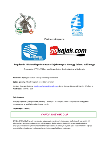 Partnerzy imprezy: Regulamin II Morskiego Maratonu Kajakowego o Wstęgę Zalewu Wiślanego Organizator: PTTK o/Elbląg, współorganizator: Stanica Wodna w Nadbrzeżu Kierownik wyścigu: Marcin Sochaj: [email protected] Sędzia główny: Marek Stępień: [email protected] Kontakt do organizatora: [email protected], Jerzy Sukow, kierownik Stanicy Wodnej w Nadbrzeżu: 509 457 254 Cele imprezy: Przepłynięcie bez jakiejkolwiek pomocy z zewnątrz liczacej 42,5 Mm trasy wyznaczonej przez organizatora w możliwie najkrótszym czasie. Impreza jest częścią: CANOA KAZYAK CUP CANOA KAZYAK CUP to cykl maratonów kajakowych na różnych dystansach, nie krótszych jednak jak 50 kilometrów i na różnych akwenach o zróżnicowanej skali trudności. Celem ich przeprowadzenia jest propagowanie aktywnej formy kajakarstwa w połączeniu ze zdrowym trybem życia oraz wyłonienie z grupy uczestników najszybszego i najbardziej wszechstronnego kajakarza nizinnego. Termin i miejsce imprezy: 11 lipca 2015, Wyścig będzie rozegrany na trasie głównej, o ile siła wiatru w chwili startu nie przekroczy 20 węzłów Wody Zalewu wiślanego, w razie niesprzyjających warunków atmosferycznych (silny wiatr/duża fala) organizator przeprowadzi wyścig po trasie alternatywnej Start: Na godzinę przed startem odbędzie się obowiązkowa dla wszystkich zawodników inspekcja sprzętu. Zawodnik, który nie przeszedł inspekcji technicznej przez sędziego głównego, nie zostanie dopuszczony do startu. Odbędzie się 11 lipca 2015 o godzinie 0800 w porcie w Nadbrzeżu. Linię startu wyznaczaja słupki z chorągiewkami po obu stronach kanału portowego. Na linię startu mozna wpłynać dopiero po sygnale startu. Kajaki które wpłynęły na nią wcześniej (popełniły falstart) muszą sie wycofać poza linię startu i ponownie na nią wpłynać po sygnale startu. Sygnały startowe: 5minut do startu – sygnał dźwiękowy (buczek) 1minuta do startu – sygnał dzwiękowy (gong) Start – sygnał dźwiękowy (buczek) Trasa: Wiedzie wodami Zalewu Wiślanego i wymaga ominięcia lewą lub prawą burtą następujących znaków nawigacyjnych: pława "4" pława "KAT" stawa "Gdańsk" pława "KW-S" pława "TOL" stawa "Elbląg" pława "6/E" Lewą Burtą Lewą Burtą Lewą Burtą Prawą Burtą Prawą Burtą Prawą Burtą Prawą Burtą Meta: Linia mety jest taka sama jak linia startu. Linia mety zostanie zamknieta po upływie czasu równego dwukrotnemu czasowi pierwszego na mecie. płynięcia Trasa alternatywna: Rozgrywana, jeśli do godziny 0830 warunki pogodowe nie pozwolą na rozegranie wyścigu po Zalewie Wiślanym Rzeka Elbląg do Starego Miasta, okrążenie pierwszego mostu zwodzonego rzeka Elbląg do ujścia Kanału Jagiellońskiego Kanał Jagielloński rzeka Szkarpawa do ujścia Wisły Królewieckiej Wisła Królewiecka do Zalewu Wiślanego pława "16" Lewą Burtą Linia mety jest taka sama jak linia startu. Linia mety zostanie zamknięta po upływie czasu równego dwukrotnemu czasowi pierwszego na mecie. płynięcia 1. ZGŁOSZENIA: Zgłoszenia można przesyłać pocztą elektroniczną na adres: [email protected] W ramach zgłoszenia należy: podać dane osobowe (imię i nazwisko, adres, PESEL oraz numer telefonu jaki będzie używany przez uczestnika podczas imprezy), załączyć dowód przelewu w formie elektronicznej Dokonanie opłaty wpisowej w wymaganym terminie jest warunkiem niezbędnym do przyjęcia zgłoszenia. Opłaty wpisowe: do 15.06.2015: 50 zł na konto organizatora do 30.06.2015: 70 zł na konto organizatora od 1 do 11.07: 100 zł na miejscu w Stanicy Wodnej w Nadbrzeżu dane do przelewu: POLSKIE TOWARZYSTWO TURYSTYCZNO – KRAJOZNAWCZE Oddział Ziemi Elbląskiej 82-300 ELBLĄG, ul. Krótka 5 PEKAO S.A. 36 1240 2265 1111 0010 3570 7650 2. WARUNKI UCZESTNICTWA: 2.1. W imprezie mogą wziąć udział tylko osoby pełnoletnie, posiadające umiejętność pływania wpław i doświadczenie w uprawianiu kajakarstwa morskiego. 2.2. Zgłoszenie uczestnictwa w określonym przez Organizatora terminie oraz opłacenie wpisowego. 2.3. Uczestnicy mogą startować w jednej z kategorii: K1K, K1M, K2K, K2M, K2Mix. Warunkiem klasyfikowania kategorii jest start co najmniej 3 osad. W wypadku braku wymaganego minimum uczestnicy będą klasyfikowani w klasyfikacji generalnej. 3. SPRZĘT: 3.1. Kajak morski. Za kajak morski uważa się kajak dowolnej konstrukcji wyposażony w: kokpit z fartuchem, dwie niezależne stałe komory wypornościowe, olinowanie pokładu składajace sie co najmniej z linki biegnacej dookoła pokładu i kończącej sie nie dalej niż 50cm od dziobu i rufy. Do wyścigu dopuszcza się kajaki surf ski lub sit on top, o ile jest on wyposażony w smycz, którą kajakarz ma na stałe przyczepioną do ciała 3.2. Obowiazkowy sprzęt dodatkowy Kamizelka asekuracyjna lub ratunkowa którą kajakarz musi cały czas mieć na sobie. Sprzet do wzywania pomocy. Jeden z: wodoodporne UKF działające na zakresach morskich, wodoodporny (lub zabezpieczony tak by umożliwiał rozmowę podczas pływania wpław) telefon komórkowy z szybkim wybieraniem telefonów stacji SAR Tolkmicko i organizatora, PLB, SPOT, lub inny który kierownik wyścigu uzna za wystarczający. Kompas lub busola Odpowiedni strój. Ze względu na rozległość akwenu uczestnik musi być przygotowany na spędzenie w wodze 1h od momentu wezwania pomocy. Czołówka (latarka) wraz z zapasowymi bateriami Każdy zawodnik ma obowiązek mieć na kamizelce numer startowy dostarczony przez organizatora Każdy uczestnik zawodów jest zobowiązany mieć w/na kajaku przywiązaną tyczkę bambusową wys. 2,5 m z chorągiewką. Tyczkę należy wrzucić do wody w razie wzywania pomocy i oczekiwania na akcję ratowniczą. Tyczka zostanie dostarczona przez organizatora 4. Przerwanie płynięcia: Uczestnik który zrezygnował z udziału w wyścigu musi niezwłocznie skontaktować sie z organizatorem i poinformować go oswoich zamiarach co do celu płyniecia. W wypadku zakoń