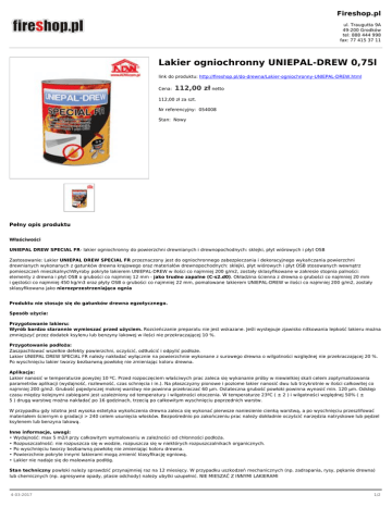 Fireshop.pl ul. Traugutta 9A 49-200 Grodków tel: 888 444 998 fax: 77 415 37 11 Lakier ogniochronny UNIEPAL-DREW 0,75l link do produktu: http://fireshop.pl/do-drewna/Lakier-ogniochronny-UNIEPAL-DREW.html Cena: 112,00 zł netto 112,00 zł za szt. Nr referencyjny: 054008 Stan: Nowy Pełny opis produktu Właściwości UNIEPAL DREW SPECIAL FR- lakier ogniochronny do powierzchni drewnianych i drewnopochodnych: sklejki, płyt wiórowych i płyt OSB Zastosowanie: Lakier UNIEPAL DREW SPECIAL FR przeznaczony jest do ogniochronnego zabezpieczania i dekoracyjnego wykańczania powierzchni drewnianych wykonanych z gatunków drewna krajowego oraz materiałów drewnopochodnych: sklejki, płyt wiórowych i płyt OSB stosowanych wewnątrz pomieszczeń mieszkalnychWyroby pokryte lakierem UNIEPAL-DREW w ilości co najmniej 200 g/m2, zostały sklasyfikowane w zakresie stopnia palności: elementy z drewna i płyt OSB o grubości co najmniej 12 mm - jako trudno zapalne (C-s2.d0). Okładzina ścienna z drewna o grubości co najmniej 20 mm i gęstości co najmniej 450 kg/m3 oraz płyty OSB o grubości co najmniej 22 mm, pomalowane lakierem UNIEPAL-DREW w ilości co najmniej 200 g/m2, zostały sklasyfikowana jako nierozprzestrzeniająca ognia Produktu nie stosuje się do gatunków drewna egzotycznego. Sposób użycia: Przygotowanie lakieru: Wyrób bardzo starannie wymieszać przed użyciem. Rozcieńczanie preparatu nie jest wskazane. Jeśli występuje zjawisko nitkowania lepkość lakieru można zmniejszyć przez dodatek ksylenu lub benzyny lakowej w ilości nie przekraczającej 10 %. Przygotowanie podłoża: Zaszpachlować wszelkie defekty powierzchni, oczyścić, odtłuścić i odpylić podłoże. Lakier UNIEPAL DREW SPECIAL FR należy nakładać wyłącznie na powierzchnie wykonane z surowego drewna o wilgotności względnej nie przekraczającej 20 %. Po wyschnięciu lakier tworzy bezbarwną powłokę nie zmieniając koloru drewna. Aplikacja: Lakier nanosić w temperaturze powyżej 10 ºC. Przed rozpoczęciem właściwych prac zaleca się wykonanie próby w niewielkiej skali celem zoptymalizowania parametrów aplikacji (wydajność, rozlewność, czas schnięcia i in.). Na płaszczyzny pionowe i poziome lakier nanosić dwu lub trzykrotnie w ilości całkowitej co najmniej 200 g/m2. Grubość pojedynczej mokrej warstwy nie powinna przekraczać 60 μm. Ostateczna grubość powłoki powinna wynosić min. 120 μm. Odstęp czasu między kolejnymi zabiegami jest uzależniony od temperatury i wilgotności otoczenia. W temperaturze 23ºC ( ± 2 ) i wilgotności względnej 50% ( ± 5 ) drugą warstwę można nakładać po 16 godzinach, trzecią po całkowitym wyschnięciu poprzednich warstw. W przypadku gdy istotna jest wysoka estetyka wykończenia drewna zaleca się wykonać pierwsze naniesienie cienką warstwą, a po wyschnięciu przeszlifować materiałem ściernym o gradacji > 240 celem usunięcia włosków. Bezpośrednio po zakończeniu prac należy dokładnie oczyścić narzędzia natryskowe lub pędzel ksylenem lub benzyna lakową. Inne informacje, uwagi: • Wydajność: max 5 m2/l przy całkowitym wymalowaniu w zależności od chłonności podłoża. • Rozpuszczalność: nie rozpuszcza się w wodzie, rozpuszcza się w niektórych rozpuszczalnikach organicznych. • Po wyschnięciu tworzy bezbarwną powłokę nie zmieniając koloru drewna. • Powierzchnie pokryte innymi lakierami mogą zmienić klasyfikację ogniową. • Lakier nie nadaje się do malowania podłóg. Stan techniczny powłoki należy sprawdzić przynajmniej raz na 12 miesięcy. W przypadku uszkodzeń mechanicznych (np. zadrapania, rysy, pękanie drewna) lub chemicznych (np. agresywne opady, ptasie odchody) należy ubytki uzupełnić. NIE MIESZAĆ Z INNYMI LAKIERAMI 4-03-2017 1/2 Powiązane produkty Lakier ogniochron... 80,00 zł 4-03-2017 Lakier ogniochron... 145,00 zł 2/2