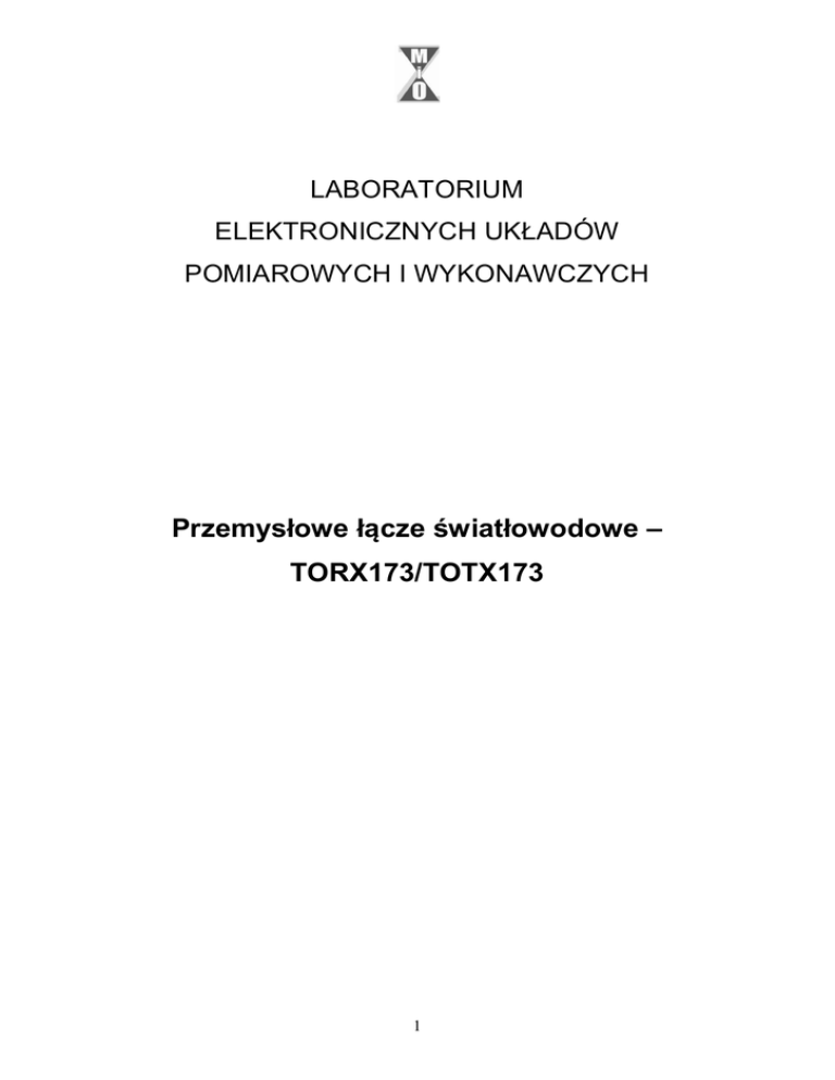 LABORATORIUM ELEKTRONICZNYCH UKŁADÓW POMIAROWYCH I WYKONAWCZYCH Przemysłowe łącze światłowodowe – TORX173/TOTX173 1 1. Cel ćwiczenia Celem ćwiczenia jest zapoznanie się z podstawowymi właściwościami przemysłowego łącza światłowodowego – TORX173/TOTX173 2 2. Przebieg ćwiczenia Zbudować układ pomiarowy według przedstawionego schematu: + ZASILACZ UCC = 5V + + GENERATOR - UCC ver. 1 ŁĄCZE ŚWIATŁOWODOWE - WE LOGIC TOTX173 670nm TORX173 WY Osc LOGIC GW - 2003 Korzystając z oscyloskopu określić czas opóźnienia między sygnałem wejściowym a wejściowych. Przerysować zaobserwowane przebiegi. L.p 1 2 3 4 5 6 7 8 9 10 f Hz 100k 500k 1M 2M 5M 100k 500k 1M 2M 5M δ top % top s Uwagi l=1m l=10m 3