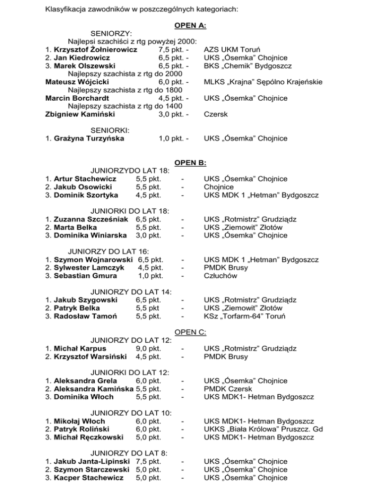 Klasyfikacja zawodników w poszczególnych kategoriach: OPEN A: SENIORZY: Najlepsi szachiści z rtg powyżej 2000: 1. Krzysztof Żołnierowicz 7,5 pkt. 2. Jan Kiedrowicz 6,5 pkt. 3. Marek Olszewski 6,5 pkt. Najlepszy szachista z rtg do 2000 Mateusz Wójcicki 6,0 pkt. Najlepszy szachista z rtg do 1800 Marcin Borchardt 4,5 pkt. Najlepszy szachista z rtg do 1400 Zbigniew Kamiński 3,0 pkt. SENIORKI: 1. Grażyna Turzyńska 1,0 pkt. - AZS UKM Toruń UKS „Ósemka” Chojnice BKS „Chemik” Bydgoszcz MLKS „Krajna” Sępólno Krajeńskie UKS „Ósemka” Chojnice Czersk UKS „Ósemka” Chojnice OPEN B: JUNIORZYDO LAT 18: 1. Artur Stachewicz 5,5 pkt. 2. Jakub Osowicki 5,5 pkt. 3. Dominik Szortyka 4,5 pkt. - UKS „Ósemka” Chojnice Chojnice UKS MDK 1 „Hetman” Bydgoszcz JUNIORKI DO LAT 18: 1. Zuzanna Szcześniak 6,5 pkt. 2. Marta Belka 5,5 pkt. 3. Dominika Winiarska 3,0 pkt. - UKS „Rotmistrz” Grudziądz UKS „Ziemowit” Złotów UKS „Ósemka” Chojnice JUNIORZY DO LAT 16: 1. Szymon Wojnarowski 6,5 pkt. 2. Sylwester Lamczyk 4,5 pkt. 3. Sebastian Gmura 1,0 pkt. - UKS MDK 1 „Hetman” Bydgoszcz PMDK Brusy Człuchów JUNIORZY DO LAT 14: 1. Jakub Szygowski 6,5 pkt. 2. Patryk Belka 5,5 pkt 3. Radosław Tamoń 5,5 pkt. - UKS „Rotmistrz” Grudziądz UKS „Ziemowit” Złotów KSz „Torfarm-64” Toruń OPEN C: JUNIORZY DO LAT 12: 1. Michał Karpus 9,0 pkt. 2. Krzysztof Warsiński 4,5 pkt. - UKS „Rotmistrz” Grudziądz PMDK Brusy JUNIORKI DO LAT 12: 1. Aleksandra Grela 6,0 pkt. 2. Aleksandra Kamińska 5,5 pkt. 3. Dominika Włoch 5,5 pkt. - UKS „Ósemka” Chojnice PMDK Czersk UKS MDK1- Hetman Bydgoszcz JUNIORZY DO LAT 10: 1. Mikołaj Włoch 6,0 pkt. 2. Patryk Roliński 6,0 pkt. 3. Michał Ręczkowski 5,0 pkt. - UKS MDK1- Hetman Bydgoszcz UKKS „Biała Królowa” Pruszcz. Gd UKS MDK1- Hetman Bydgoszcz JUNIORZY DO LAT 8: 1. Jakub Janta-Lipinski 7,5 pkt. 2. Szymon Starczewski 5,0 pkt. 3. Kacper Stachewicz 5,0 pkt. - UKS „Ósemka” Chojnice UKS „Ósemka” Chojnice UKS „Ósemka” Chojnice
