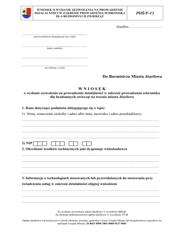 WNIOSEK O WYDANIE ZEZWOLENIA NA PROWADZENIE DZIAŁALNOŚCI W ZAKRESIE PROWADZENIA SCHRONISKA DLA BEZDOMNYCH ZWIERZĄT POŚ/F-13 Józefów, …………………….. ………………………………….............…. (nazwa podmiotu ubiegającego się o wpis) ………………………….............…………. (adres siedziby) ………………………….............…………. ………………………….............…………. (nr telefonu, e-mail) Do Burmistrza Miasta Józefowa WNIOSEK o wydanie zezwolenia na prowadzenie działalności w zakresie prowadzenia schroniska dla bezdomnych zwierząt na terenie miasta Józefowa 1. Dane dotyczące podmiotu ubiegającego się o wpis: 1) firmę, oznaczenie siedziby i adres albo imię, nazwisko i adres przedsiębiorcy: ………………………………………………………………………………………………… ………………………………………………………………………………………………… ………………………………………………………………………………………………… ………………………………………………………………………………………………… 2) NIP 2. Określenie środków technicznych jaki dysponuje wnioskodawca ………………………………………………………………………………………………… ………………………………………………………………………………………………… ………………………………………………………………………………………………… ……………………………………………………………………………………..…………. 3. Informacje o technologiach stosowanych lub przewidzianych do stosowania przy świadczeniu usług w zakresie działalności objętej wnioskiem ………………………………………………………………………………………………… ………………………………………………………………………………………………… ………………………………………………………………………………………………… Za wydanie zezwolenia opłata skarbowa w wysokości 616 zł. Za złożenie pełnomocnictwa opłata skarbowa w wysokości 17 zł. Opłata skarbowa wnoszona jest w chwili złożenia wniosku gotówką w kasie Urzędu Miasta lub bezgotówkowo (przelew) na rachunek Urzędu Miasta: 26 8023 0009 2001 0000 0127 0001 WNIOSEK O WYDANIE ZEZWOLENIA NA PROWADZENIE DZIAŁALNOŚCI W ZAKRESIE PROWADZENIA SCHRONISKA DLA BEZDOMNYCH ZWIERZĄT POŚ/F-13 ………………………………………………………………………………………………… ………………………………………………………………………………………………… 4. Proponowane zabiegi z zakresu ochrony środowiska i ochrony sanitarnej planowane po zakończeniu działalności ………………………………………………………………………………………………… ………………………………………………………………………………………………… ………………………………………………………………………………………………… ………………………………………………………………………………………………… 5. Termin podjęcia świadczenia usługi objętej wnioskiem: ……………………………… 6. Zamierzony czas świadczenia usługi: …………………………………………………… 7. Sposób oznakowania pojazdu:……………………………………………………………... …………………………………………………………………………………………………... ……………………………… podpis wnioskodawcy Załączniki: 1. zaświadczenie albo oświadczenie o braku zaległości podatkowych i zaległości w płaceniu składek na ubezpieczenie zdrowotne lub społeczne następującej treści: ,,Jestem świadomy odpowiedzialności karnej za złożenie fałszywego oświadczenia”, 2. dokument potwierdzający, że wnioskodawca jest uprawniony do prowadzenia działalności gospodarczej, 3. dokument potwierdzający prawo do dysponowania nieruchomością na której ma być prowadzona działalność (np. akt notarialny, umowa dzierżawy, użyczenia, najmu, użytkowania, wyciąg z księgi wieczystej), 4. dokument potwierdzający, że schronisko dla bezdomnych zwierząt zlokalizowane jest na terenie przewidzianym w miejscowym planie zagospodarowania przestrzennego lub warunkach zabudowy na prowadzenie tego rodzaju działalności, 5. oświadczenie o dysponowaniu obiektami oraz terenem niezbędnym do prawidłowego prowadzenia działalności, 6. oświadczenie o dysponowaniu sprzętem i urządzeniami niezbędnymi do prawidłowego prowadzenia działalności, 7. oświadczenie o posiadaniu środków technicznych zapewniających prowadzenie i przechowywanie rejestru i dokumentacji zawierających informację o zwierzętach, 8. wykaz środków transportu przystosowanych do przewozu zwierząt, 9. decyzja Powiatowego Lekarza Weterynarii stwierdzającą spełnienie wymagań weterynaryjnych określonych dla środka transportu zwierząt, 10. dokument potwierdzający o możliwości zapewnienia opieki lekarsko weterynaryjnej, 11. dokument potwierdzający prawidłowe zgłoszenie zamiaru prowadzenia schroniska dla zwierząt Powiatowemu Lekarzowi Weterynarii właściwemu ze względu na miejsce prowadzenia działalności, 12. oświadczenie o dysponowaniu odpowiednio przygotowanym i przeszkolonych personelem w liczbie zapewniającej stałe świadczenie usług, 13. polisa ubezpieczeniowa od odpowiedzialności cywilnej w zakresie prowadzonej działalności, 14. dowód uiszczenia opłaty skarbowej, 15. w przypadku występowania przez pełnomocnika oryginał l