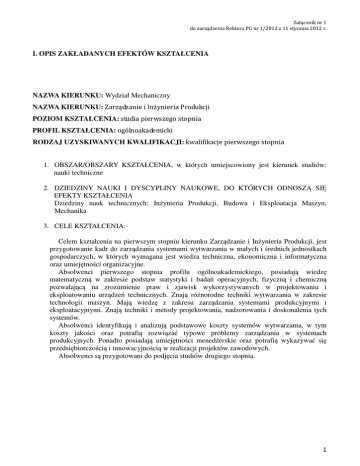 Załącznik nr 1 do zarządzenia Rektora PG nr 1/2012 z 11 stycznia 2012 r. I. OPIS ZAKŁADANYCH EFEKTÓW KSZTAŁCENIA NAZWA KIERUNKU: Wydział Mechaniczny NAZWA KIERUNKU: Zarządzanie i Inżynieria Produkcji POZIOM KSZTAŁCENIA: studia pierwszego stopnia PROFIL KSZTAŁCENIA: ogólnoakademicki RODZAJ UZYSKIWANYCH KWALIFIKACJI: kwalifikacje pierwszego stopnia 1. OBSZAR/OBSZARY KSZTAŁCENIA, w których umiejscowiony jest kierunek studiów: nauki techniczne 2. DZIEDZINY NAUKI I DYSCYPLINY NAUKOWE, DO KTÓRYCH ODNOSZĄ SIĘ EFEKTY KSZTAŁCENIA Dziedziny nauk technicznych: Inżynieria Produkcji, Budowa i Eksploatacja Maszyn, Mechanika 3. CELE KSZTAŁCENIA: Celem kształcenia na pierwszym stopniu kierunku Zarządzanie i Inżynieria Produkcji, jest przygotowanie kadr do zarządzania systemami wytwarzania w małych i średnich jednostkach gospodarczych, w których wymagana jest wiedza techniczna, ekonomiczna i informatyczna oraz umiejętności organizacyjne. Absolwenci pierwszego stopnia profilu ogólnoakademickiego, posiadają wiedzę matematyczną w zakresie podstaw statystyki i badań operacyjnych, fizyczną i chemiczną pozwalającą na zrozumienie praw i zjawisk wykorzystywanych w projektowaniu i eksploatowaniu urządzeń technicznych. Znają różnorodne techniki wytwarzania w zakresie technologii maszyn. Mają wiedzę z zakresu zarządzania systemami produkcyjnymi i eksploatacyjnymi. Znają techniki i metody projektowania, nadzorowania i doskonalenia tych systemów. Absolwenci identyfikują i analizują podstawowe koszty systemów wytwarzania, w tym koszty jakości oraz potrafią rozwiązać typowe problemy zarządzania w systemach produkcyjnych. Ponadto posiadają umiejętności menedżerskie oraz potrafią wykazywać się przedsiębiorczością i innowacyjnością w realizacji projektów zawodowych. Absolwenci są przygotowani do podjęcia studiów drugiego stopnia. 1 Załącznik nr 1 do zarządzenia Rektora PG nr 1/2012 z 11 stycznia 2012 r. 4. EFEKTY KSZTAŁCENIA OPIS ZAKŁADANYCH EFEKTÓW KSZTAŁCENIA Nazwa kierunku: Zarządzanie i Inżynieria Produkcji Osoba posiada kwalifikacje pierwszego stopnia: Odniesienie do Symbol* obszarowych efektów WIEDZA kształcenia K_W01 posiada wiedzę w zakresie algebry liniowej, równań T1A_W01 różniczkowych, analizy i statystyki matematycznej przydatnych do modelowania i interpretowania układów mechanicznych, procesów wytwarzania i własności eksploatacyjnych urządzeń K_W02 ma uporządkowana wiedzę w zakresie fizyki obejmującej T2A_W01 mechanikę klasyczną, optykę, elektryczność i magnetyzm, T2A_W03 wykazuje znajomość elementów fizyki kwantowej K_W03 ma wiedzę o materiałach, ich właściwościach i metodach T2A_W02 badań, w tym wiedzę o materiałach konstrukcyjnych T1A_W01 stosowanych w przemyśle maszynowym K_W04 ma uporządkowaną podbudowaną teoretycznie wiedzę z T1A_W03 mechaniki obejmującej modelowanie układów mechanicznych z zakresu statyki, kinematyki i dynamiki K_W05 ma uporządkowaną, podbudowaną teoretycznie wiedzę w T1A_W03 zakresie analizy wytrzymałościowej materiałów i wyrobów K_W06 ma podstawową wiedzę w zakresie automatyki, robotyki i T2A_W02 sterowania procesami produkcyjnymi K_W07 ma wiedzę z zakresu zapisu konstrukcji dla potrzeb T1A_W04 przygotowania dokumentacji procesu wytwarzania T1A_W07 K_W08 ma podstawową wiedzę z implementowania i zarządzania T1A_W02 systemami produkcyjnymi oraz wiedzę obejmującą zasady projektowania części maszyn i technologii ich wytwarzania z wykorzystaniem technik informacyjnych K_W09 ma podstawowa wiedzę z termodynamiki i mechaniki płynów T1A_W02 oraz doboru i projektowania układów hydraulicznych i T1A_W03 pneumatycznych K_W10 ma elementarną wiedzę z zastosowań elektrotechniki i T1A_W02 elektroniki w systemie produkcyjnym K_W11 posiada usystematyzowaną, podbudowaną teoretycznie wiedzę T1A_W03 z zakresu modelowania działania systemów wytwórczych o T1A_W07 zróżnicowanych strukturach i formach ich organizacji oraz analizy przebiegów procesów produkcyjnych metodami symulacji komputerowej K_W12 ma wiedzę w zakresie technik wytwarzania części maszyn oraz T1A_W03 możliwości i trendów rozwojowych maszyn i urządzeń T1A_W05 produkcyjnych oraz sterowania procesami K_W13 ma wiedzę z zakresu metod, błędów i niepewności pomiaru, T1A_W03 specyfikacji geometrii wyrobów i oceny ich dokładności K_W14 ma wiedzę o cyklu życia produktów oraz urządzeń i systemów T1A_W06 2 Załącznik nr 1 do zarządzenia Rektora PG nr 1/2012 z 11 stycznia 2012 r. mechanicznych ma podstawową wiedzę w zakresie zarządzania, w tym T1A_W09 zarządzania jakością procesów i wyrobów K_W16 zna ogólne zasady tworzenia i rozwoju form indywidualnej T1A_W11 przedsiębiorczości i pobudzania kreatywności pracowniczej, wykorzystujące wiedzę z zakresu projektowania, wytwarzania i eksploatacji maszyn i urządzeń technicznych K_W17 ma podstawową wiedzę niezbędną do rozumienia T1A_W02 ekonomicznych uwarunkowań działalności inżynierskiej i T1A_W08 prawa gospodarczego, doskonalenia środowiska pracy wpływającego na wydajność, koszty i jakość pracy K_W18 zna i rozumie podstawowe pojęcia i zasady z zakresu ochrony T1A_W10 własności przemysłowej i prawa autorskiego, potrafi korzystać z zasobów informacji patentowej K_W19 ma szczegółową wiedzę o zintegrowanych i T1A_W04 znormalizowanych systemach zarządzania jakością, środowiskiem, bezpieczeństwem i higieną pracy K_W201) ma szczegółową, podbudowaną teoretycznie wiedzę w T1A_W04 zakresie metod i technik stosowanych w procesach sterowania T1A_W09 jakością produkcji, statystyczną kontrolą procesów, współczesnymi technikami i systemami pomiarowymi w zapewnieniu jakości oraz technik informacyjnych w systemach produkcyjnych K_W212) ma szczegółową wiedzę w zakresie wytwarzania i eksploatacji T1A_W04 maszyn i urządzeń, diagnozowania ich stanów technicznych i doboru technik regen