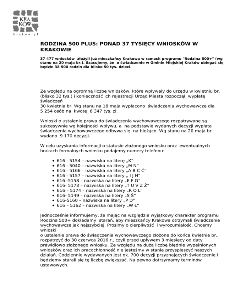 RODZINA 500 PLUS: PONAD 37 TYSIĘCY WNIOSKÓW W KRAKOWIE 37 477 wniosków złożyli już mieszkańcy Krakowa w ramach programu "Rodzina 500+" (wg stanu na 20 maja br.). Szacujemy, że o świadczenie w Gminie Miejskiej Kraków ubiegać się będzie 38 500 rodzin dla blisko 50 tys. dzieci. Ze względu na ogromną liczbę wniosków, które wpływały do urzędu w kwietniu br. (blisko 32 tys.) i konieczność ich rejestracji Urząd Miasta rozpoczął wypłatę świadczeń 30 kwietnia br. Wg stanu na 18 maja wypłacono świadczenia wychowawcze dla 5 254 osób na kwotę 6 347 tys. zł. Wnioski o ustalenie prawa do świadczenia wychowawczego rozpatrywane są sukcesywnie wg kolejności wpływu, a na podstawie wydanych decyzji wypłata świadczenia wychowawczego odbywa się na bieżąco. Wg stanu na 20 maja br. wydano 9 170 decyzji. W celu uzyskania informacji o statusie złożonego wniosku oraz ewentualnych brakach formalnych wniosku podajemy numery telefonu: 616 - 5154 – nazwiska na literę „K” 616 - 5040 – nazwiska na litery „M N” 616 - 5166 – nazwiska na litery „A B C Ć” 616 - 5157 – nazwiska na litery „ I J H” 616 -5158 – nazwiska na litery „E F G” 616- 5173 – nazwiska na litery „T U V Z Ż” 616 – 5174 – nazwiska na litery „R O L” 616- 5149 – nazwiska na litery „S Ś” 616-5160 – nazwiska na litery „P D” 616 – 5162 – nazwiska na litery „W Ł” Jednocześnie informujemy, że mając na względzie wyjątkowy charakter programu Rodzina 500+ dokładamy starań, aby mieszkańcy Krakowa otrzymali świadczenie wychowawcze jak najszybciej. Prosimy o cierpliwość i wyrozumiałość. Chcemy wnioski o ustalenie prawa do świadczenia wychowawczego złożone do końca kwietnia br., rozpatrzyć do 30 czerwca 2016 r., czyli przed upływem 3 miesięcy od daty prawidłowo złożonego wniosku. Ze względu na dużą liczbę błędnie wypełnionych wniosków oraz ich pracochłonność nie jesteśmy w stanie przyspieszyć naszych działań. Codziennie wydawanych jest ok. 700 decyzji przyznających świadczenie i będziemy starali się tę liczbę zwiększać. Na pewno dotrzymamy terminów ustawowych. Powered by TCPDF (www.tcpdf.org)