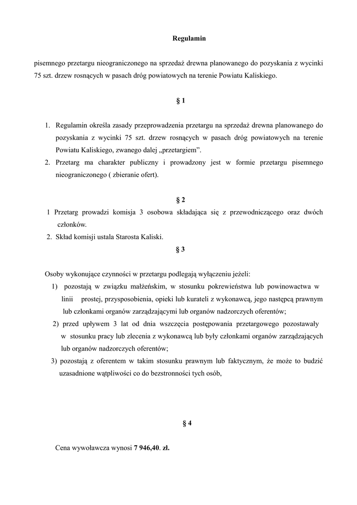 Regulamin pisemnego przetargu nieograniczonego na sprzedaż drewna planowanego do pozyskania z wycinki 75 szt. drzew rosnących w pasach dróg powiatowych na terenie Powiatu Kaliskiego. §1 1. Regulamin określa zasady przeprowadzenia przetargu na sprzedaż drewna planowanego do pozyskania z wycinki 75 szt. drzew rosnących w pasach dróg powiatowych na terenie Powiatu Kaliskiego, zwanego dalej „przetargiem”. 2. Przetarg ma charakter publiczny i prowadzony jest w formie przetargu pisemnego nieograniczonego ( zbieranie ofert). §2 1 Przetarg prowadzi komisja 3 osobowa składająca się z przewodniczącego oraz dwóch członków. 2. Skład komisji ustala Starosta Kaliski. §3 Osoby wykonujące czynności w przetargu podlegają wyłączeniu jeżeli: 1) pozostają w związku małżeńskim, w stosunku pokrewieństwa lub powinowactwa w linii prostej, przysposobienia, opieki lub kurateli z wykonawcą, jego następcą prawnym lub członkami organów zarządzającymi lub organów nadzorczych oferentów; 2) przed upływem 3 lat od dnia wszczęcia postępowania przetargowego pozostawały w stosunku pracy lub zlecenia z wykonawcą lub były członkami organów zarządzających lub organów nadzorczych oferentów; 3) pozostają z oferentem w takim stosunku prawnym lub faktycznym, że może to budzić uzasadnione wątpliwości co do bezstronności tych osób, §4 Cena wywoławcza wynosi 7 946,40. zł. §5 Ogłoszenie o przetargu określa w szczególności: 1) siedzibę, adres Powiatu Kaliskiego, 2) miejsce przetargu, 3) przedmiot przetargu, 4) cenę wywoławczą, 5) miejsce i termin uzyskania informacji o przedmiocie i regulaminie przetargu, 6) miejsce i termin składania ofert, 7) termin wycinki i uporządkowania terenu po wycince, 8) dokumenty jakie zobowiązani są dostarczyć oferenci. §6 1. Oferent może złożyć tylko jedną ofertę. 2. Jeżeli nie można będzie dokonać wyboru oferty najkorzystniejszej ze względu na to, że zostały złożone oferty o takiej samej cenie, oferenci, którzy złożyli te oferty zostaną wezwani do złożenia ofert dodatkowych. §7 Obwieszczenie o przetargu zamieszczone zostanie jednorazowo na stronie internetowej Biuletyn Informacji Publicznej Powiatu Kaliskiego oraz na tablicy ogłoszeń w Starostwie Powiatowym w Kaliszu. §8 1.Oferta powinna zawierać: 1) nazwę i adres oferenta, 2) oferowaną cenę kupna drewna, 3) aktualny odpis z właściwego rejestru albo aktualne zaświadczenie o wpisie do ewidencji działalności gospodarczej, jeżeli odrębne przepisy wymagają wpisu do rejestru lub zgłoszenia do ewidencji działalności gospodarczej, wystawione nie wcześniej niż 6 miesięcy przed upływem terminu składania ofert. 4) zobowiązanie do posiadania na czas wykonywania umowy ubezpieczenie robót z tytułu szkód, które mogą zaistnieć w związku z określonymi zdarzeniami losowymi, oraz od odpowiedzialności cywilnej w związku z prowadzoną działalnością gospodarczą. 2. Dokumenty należy przedstawić w formie oryginału lub kserokopii poświadczonej za zgodność z oryginałem przez oferenta ( na każdej zapisanej stronie). §9 Oferent, którego oferta zostanie wybrana jest zobowiązany: 1) do zawarcia umowy kupna – sprzedaży na warunkach określonych w projekcie umowy stanowiącym załącznik do regulaminu. 2) zapłacenia ceny za drewno w terminie 15 dni od zawarcia umowy na wskazane konto bankowe. § 10 1. Komisja przetargowa dokonuje otwarcia ofert, ustala które z nich uznaje za ważne i dokonuje wyboru oferty. Z powyższych czynności komisja sporządza protokół, który podpisują wszyscy członkowie komisji. 2. Komisja zawiadamia w terminie 7 dni od dokonania wyboru oferty pisemnie wszystkich oferentów o wynikach przetargu. § 11 1. Komisja dokonuje wyboru oferty, z ceną wyższą niż cena wywoławcza przy zachowaniu wszystkich określonych w niniejszym regulaminie warunków. 2. Komisja nie może wybrać oferty, z ceną niższą niż cena wywoławcza. § 12 Przetarg może zostać unieważniony bez wybrania którejkolwiek z ofert.