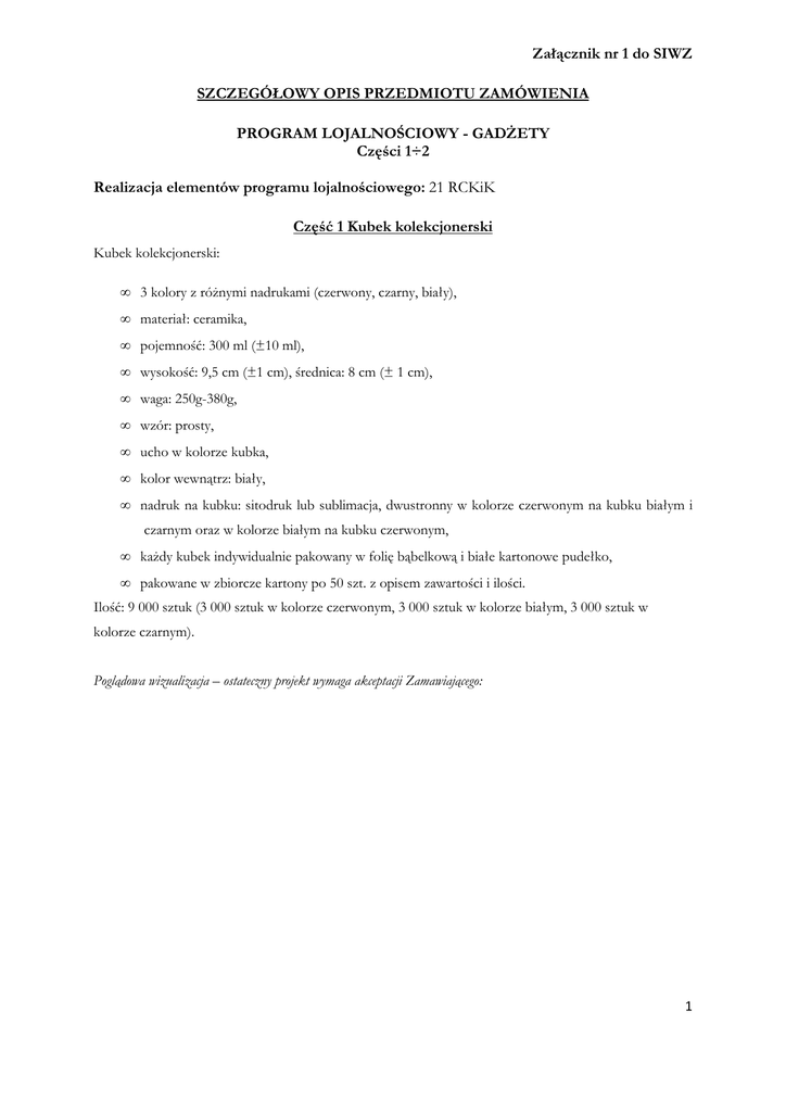 Załącznik nr 1 do SIWZ SZCZEGÓŁOWY OPIS PRZEDMIOTU ZAMÓWIENIA PROGRAM LOJALNOŚCIOWY - GADŻETY Części 1÷2 Realizacja elementów programu lojalnościowego: 21 RCKiK Część 1 Kubek kolekcjonerski Kubek kolekcjonerski: • 3 kolory z różnymi nadrukami (czerwony, czarny, biały), • materiał: ceramika, • pojemność: 300 ml (±10 ml), • wysokość: 9,5 cm (±1 cm), średnica: 8 cm (± 1 cm), • waga: 250g-380g, • wzór: prosty, • ucho w kolorze kubka, • kolor wewnątrz: biały, • nadruk na kubku: sitodruk lub sublimacja, dwustronny w kolorze czerwonym na kubku białym i czarnym oraz w kolorze białym na kubku czerwonym, • każdy kubek indywidualnie pakowany w folię bąbelkową i białe kartonowe pudełko, • pakowane w zbiorcze kartony po 50 szt. z opisem zawartości i ilości. Ilość: 9 000 sztuk (3 000 sztuk w kolorze czerwonym, 3 000 sztuk w kolorze białym, 3 000 sztuk w kolorze czarnym). Poglądowa wizualizacja – ostateczny projekt wymaga akceptacji Zamawiającego: 1 Część 2 Kubek do malowania Kubek do malowania: • materiał: ceramika, pokryta specjalnym materiałem, który umożliwia pisanie po nim tak, jak po tablicy i ścieranie pozostawionych wiadomości, • zawiera dwie kredy, • wymiary kubka: 8 cm (średnica kubka), 9,5 cm (wysokość kubka) (±1 cm w każdym wymiarze), • przy czym materiał, na którym można pisać stanowi min. 70% wysokości kubka, • kolor kubka wewnątrz: biały, • kolor wykończenia kubka zewnątrz: czerwony z nadrukowanym hasłem w jednej linii, w kolorze białym: „Każda kropla jest cenna”, , • napis trwały, niezmywalny, • pojemność kubka: 300 ml (±10 ml), • waga kubka: 250g-380 g, • każdy kubek indywidualnie pakowany w folię bąbelkową i białe kartonowe pudełko, • pakowane w zbiorcze kartony po 50 sztuk z opisem zawartości i ilości. Ilość: 6 000 sztuk. Poglądowa wizualizacja – ostateczny projekt wymaga akceptacji Zamawiającego: 2 3
