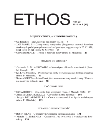 1 ETHOS Rok 23 2010 nr 4 (92) MIĘDZY CNOTĄ A NIEGODZIWOŚCIĄ * Od Redakcji – Stan, którego nie znamy (P. M.) 7 * JAN PAWEŁ II – Cztery cnoty kardynalne (Fragmenty czterech katechez środowych poświęconych cnotom kardynalnym, wygłoszonych 25 X 1978, 8 XI 1978, 15 XI 1978 i 22 XI 1978) 15 * Giovanni REALE – Troska o zdrowie duszy (tłum. P. Mikulska) 23 POWRÓT DO ŹRÓDEŁ? * Gertrude E. M. ANSCOMBE – Nowożytna filozofia moralności (tłum. M. Roszyk) 39 * Ks. Livio MELINA – Problematyka cnoty we współczesnej teologii moralnej (tłum. P. Mikulska) 61 * Natasza SZUTTA – Jedność cnót jako warunek normatywności cnoty. W obro− nie doktryny jedności cnót 78 ŻYĆ CNOTLIWIE * Otfried HÖFFE – Czy cnota daje szczęście? (tłum. J. Merecki SDS) 97 * Anna SZUDRA−BARSZCZ – Czy cnoty można nauczyć? 108 * Sergio BELARDINELLI – Cnota roztropności w życiu rodzinnym (tłum. P. Mikulska) 119 PYTANIE O NIEGODZIWOŚĆ * Robert PIŁAT – O moralnym wymiarze samozakłamania 131 * Marcin T. ZDRENKA – Gnuśność. Jej swoistość i współczesne kon− teksty 150 2 OBLICZA CNOTY * Ks. Marek STAROWIEYSKI – Psychomachia Prudencjusza, czyli kateche− za o cnotach i grzechach 171 * Małgorzata U. MAZURCZAK – Spes – Nadzieja pośród personifikacji cnót. Wokół Andrei Pisana drzwi południowych baptysterium we Florencji 183 * Ewelina MIKA – Dotknąć Tajemnicy... O wątkach epistemicznych i metafi− zycznych w twórczości Zbigniewa Herberta 200 * Dariusz SŁAPEK – Spartakus – ikona wolności i rewolucji. Recepcja postaci od oświecenia po wizje marksistów 215 POLEMIKI * Ireneusz ZIEMIŃSKI – Aporie śmierci. Dyskusja ze Stevenem Luperem 235 MYŚLĄC OJCZYZNA... * Ks. Jan ŻUKOWSKI – Obrazy Ojczyzny 253 OMÓWIENIA I RECENZJE * Patrycja MIKULSKA – Co nas różni od Arystotelesa (rec.: J. Jaśtal, Natura cnoty. Problematyka emocji w neoarystotelesowskiej etyce cnót, Księgarnia Akademicka, Kraków 2009) 258 * Anna GŁĄB – Etyka cnót w praktyce (rec.: Współczesna etyka cnót: możli− wości i ograniczenia, red. Natasza Szutta, Wydawnictwo Naukowe Semper, Warszawa 2010) 264 * Peter SIMONS – Filozofowie – i bohaterzy (tłum. D. Chabrajska; rec.: J. Ja− dacki, Polish Analytical Philosophy. Studies on its Heritage, with the appendix containing the bibliography of Polish logic from the second half of the 14th century to the first half of the 20th century, Semper, Warszawa 2009) 271 * Michalina BŁĘDZKA – Wychowanie jako poszanowanie godności osoby (rec.: W. Chudy, Pedagogia godności. Elementy etyki pedagogicznej, To− warzystwo Naukowe KUL, Lublin 2009) 275 * Agnieszka LEKKA−KOWALIK – By światło trwało... (rec. J. Ratzinger, Wykłady bawarskie z lat 1963−2004, tłum. A. Czarnocki, Instytut Wydawni− czy Pax, Warszawa 2009) 282 3 * Rafał WNUK – Niegodziwość czy uległość? (rec.: Kościół i opozycja na Lubelszczyźnie w dokumentach SB. 1971−1983, red. M. Sobieraj, Instytut Pamięci Narodowej, Lublin 2009; Aparat bezpieczeństwa wobec kurii bisku− pich w Polsce, red. A. Dziurok, Instytut Pamięci Narodowej, Warszawa 2009) 290 * Adam F. BARAN – Opozycja na Lubelszczyźnie przed sierpniem 1980 roku (M. Choma−Jusińska, Środowiska opozycji na Lubelszczyźnie 1975−1980, Instytut Pamięci Narodowej, Warszawa–Lublin 2009) 299 * Propozycje „Ethosu” (A. Głąb, Rozum w świecie praktyki. Poglądy filozo− ficzne Marthy C. Nussbaum, Wydawnictwa Akademickie i Profesjonalne; T. Szubka, Filozofia analityczna. Koncepcje, metody, ograniczenia, Wydaw− nictwo Uniwersytetu Wrocławskiego; R. Klibansky, E. Panofsky, F. Saxl, Saturn i melancholia. Studia z historii filozofii, przyrody, medycyny, religii oraz sztuki, Universitas) 308 SPRAWOZDANIA * Dariusz ŁUKASIEWICZ – Filozofowie współcześni o epistemologii religii (Międzynarodowa konferencja „The Right to Believe: Perspectives in Religious Epistemology – Prawo do wiary: Perspektywy epistemologii religii”, Uni− wersytet Kazimierza Wielkiego, Bydgoszcz, 7−9 IX 2010) 314 * Ks. Wojciech LIPPA – Łaska widzenia (Wystawa prac Grzegorza Bednarskiego, Apokalipsa, Lubelskie Towarzystwo Zachęty Sztuk Pięknych, Galeria Lipo− wa 13, Lublin, 5−20 IV 2010) 321 PRZEZ PRYZMAT ETHOSU * Maria OŻÓG – O Santiago de Compostela i kryzysie Kościoła – inaczej 326 BIBLIOGRAFIA * Jan Paweł II i Benedykt XVI o cnotach moralnych (oprac. Cezary RIT− TER) 332 * Noty o autorach 348 * Abstracts 353 * Contents 375