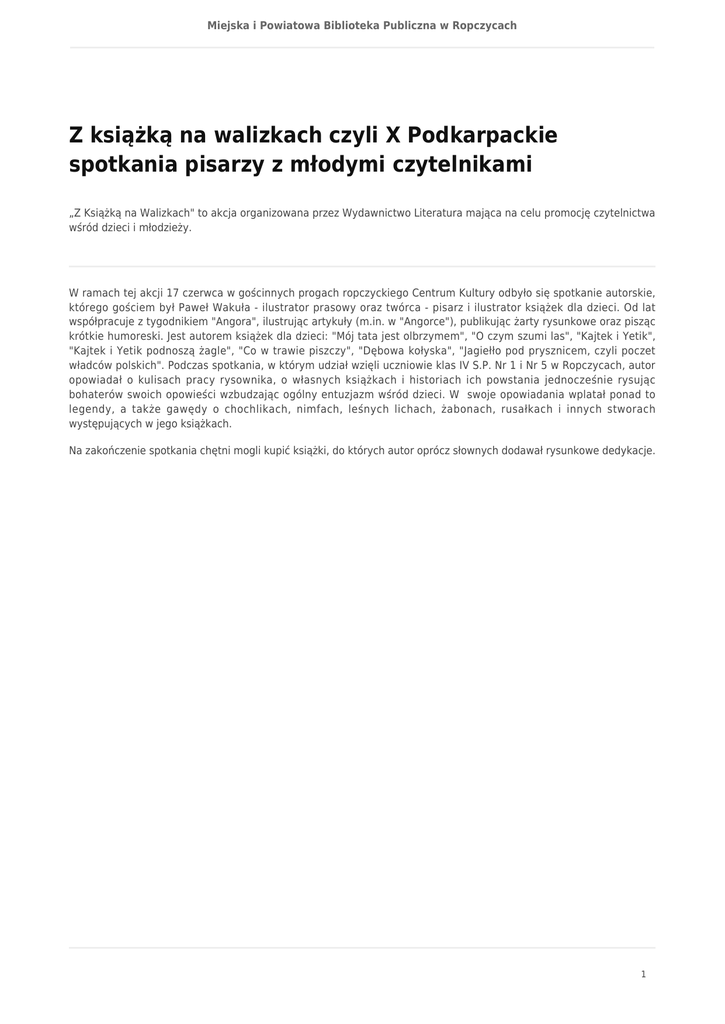 Miejska i Powiatowa Biblioteka Publiczna w Ropczycach Z książką na walizkach czyli X Podkarpackie spotkania pisarzy z młodymi czytelnikami „Z Książką na Walizkach" to akcja organizowana przez Wydawnictwo Literatura mająca na celu promocję czytelnictwa wśród dzieci i młodzieży. W ramach tej akcji 17 czerwca w gościnnych progach ropczyckiego Centrum Kultury odbyło się spotkanie autorskie, którego gościem był Paweł Wakuła - ilustrator prasowy oraz twórca - pisarz i ilustrator książek dla dzieci. Od lat współpracuje z tygodnikiem "Angora", ilustrując artykuły (m.in. w "Angorce"), publikując żarty rysunkowe oraz pisząc krótkie humoreski. Jest autorem książek dla dzieci: "Mój tata jest olbrzymem", "O czym szumi las", "Kajtek i Yetik", "Kajtek i Yetik podnoszą żagle", "Co w trawie piszczy", "Dębowa kołyska", "Jagiełło pod prysznicem, czyli poczet władców polskich". Podczas spotkania, w którym udział wzięli uczniowie klas IV S.P. Nr 1 i Nr 5 w Ropczycach, autor opowiadał o kulisach pracy rysownika, o własnych książkach i historiach ich powstania jednocześnie rysując bohaterów swoich opowieści wzbudzając ogólny entuzjazm wśród dzieci. W swoje opowiadania wplatał ponad to legendy, a także gawędy o chochlikach, nimfach, leśnych lichach, żabonach, rusałkach i innych stworach występujących w jego książkach. Na zakończenie spotkania chętni mogli kupić książki, do których autor oprócz słownych dodawał rysunkowe dedykacje. 1