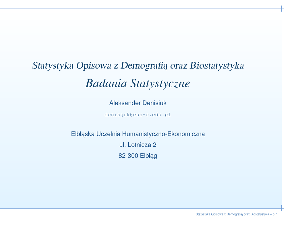 Statystyka Opisowa z Demografia˛ oraz Biostatystyka Badania Statystyczne Aleksander Denisiuk [email protected] Elblaska ˛ Uczelnia Humanistyczno-Ekonomiczna ul. Lotnicza 2 82-300 Elblag ˛ Statystyka Opisowa z Demografia˛ oraz Biostatystyka – p. 1 Badania Statystyczne Najnowsza wersja tego dokumentu dostepna ˛ jest pod adresem http://denisjuk.euh-e.edu.pl/ Statystyka Opisowa z Demografia˛ oraz Biostatystyka – p. 2 Przedmiot statystyki • nauka o ilościowych metodach zjawisk masowych ◦ prawidłowości statystyczne Statystyka Opisowa z Demografia˛ oraz Biostatystyka – p. 3 Podstawowe pojecia ˛ statystyczne • zbiorowość statystyczna • jednostki stastystyczne • cechy statystyczne ◦ stałe ◦ zmienne • jakościowe • ilościowe · skokowe · ciagłe ˛ · pseudo ciagłe ˛ • cechy dwudzielne (dychotomiczne, zero-jedynkowe) Statystyka Opisowa z Demografia˛ oraz Biostatystyka – p. 4 Zbiorowości statystyczne • jednowymiarowe (jednocechowe) • wielowymiarowe (wielocechowe) Statystyka Opisowa z Demografia˛ oraz Biostatystyka – p. 5 Pomiar • przypisanie cechom jednostek symboli • pomiar bezpośredni • skale pomiarowe, skalowanie ◦ niemetryczne (jakościowe) • nominalna • porzadkowa ˛ (rangowa) ◦ metryczne • przedziałowa (interwałowa) • stosunkowa (ilorazowa) Statystyka Opisowa z Demografia˛ oraz Biostatystyka – p. 6 Skala nominalna • liczby — umowne symbole • działania: zaliczanie jednostki do kategorii i obliczenie proporcji, odsetek • porównywane: równe (=) lub nie równe (6=) Statystyka Opisowa z Demografia˛ oraz Biostatystyka – p. 7 Skala porzadkowa ˛ • porzadkowanie ˛ jednostek pod wzgledem ˛ nateżenia ˛ badanej cechy (bez miary odległości) • uporzadkowanie ˛ słabe: 6 lub > • uporzadkowanie ˛ mocne: < lub > • nie wiadomo o ile Statystyka Opisowa z Demografia˛ oraz Biostatystyka – p. 8 Skala przedziałowa • określenie odległości miedzy ˛ jednostkami • działania: odejmowanie (o ile wiekszy) ˛ • nie można dzielić (ile razy wiekszy) ˛ Statystyka Opisowa z Demografia˛ oraz Biostatystyka – p. 9 Skala stosunkowa • posiadanie naturalnego punktu zerowego (brak cechy) • można dzielić (ile razy wiekszy) ˛ Statystyka Opisowa z Demografia˛ oraz Biostatystyka – p. 10 Skale • maja˛ kumulatywny charakter • skale mocniejsze • transformacja skal Statystyka Opisowa z Demografia˛ oraz Biostatystyka – p. 11 Badanie statystyczne • dotyczy zbiorowości • określa prawidłowości dotyczace ˛ całej zbiorowości, a nie poszczególnych jednostek • prawidłowości powinny dotyczyć zmiennych cech Statystyka Opisowa z Demografia˛ oraz Biostatystyka – p. 12 Metody badań • każde badanie wymaga ustalenia metody ◦ badanie pełne (całkowite, wyczerpujace) ˛ ◦ badanie niepełne (cz˛eściowe) • liczna zbiorowość • badanie ma charakter niszczacy ˛ • wyniki orientacyjne ◦ szacunki interpolacyjne i ekstrapolacyjne Statystyka Opisowa z Demografia˛ oraz Biostatystyka – p. 13 Badania • ciagłe ˛ • okresowe • doraźne Statystyka Opisowa z Demografia˛ oraz Biostatystyka – p. 14 Badania pełne • spis statystyczny • rejestracja bieżaca ˛ Statystyka Opisowa z Demografia˛ oraz Biostatystyka – p. 15 Badania cześciowe ˛ • badania ankietowe • badania monograficzne ◦ szczegółowy opis i alaniza jednostki lub niewielkiego zespołu jednostek ◦ wybierana jednostak powinna być typowa • metoda reprezentacyjna ◦ badanie próby, pobranej ze zbiorowości generalnej losowo ◦ możliwość oszacowania popełnionego błedu ˛ Statystyka Opisowa z Demografia˛ oraz Biostatystyka – p. 16 Szacunek statystyczny • ustalenie pewnych wielkości (właściwości) neznanej zbiorowości na podtstawie zbiorowości znanej, z nia˛ zwiazanej ˛ ◦ interpolacja ◦ ekstrapolacja Statystyka Opisowa z Demografia˛ oraz Biostatystyka – p. 17 Interpolacja i ekstrapolacja • liniowa • nieliniowa Statystyka Opisowa z Demografia˛ oraz Biostatystyka – p. 18 Interpolacja i ekstrapolacja liniowa • przedsiebiorstwo ˛ X w 1992 roku zatrudniało 5000 osób, w 2002 — 8200 • oszacować zatrudnienie w latach 1995 (5960) oraz 2003 (85200) Statystyka Opisowa z Demografia˛ oraz Biostatystyka – p. 19 Interpolacja i ekstrapolacja nieliniowa • funkcja wykładnicza • niech L0 bedzie ˛ liczba˛ ludności w okresie wyjściowym, Ln — po upływie n lat, p — roczna˛ stopa˛ przyrostu ◦ L1 = L0 + L0 p = L0 (1 + p) ◦ L2 = L1 + L1 p = L1 (1 + p) = L0 (1 + p)(1 + p) = L0 (1 + p)2 ◦ Ln = L0 (1 + p)n ◦ p= q n Ln L0 −1 Statystyka Opisowa z Demografia˛ oraz Biostatystyka – p. 20 Interpolacja i ekstrapolacja nieliniowa. Przykład • liczba ludności województwa wynosiła 100 000 osób • zakłada sie, ˛ że w okresie dwudziestoletnim średnie roczne tempo wzrostu liczby ludności wyniesie 2% • określić liczbe˛ ludności w końcu ostatniego roku ◦ L20 = 100 000(1 + 0,02)20 = 100 000(1,02)20 = 148595 Statystyka Opisowa z Demografia˛ oraz Biostatystyka – p. 21 Organizacja badań statystycznych • przygotowanie badania • obserwacja statystyczna • opracowanie i prezentacja materiału statystycznego • opis lub wioskowanie statystyczne Statystyka Opisowa z Demografia˛ oraz Biostatystyka – p. 22 Przygotowanie badania statystycznego • ustalenie celu i metody badania • określenie zbiorowości statystycznej i badanych cech • określenie jednostki statystycznej i sprawozdawczej Statystyka Opisowa z Demografia˛ oraz Biostatystyka – p. 23 Obserwacja statystyczna • ustalenie wartości cech • wynik: materiał statystyczny ◦ materiał pierwotny ◦ materiał wtórny Statystyka Opisowa z Demografia˛ oraz Biostatystyka – p. 24 Materiał statystyczny • surowy materiał statystyczny • błedy: ˛ ◦ systematyczne ◦ przypadkowe • kontrola: ◦ formalna (kompletność, pełność, zupełność) ◦ merytoryczna: • logiczna 