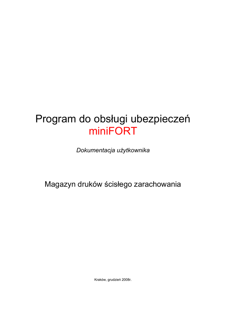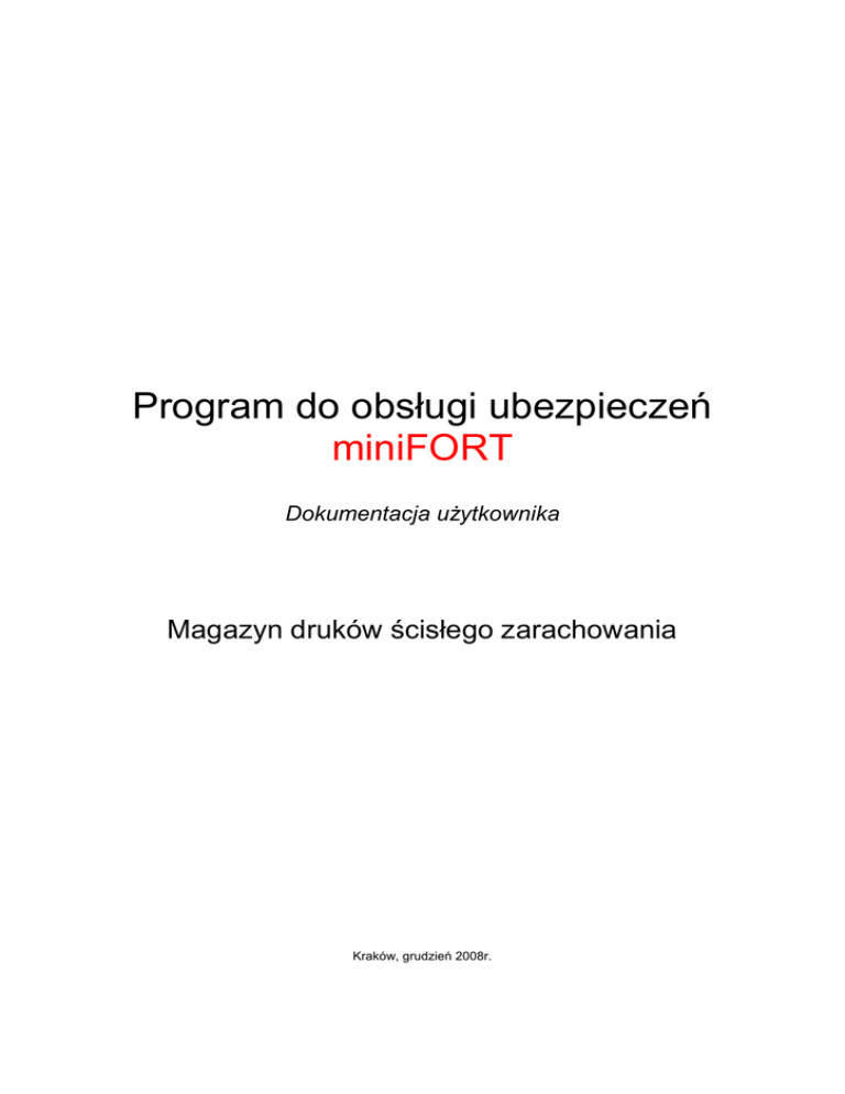 Program do obsługi ubezpieczeń miniFORT Dokumentacja uŜytkownika Magazyn druków ścisłego zarachowania Kraków, grudzień 2008r. Program do obsługi ubezpieczeń miniFORT - dokumentacja uŜytkownika Prowadzenie magazynu druków ścisłego zarachowania Moduł obsługi magazynu druków ścisłego zarachowania umoŜliwia kontrolę druków pobieranych od TU, wydawanych Agentom pracującym na rzecz Agencji, druków wykorzystanych (wypisanych i anulowanych) oraz zwracanych do TU. Prowadzenie Magazynu składa się z następujących etapów: - rejestrowaniu pobrań i zwrotów druków TU <-> Agencja <-> Agent - rejestrowaniu druków wykorzystanych (sprzedanych oraz anulowanych) - śledzenia stanu magazynu, robienie zestawień stanu magazynu dla Agentów bądź zbiorczych zestawień dla TU W części poniŜszej opiszemy pobrania i zwroty niewykorzystanych druków. Rejestrowanie druków wykorzystanych i odnotowywanie tego faktu na magazynie odbywa się automatycznie w momencie wprowadzania polis, wpłat rat na kwitariuszach, oraz druków anulowanych. Agent „magazynowy” W przypadku Agencji, na rzecz której pracuje wielu Agentów, jeden z Agentów wprowadzonych do wykazu Agentów powinien pełnić rolę „magazynu” Agencji. Pusta baza danych, która powstaje po zainstalowaniu programu zawiera takiego przykładowego Agenta – jest nim tzw. SZAFA. Reprezentuje on zwykle szafę pancerną w której Agencja przechowuje druki pobrane od TU. Agenta „magazynowego’ moŜemy ustawić w administracji magazynu druków ścisłego zarachowania. Dostępne pod: Ubezpieczenia / Majątkowe / Administracja / Magazyn druków ścisłego zarachowania Wprowadzanie dokumentu magazynowego Wprowadzenie dokumentu magazynowego (protokołu) jest jedyną formą wprowadzenia druków ścisłego zarachowania na stan magazynu, przekazania druków Agentowi bądź zwrotu do TU. Dokument taki ma budowę dwustopniową: składa się z nagłówka dokumentu zawierającego informacje: 1 Program do obsługi ubezpieczeń miniFORT - dokumentacja uŜytkownika rodzaj przekazania – przekazanie druku między stronami Dostępne jest kilka typowych przekazań operacji na drukach: data pobrania / przekazania - data dokumentu magazynowego, data przekazania druków między stronami od - symbol TU lub Agenta od którego pobieramy druki do - symbol TU lub Agenta któremu przekazujemy druki oraz pól opisujących bloczki druków. Towarzystwo – symbol TU którego pobieramy druki rodzaj druku - w liście podpowiedzi pokazują się symbole druków odpowiednich dla danego TU. bloczek od numeru druku - w polu tym umieszczamy serię i numer pierwszego druku w bloczku do - seria i numer ostatniego druku w bloczku. Przy wejściu do tego pola domyślnie ustawia się w nim wartość pola „od numeru”. Najłatwiejszą metodą na ustawienie końcowego numeru jest skasowanie kilku ostatnich cyfr (klawisz Backspace) i uzupełnienie do poprawnej wartości numeru. Po zaakceptowaniu tego pola ustawia się wartość pola liczba druków. 2 Program do obsługi ubezpieczeń miniFORT - dokumentacja uŜytkownika Aby uzupełnić informację o przekazywanych bloczkach naciskamy przycisk „Nowy bloczek”. Jednym dokumentem przekazania druków od TU na Agencję moŜemy przekazać dowolną liczbę bloczków róŜnych druków ale tylko z jednego TU. JeŜeli jednak dokument opisuje operacje między Agentami i Agencją (Agencja <-> Agent bądź Agent <-> Agent) to jednym dokumentem moŜemy przekazywać dowolną ilość bloczków druków z dowolnej liczby TU. Aby operacja opisana protokołem zmieniła stan druków, tzn. aby druki znalazły się na magazynie naleŜy wykonać przekazanie przez naciśnięcie przycisku „Wykonaj”. Poprawne przekazanie druków oznajmi komunikat: Zatwierdzenie tego komunikatu spowoduje uaktualnienie stanu magazynu zgodnie o opisem protokołu. JeŜeli więc był to dokument TU -> Agencja, to na stan magazynu zostaną wpisane odpowiednie bloczki a jeŜeli było to przekazanie między Agentami (bądź Agencją a Agentem) to druk na stanie magazynu zmieni swojego właściciela. Wykonanie operacji jest nieodwracalne i powoduje zablokowanie edycji protokołu. Dostępne pod: Ubezpieczenia \ Majątkowe \ Magazyn \ Nowe Przekazanie bloczków lub Ubezpieczenia \ Majątkowe \ Magazyn \ Poprzednie przekazania bloczków \ Edycja \ Nowy Powody niewykonania przekazania druków według protokołu Operacja przekazania druków opisana protokołem moŜe być niemoŜliwa do wykonania. JeŜeli w czasie próby przekazania druków system wykryje taką sytuację to: - komunikuje o tym operatora: wyświetlana jest informacja o powodzie przerwania operacji. - przy bloczku będącym powodem błędu umieszcza informację o błędzie - rezygnuje z wykonania przekazania wszystkich bloczków wchodzących w skład protokołu. W przypadku takim naleŜy wyjaśnić powód przerwania operacji, wyjaśnić stan druku powodującego problem, poprawić błędny bloczek, po czym spróbować wykonać dokument magazynowy po raz kolejny. I tak postępujemy aŜ do pełnego sukcesu. Dla kaŜdego z druków który przekazujemy muszą być spełnione warunki: - druk musi być na stanie Agenta który przekazuje druki (warunek ten nie musi być spełniony jeŜeli pobieramy druki z Towarzystwa) - druk musi być na magazynie i nie moŜe być z Ŝaden sposób wykorzystany (tzn. nie moŜe być sprzedany, anulowany lub zwrócony). 3 Program do obsługi ubezpieczeń miniFORT - dokumentacja uŜytkownika Przeglądanie dokumentów magazynowych Do wcześniej wprowadzonych dokumentów moŜna wrócić uŜywając parametrów filtrujących. Określamy zakres czasowy, który nas interesuje oraz stronę (Agenta, magazyn Agencji lub TU) operacji magazynowych. Po dokonanym wyborze pokaŜą się te dokumenty, dla których wybrany Agent (TU) jest stroną przyjmującą lub wydającą (ewentualnie zwracającą) bloczki druków. JeŜeli chcemy uzyskać pełną informację o protokole to po wybraniu Ŝąda