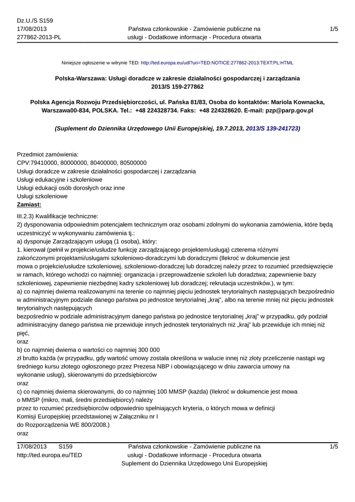 Dz.U./S S159 17/08/2013 277862-2013-PL Państwa członkowskie - Zamówienie publiczne na usługi - Dodatkowe informacje - Procedura otwarta 1/5 Niniejsze ogłoszenie w witrynie TED: http://ted.europa.eu/udl?uri=TED:NOTICE:277862-2013:TEXT:PL:HTML Polska-Warszawa: Usługi doradcze w zakresie działalności gospodarczej i zarządzania 2013/S 159-277862 Polska Agencja Rozwoju Przedsiębiorczości, ul. Pańska 81/83, Osoba do kontaktów: Mariola Kownacka, Warszawa00-834, POLSKA. Tel.: +48 224328734. Faks: +48 224328620. E-mail: [email protected] (Suplement do Dziennika Urzędowego Unii Europejskiej, 19.7.2013, 2013/S 139-241723) Przedmiot zamówienia: CPV:79410000, 80000000, 80400000, 80500000 Usługi doradcze w zakresie działalności gospodarczej i zarządzania Usługi edukacyjne i szkoleniowe Usługi edukacji osób dorosłych oraz inne Usługi szkoleniowe Zamiast: III.2.3) Kwalifikacje techniczne: 2) dysponowania odpowiednim potencjałem technicznym oraz osobami zdolnymi do wykonania zamówienia, które będą uczestniczyć w wykonywaniu zamówienia tj.: a) dysponuje Zarządzającym usługą (1 osoba), który: 1. kierował (pełnił w projekcie/usłudze funkcję zarządzającego projektem/usługą) czterema różnymi zakończonymi projektami/usługami szkoleniowo-doradczymi lub doradczymi (Ilekroć w dokumencie jest mowa o projekcie/usłudze szkoleniowej, szkoleniowo-doradczej lub doradczej należy przez to rozumieć przedsięwzięcie w ramach, którego wchodzi co najmniej: organizacja i przeprowadzenie szkoleń lub doradztwa; zapewnienie bazy szkoleniowej, zapewnienie niezbędnej kadry szkoleniowej lub doradczej; rekrutacja uczestników.), w tym: a) co najmniej dwiema realizowanymi na terenie co najmniej pięciu jednostek terytorialnych następujących bezpośrednio w administracyjnym podziale danego państwa po jednostce terytorialnej „kraj”, albo na terenie mniej niż pięciu jednostek terytorialnych następujących bezpośrednio w podziale administracyjnym danego państwa po jednostce terytorialnej „kraj” w przypadku, gdy podział administracyjny danego państwa nie przewiduje innych jednostek terytorialnych niż „kraj” lub przewiduje ich mniej niż pięć, oraz b) co najmniej dwiema o wartości co najmniej 300 000 zł brutto każda (w przypadku, gdy wartość umowy została określona w walucie innej niż złoty przeliczenie nastąpi wg średniego kursu złotego ogłoszonego przez Prezesa NBP i obowiązującego w dniu zawarcia umowy na wykonanie usługi), skierowanymi do przedsiębiorców oraz c) co najmniej dwiema skierowanymi, do co najmniej 100 MMSP (każda) (Ilekroć w dokumencie jest mowa o MMSP (mikro, mali, średni przedsiębiorcy) należy przez to rozumieć przedsiębiorców odpowiednio spełniających kryteria, o których mowa w definicji Komisji Europejskiej przedstawionej w Załączniku nr I do Rozporządzenia WE 800/2008.) oraz 17/08/2013 S159 http://ted.europa.eu/TED Państwa członkowskie - Zamówienie publiczne na usługi - Dodatkowe informacje - Procedura otwarta Suplement do Dziennika Urzędowego Unii Europejskiej 1/5 Dz.U./S S159 17/08/2013 277862-2013-PL Państwa członkowskie - Zamówienie publiczne na usługi - Dodatkowe informacje - Procedura otwarta 2/5 2. posiada wykształcenie wyższe kierunkowe związane z zarządzaniem lub studia podyplomowe związane z zarządzaniem oraz 3. posiada udokumentowaną wiedzę w zakresie zarządzania projektami tzn. ukończone studia MBA, MPA lub podyplomowe z zakresu zarządzania projektami lub certyfikat PRINCE2 lub certyfikat równoważny lub ukończone szkolenie (co najmniej 30 godzin) z zakresu zarządzania projektami, którego program obejmował co najmniej zagadnienia związane z zarządzaniem zakresem projektu, czasem, kosztami, jakością, ryzykiem, zasobami ludzkimi, komunikacją i zleceniami w projekcie oraz 4. biegle posługuje się językiem polskim w mowie i piśmie; b) dysponuje Specjalistami ds. doradztwa (2 osoby), gdzie każdy z nich: 1. kierował lub nadzorował prace zespołu, który opracował (zespół), co najmniej 10 planów strategii rozwoju lub planów rozwoju dla przedsiębiorców sektora MMSP i plany te zostały przyjęte do wdrożenia przez organy statutowe, u co najmniej 10 powyżej wskazanych przedsiębiorców oraz 2. posiada wykształcenie wyższe oraz 3. posiada biegłą znajomość języka polskiego w mowie i w piśmie oraz 4. posiada wiedzę i doświadczenie w obszarze społecznej odpowiedzialności, tj.: a) posiada doświadczenie w pracy zawodowej (co najmniej 120 dni pracy) polegającej na wdrażaniu elementów związanych ze społeczną odpowiedzialnością biznesu u co najmniej 6 przedsiębiorców lub b) posiada doświadczenie w pracy zawodowej (co najmniej 60 dni pracy) polegającej na wdrażaniu elementów związanych ze społeczną odpowiedzialnością biznesu u co najmniej 3 przedsiębiorców oraz potwierdzony udział w co najmniej 64 godzinach szkoleń/kursów poświęconych tematyce społecznej odpowiedzialności biznesu oraz 5. opracował co najmniej 20 planów strategii rozwoju lub planów rozwoju dla przedsiębiorców sektora MMSP i plany te zostały przyjęte do wdrożenia przez organy statutowe, u co najmniej 20 powyżej wskazanych przedsiębiorców; c) dysponuje Specjalistami ds. rekrutacji (2 osoby), gdzie każdy z nich: 1. posiada doświadczenie w prowadzeniu działań rekrutacyjnych w co najmniej dwóch zakończonych projektach/usługach szkoleniowo-doradczych lub doradczych skierowanych do przedsiębiorców i pracowników sektora MMSP, przy czym: a) wartość każdego z projektów/usług nie może być niższa niż 300 000 zł brutto (w przypadku, gdy wartość umowy została określona w walucie innej niż złoty przeliczenie nastąpi wg średniego kursu złotego ogłoszonego przez Prezesa NBP i obowiązującego w dniu zawarcia umowy na wykonanie usługi), b) łącznie projekty/usługi były skierowane do co najmniej 200 pracowników od co najmniej 100 przedsi