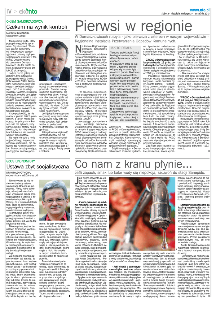 IV > ekonto www.nto.pl Sobota - niedziela 31 sierpnia - 1 września 2013 OKIEM SAMORZĄDOWCA Pierwsi w regionie Czekam na wynik kontroli MARIUSZ KOZACZEK, wójt gminy Lubrza N URZĄD GMINY LUBRZA prowadzoną - pod kątem nowej ustawy śmieciowej przez NIK. Czekam na wystąpienie pokontrolne, ale czekam bez obaw. Najwyższa Izba Kontroli pytała też mieszkańców o funkcjonowanie ustawy u nas. Co powiedzieli, nie wiem. Ci, którzy byli w urzędzie, chwalą sobie nasz system. Jeśli jakąś karę otrzymam, o czym się wciąż dużo mówi, to na pewno ruszy cała machina odwołań. Jeśli będzie trzeba, aż po trybunał w Strasburgu. To będzie długa droga. Zdecydowana większość samorządowców nie ma u siebie zakładu komunalnego. W naszym regionie zostałem sam. W kraju takich gmin jak nasza jest 17 na dwa tysiące. Robię swoje i czekam. ❚ - W procesie mechanicznego przetwarzania tych odpadów wydzielana jest frakcja biodegradowalna, wymagająca zastosowania procesów biologicznego przetwarzania - wyjaśnia Artur Pieczarka, rzecznik prasowy Urzędu Miejskiego w Nysie. - Stąd realizacja kolejnej inwestycji przez gminną spółkę „EKOM”. Uroczystego uruchomienia nowej instalacji dokonano w ostatnim dniu lipca 2013 r. W ramach II etapu rozbudowy RCGO zakończono już budowę: instalacji stabilizacji tlenowej frakcji biodegradowalnej zmieszanych odpadów komunalnych, kompostownię odpadów zielonych selektywnie zbieranych i zbiornika odcieków z przepompownią. Dzięki ostatnim in- GŁOS EKONOMISTY JAK TO DZIAŁA Tlenowa stabilizacja frakcji biodegradowalnej odpadów odbywa się w dwóch etapach. W pierwszym przez co najmniej 2 tygodnie proces odbywa się w zamkniętym reaktorze (tunelu Biodome) z aktywnym napowietrzeniem oraz ujęciem i oczyszczeniem gazów procesowych. Ten etap odbywa się poprzez wtłaczanie powietrza o odpowiedniej zawartości tlenu, temperaturze oraz wilgotności. Ostatnim elementem procesu jest dojrzewanie kompostu na pryzmach trwa ono przez okres około 8 tygodni. Zastosowana technologia spełnia wszystkie przepisy i wytyczne, zarówno krajowe, jak i Unii Europejskiej. westycjom realizowanym w RCGO w Domaszkowicach, centrum to zyskało status Regionalnej Instalacji Przetwarzania Odpadów Komunalnych, czyli instalacji spełniającej wszystkie wymogi związane z gospodarowaniem odpadami. Dzięki inwestycjom w Domaszkowicach zostanie wydłużo- gania Unii Europejskiej są takie, że na składowiska ma odpadów trafiać jak najmniej. Trzeba będzie je odzyskiwać. I to w centrum w Domaszkowicach już się udaje. Oznacza to także zmniejszenie opłat do urzędu marszałkowskiego z tytułu korzystania ze środowiska. - Dla mieszkańców korzyść z tego jest taka, że koszt odbioru odpadów w naszej gminie jest stosunkowo niewielki i wynosi 8 zł - dodaje Jolanta Barska. - W innych miastach są to zwykle znacznie większe pieniądze. na żywotność składowiska w związku z coraz mniejszym strumieniem odpadów, który będzie kierowany na kwatery. Z RCGO w Domaszkowicach korzysta obecnie 19 gmin z południowych rejonów województw opolskiego i dolnośląskiego. Swoim zasięgiem obejmuje ono aż 210 tys. mieszkańców. - Powstanie regionalnego centrum jest dla nas niezwykle korzystne - uważa burmistrz Nysy Jolanta Barska. - Podpisaliśmy umowy z wieloma gminami, które płacą za składowanie odpadów w naszej pierwszej na Opolszczyźnie - Regionalnej Instalacji Przetwarzania Odpadów Komunalnych, gdzie my te odpady sortujemy. Chcę podkreślić, że Regionalne Centrum Gospodarki Odpadami to jest normalne przedsiębiorstwo. Już zatrudniamy tam ludzi na dwie zmiany. Wkrótce prawdopodobnie trzeba będzie uruchomić trzecią zmianę. A to oznacza dodatkowe miejsca pracy na naszym terenie. Obecnie pracuje tam około 20 osób, w przyszłości będzie ich 30. Okazuje się, że od 1 lipca trafia do RCGO znacznie więcej odpadów niż przewidywaliśmy. Zdaniem pani burmistrz, nowa inwestycja jest niezwykle potrzebna, skoro wyma- W RCGO w Domaszkowicach są już kolejne plany inwestycyjne. Chodzi o pozyskiwanie biogazu i wytwarzanie energii elektrycznej. Obecnie projektowana jest odpowiednia instalacja oraz gromadzona jest dokumentacja przetargowa. Innowacyjne inwestycje mają powstać w 2014 roku. Ich realizacja jest możliwa dzięki wdrożeniu projektu współfinansowanego przez Unię Europejską ze środków Funduszu Spójności w ramach Programu Infrastruktura i Środowisko. Wartość projektu wyniesie 21,4 mln zł, a wartość dofinansowania z Brukseli - 13,7 mln zł. ❚ Co nam z kranu płynie... Ustawa zbyt socjalistyczna Jeśli zapach, smak lub kolor wody cię niepokoją, zadzwoń do stacji Sanepidu. DR WITOLD POTWORA, ekonomista w WSZiA oraz UO J est rzeczą oczywistą, że woda i jej produkty są niezbędne do wszystkich procesów życiowych człowieka. Skład wody płynącej w naszych kranach zależy od jej pochodzenia, procesu uzdatniania i systemu dystrybucji. PAWEŁ STAUFFER Nie ukrywam, że nie jestem entuzjastą ustawy śmieciowej. Ona mi się nie podoba. Firmy, które odbierają odpady od mieszkańców, wyłania się drogą przetargu zgodnie z ustawą o zamówieniach publicznych. Wiemy, że w ostatnich latach tam, gdzie są zamówienia, wygrywają oferty najtańsze, a niekoniecznie najlepsze. Teoretycznie gminy mogłyby zarabiać na sprzedaży posegregowanych śmieci szkła, plastiku itd. Ale to też chyba się nie uda. Niekorzystne jest to, że ustawa śmieciowa wyeliminowała konkurencję. A w gospodarce rynkowej, jak nie ma konkurencji, dochodzi do nieprawidłowości. Obawiam się, że wyłonieni w przetargach operatorzy z czasem niekoniecznie będą świadczyli najlepsze usługi. Za niedobrą ekonomicznie uważam też zasadę, że placimy nie od ilości wytworzonych śmieci, lecz według innych zasad - od liczebności rodziny czy powierzchni mieszkania albo ilości zużytej wody. Znam argumentację, że skoro opłata nie zależy od ilości śmi