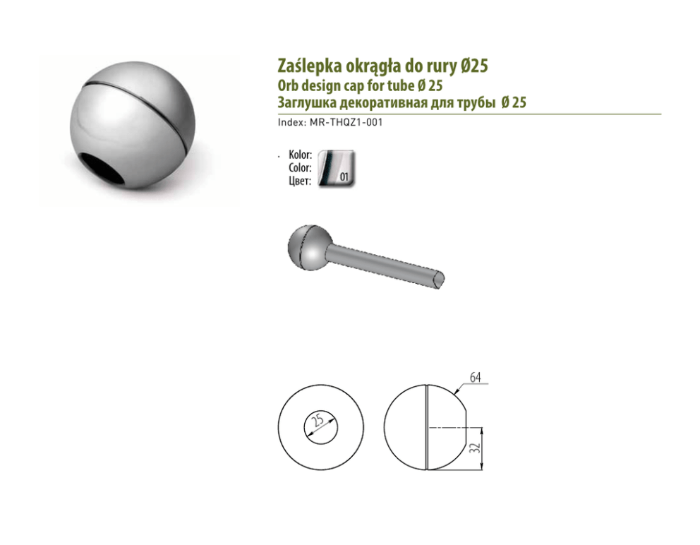 Zaślepka okrągła do rury Ø25 Orb design cap for tube Ø 25 Заглушка декоративная для трубы Ø 25 Index: MR-THQZ1-001 Kolor: Color: Цвет: • 64 32 25