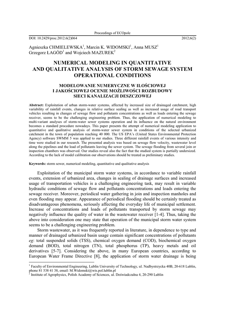 Proceedings of ECOpole DOI: 10.2429/proc.2012.6(2)064 2012;6(2) Agnieszka CHMIELEWSKA1, Marcin K. WIDOMSKI1, Anna MUSZ1 Grzegorz ŁAGÓD1 and Wojciech MAZUREK2 NUMERICAL MODELING IN QUANTITATIVE AND QUALITATIVE ANALYSIS OF STORM SEWAGE SYSTEM OPERATIONAL CONDITIONS MODELOWANIE NUMERYCZNE W ILOŚCIOWEJ I JAKOŚCIOWEJ OCENIE MOŻLIWOŚCI ROZBUDOWY SIECI KANALIZACJI DESZCZOWEJ Abstract: Exploitation of urban storm-water systems, affected by increased size of drainaged catchment, high variability of rainfall events, changes in relative surface sealing as well as increased usage of road transport vehicles resulting in changes of sewage flow and pollutants concentrations as well as loads entering the sewage receiver, seems to be the challenging engineering problem. Thus, the application of numerical modeling to multi-variant analyses of storm-water sewer systems operation and its influence on the natural environment becomes a standard procedure nowadays. This paper presents the attempt of numerical modeling application to quantitative and qualitative analysis of storm-water sewer system in conditions of the selected urbanized catchment in the town of population reaching 40 000. The US EPA’s (United States Environmental Protection Agency) software SWMM 5 was applied to our studies. Three different rainfall events of various intensity and time were studied in our research. The presented analysis was based on sewage flow velocity, wastewater level along the pipelines and the load of pollutants leaving the sewer system. The sewage flooding from several join or inspection chambers was observed. Our studies reveal also the fact that the studied system is partially undersized. According to the lack of model calibration our observations should be treated as preliminary studies. Keywords: storm sewer, numerical modeling, quantitative and qualitative analysis Exploitation of the municipal storm water systems, in accordance to variable rainfall events, extension of urbanized area, changes in sealing of drainage surfaces and increased usage of transportation vehicles is a challenging engineering task, may result in variable hydraulic conditions of sewage flow and pollutants concentrations and loads entering the sewage receiver. Moreover, periodical water gathering in join and inspection manholes and even flooding may appear. Appearance of periodical flooding should be certainly treated as disadvantageous phenomena, seriously affecting the everyday life of municipal settlement. Increase of concentrations and loads of pollutants transported by storm sewage may negatively influence the quality of water in the wastewater receiver [1-4]. Thus, taking the above into consideration one may state that operation of the municipal storm water system seems to be a challenging engineering problem. Storm wastewater, as it was frequently reported in literature, in dependence to type and manner of drainaged urbanized basin usage contain significant concentrations of pollutants eg: total suspended solids (TSS), chemical oxygen demand (COD), biochemical oxygen demand (BOD), total nitrogen (TN), total phosphorus (TP), heavy metals and oil derivatives [5-7]. Considering the above, in many European countries, according to European Water Frame Directive [8], the application of storm water drainage is being 1 Faculty of Environmental Engineering, Lublin University of Technology, ul. Nadbystrzycka 40B, 20-618 Lublin, phone 81 538 41 38, email: [email protected] 2 Institute of Agrophysics, Polish Academy of Sciences, ul. Doświadczalna 4, 20-290 Lublin 488 Agnieszka Chmielewska, Marcin K. Widomski, Anna Musz, Grzegorz Łagód and Wojciech Mazurek limited in favor of solutions based on collection and treatment of storm sewage in location of their generation [9, 10]. Hence, the analysis of increased discharge of storm sewage effect on receiver’s water quality conducted at the stage of storm water network extension designing seems to be requisitive. Management of the complex storm water systems for different rainfall events and various possible manners of network development for basins of different degree of sealing may be supported by numerical modeling. One of the most popular models applied in multivariate calculations is SWMM 5 (Storm Water Management Model) by United States Environmental Protection Agency (US EPA). This model allows dynamic quantitative and qualitative calculations of storm water network operation - the quality of offered calculations were repeatedly positively verified [4, 11, 12]. Presented studies focused on quantitative and qualitative analysis of storm water sewer system operation for the city of Swidnik, Poland. Our researches were based on numerical calculations conducted by SWMM 5. Flow velocity of storm wastewater, canals filling height as well as concentrations and loads of TSS at discharge location were selected as factors of our analyses. Materials and methods 2 The modeled basin of area 2.47 km covered the municipal system of storm water drainage the town of Swidnik, Poland. The total length of storm water system reached the value of approx. 48 km constructed of concrete pipes of diameters from DN 200 to DN 1600. Storm wastewaters are delivered to melioration drainage ditch and then to the Stawek-Stoki river. Fig. 1. Scheme of modeled basin Numerical calculations of studied storm water network were conducted by SWMM 5 [13]. The numerical model of existing network, based on documentation accessed by 489 Numerical modeling in quantitative and qualitative analysis of storm sewage system operational … system operator, is consisting of 500 subcatchments, 473 nodes, 476 lines and sewage receiver. Geometrical characteristics of the existing system and hydraulic parameters of pipes were read from the map and selected from SWMM 5 documentation [14]. The developed model was presented in Figure 1. Our numerical calculations were conducted for three different rainfall events (various intensity and duratio