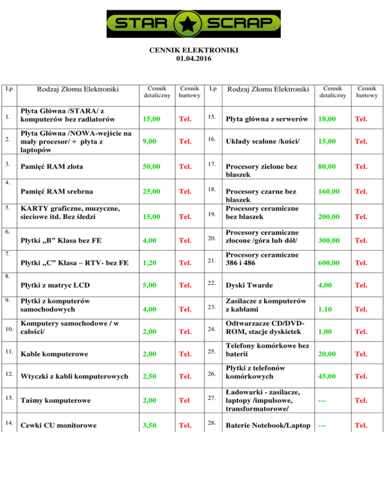 CENNIK ELEKTRONIKI 01.04.2016 Rodzaj Złomu Elektroniki