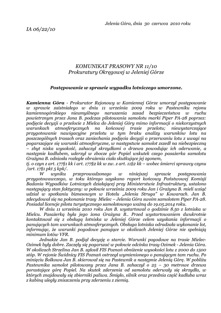 Jelenia Góra, dnia 30 czerwca 2010 roku IA 06/22/10 KOMUNIKAT PRASOWY NR 11/10 Prokuratury Okręgowej w Jeleniej Górze Postępowanie w sprawie wypadku lotniczego umorzone. Kamienna Góra - Prokurator Rejonowy w Kamiennej Górze umorzył postępowanie w sprawie zaistniałego w dniu 11 września 2009 roku w Pastewniku rejonu kamiennogórskiego nieumyślnego naruszenia zasad bezpieczeństwa w ruchu powietrznym przez Jana B. podczas pilotowania samolotu marki Piper PA-28 poprzez: podjęcie decyzji o przelocie z Mielca do Jeleniej Góry mimo informacji o niekorzystnych warunkach atmosferycznych na końcowej trasie przelotu; niewystarczające przygotowanie nawigacyjne przelotu w tym braku analizy warunków lotu na poszczególnych trasach oraz zaniechania podjęcia decyzji o przerwaniu lotu z uwagi na pogarszające się warunki atmosferyczne, w następstwie samolot zszedł na niebezpieczną – zbyt niska wysokość, zahaczył skrzydłami o drzewa powodując ich oderwanie, a następnie kadłubem, uderzył w zbocze gór Popiel wskutek czego pasażerka samolotu Grażyna B. odniosła rozległe obrażenia ciała skutkujące jej zgonem, tj. o czyn z art. 177§1 kk i art. 177§2 kk w zw. z art. 11§2 kk – wobec śmierci sprawcy czynu /art. 17§1 pkt 5 kpk/. W wyniku przeprowadzonego w niniejszej sprawie postępowania przygotowawczego, w toku którego uzyskano raport końcowy Państwowej Komisji Badania Wypadków Lotniczych działającej przy Ministerstwie Infrastruktury, ustalono następujący stan faktyczny: w połowie września 2009 roku Jan i Grażyna B. mieli wziąć udział w spotkaniu biznesowym w Hotelu „Jelenia Struga” w Kowarach. Jan B. zdecydował się na pokonanie trasy Mielec – Jelenia Góra swoim samolotem Piper PA-28. Posiadał licencje pilota turystycznego samolotowego ważną do 19.05.2014 roku. W dniu 11 września 2010 roku Jan B. wystartował o godzinie 8.50 z lotniska w Mielcu. Pasażerką była jego żona Grażyna B.. Przed wystartowaniem dwukrotnie kontaktował się z obsługą lotniska w Jeleniej Górze celem uzyskania informacji o panujących tam warunkach atmosferycznych. Obsługa lotniska odradzała wykonanie lot, informując, że warunki pogodowe panujące w okolicach Jeleniej Górze nie spełniają minimum lotów VFR. Jednakże Jan B. podjął decyzję o starcie. Warunki pogodowe na trasie MielecOzimek były dobre. Zaczęły się pogarszać w połowie odcinka trasy Ozimek - Jelenia Góra. W okolicach Strzelina Jan B. zgłosił FIS Poznań obniżenie wysokości lotu z 2000 do 1500 stóp. W rejonie Świdnicy FIS Poznań ostrzegł wymienionego o panującym tam ruchu. Po minięciu Bolkowa Jan B. skierował się na Pastewnik a następnie Jelenią Górę. W pobliżu Pastewnika samolot pilotowany przez Jana B. zahaczył o 25 – 30 metrowe drzewa porastające górę Popiel. Na skutek zderzenia od samolotu oderwały się skrzydła, w których znajdowały się zbiorniki paliwa. Śmigło, silnik oraz przednia część kadłuba wraz z kabiną uległy zniszczeniu przy zderzeniu z ziemią. -2– Przybyli na miejsce zdarzenia mieszkańcy Pastewnika odnaleźli rozbity samolot, a w nim nieżyjącego Jana B. oraz Grażynę B., która zmarła w drodze do szpitala. Z opinii opracowanej przez Instytut Ekspertyz Sądowych im. Prof. Dra Jana Sehna w Krakowie wynika, że w chwili zdarzenia krew i mocz w/wym. były wolne od alkoholu, środków odurzających, substancji psychotropowych. Analiza zgromadzonego materiału dowodowego, a w szczególności raportu końcowego Państwowej Komisji Badania Wypadków Lotniczych wskazuje, że przyczynami wypadku lotniczego były: - podjęcie decyzji o wykonaniu przelotu mimo wiedzy, że na końcowym odcinku trasy warunki meteorologiczne uniemożliwiają bezpieczny dolot do lotniska docelowego, - niewystarczające przygotowanie nawigacyjne przelotu, w tym przede wszystkim brak rzetelnej analizy warunków lotu na poszczególnych odcinkach trasy, - brak decyzji o przerwaniu lotu do lotniska docelowego, kiedy warunki meteorologiczne na trasie lotu uległy pogorszeniu, znacznie poniżej minimów określonych w uprawnieniach pilota. Zdaniem Komisji okolicznością sprzyjającą zaistnieniu wypadku było małe doświadczenie i brak krytycznej oceny własnych umiejętności przez pilota–dowódcę statku powietrznego, który licencję pilota otrzymał w dniu 9 maja 2009 roku. Stan techniczny samolotu marki Piper PA-28-181 był dobry i posiadał poświadczenie przeglądu zdatności do lotu ważne do dnia 26 lutego 2010 roku. Powyższe okoliczności wskazują, że Jan B. w sposób nieumyślny naruszył zasady bezpieczeństwa w ruchu powietrznym. Skutkiem jego błędnych decyzji był wypadek lotniczy, w wyniku którego śmierć poniósł on oraz jego żona. Z tych tez względów wypadek lotniczy, w wyniku którego śmierć poniósł on oraz jego żona, prowadzone postępowanie przygotowawcze umorzono wobec śmierci sprawcy tj. na podstawie art. 17§1 pkt 5 kpk Rzecznik Prasowy Prokuratury Okręgowej w Jeleniej Górze Violetta Niziołek