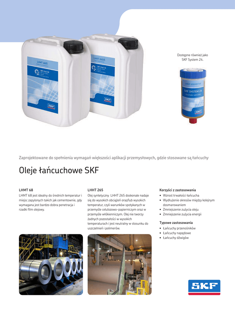 Dostępne również jako SKF System 24. Zaprojektowane do spełnienia wymagań większości aplikacji przemysłowych, gdzie stosowane są łańcuchy Oleje łańcuchowe SKF LHMT 68 LHHT 265 Korzyści z zastosowania LHMT 68 jest idealny do średnich temperatur i miejsc zapylonych takich jak cementownie, gdy wymagana jest bardzo dobra penetracja i rzadki film olejowy. Olej syntetyczny LHHT 265 doskonale nadaje się do wysokich obciążeń oraz/lub wysokich temperatur, czyli warunków spotykanych w przemyśle celulozowo-papierniczym oraz w przemyśle włókienniczym. Olej nie tworzy żadnych pozostałości w wysokich temperaturach i jest neutralny w stosunku do uszczelnień i polimerów. • Wzrost trwałości łańcucha • Wydłużenie okresów między kolejnym dosmarowaniem • Zmniejszenie zużycia oleju • Zmniejszenie zużycia energii Typowe zastosowania • Łańcuchy przenośników • Łańcuchy napędowe • Łańcuchy dźwigów Dane techniczne Oznaczenie LHMT 68 LHHT 265 Opis Olej do średnich temperatur Olej do wysokich temperatur Ciężar właściwy 0.85 0.92 Kolor Żółto - brązowy Żółto - pomarańczowy Typ oleju bazowego Mineralny Syntetyczny estrowy Zakres temperatury pracy –15 do +90 °C (5 do 194 °F) Do 250 °C (482 °F) Lepkość oleju bazowego: 40 °C (104 °F), mm²/s 100 °C (212 °F), mm²/s ISO VG 68 około 9 około 265 około 30 Temperatura zapłonu >200 °C (392 °F) około 260 °C (500 °F) Temperatura krzepnięcia <-15 °C (5 °F) nie dotyczy Zatwierdzenie NSF nie dotyczy nie dotyczy Sposób zamawiania Olej łańcuchowy LHMT 68 LHHT 265 Opis Olej do średnich temperatur Olej do wysokich temperatur Kanister 5 litrów LHMT 68/5 LHHT 265/5 SKF SYSTEM 24 Seria LAGD Zespół o poj. 60 ml Zespół o poj. 125 ml LAGD 60/HMT68* LAGD 125/HMT68* – LAGD 125/HHT26* Seria LAGE Kompletny zespół o poj.122 ml Kompletny zespół o poj.250 ml Zestaw uzupełniający 122 ml Zestaw uzupełniający 250 ml LAGE 125/HMT68 LAGE 250/HMT68 LHMT 68/EML125 LHMT 68/EML250 LAGE 125/HHT26 LAGE 250/HHT26 LHHT 265/EML12 LHHT 265/EML25 * Zawiera zawór zwrotny ® SKF jest zarejestrowanym znakiem handlowym Grupy SKF. © Grupa SKF 2012 Zawartość niniejszej publikacji jest chroniona prawem autorskim i nie może być powielana (również we fragmentach) bez uprzedniego uzyskania pisemnego pozwolenia. Wydawca podjął wszelkie starania, aby informacje zawarte w publikacji były dokładne i prawdziwe, jednak nie ponosi żadnej odpowiedzialności za jakiekolwiek straty lub szkody, zarówno bezpośrednie, pośrednie, jak i wtórne, powstałe w wyniku korzystania z informacji zawartych w niniejszej publikacji. PUB MP/P8 12040 PL · Grudzień 2012 www.mapro.skf.com · skf.com/mount · skf.com/lubrication