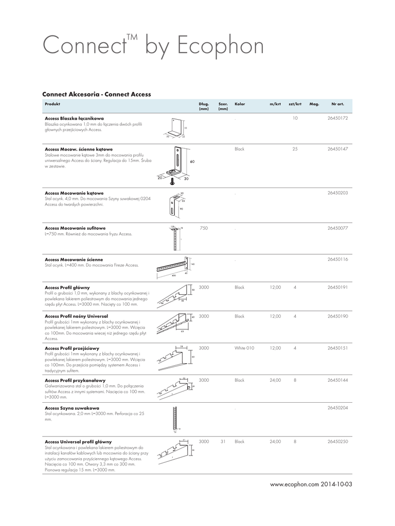 Connect by Ecophon ™ Connect Akcesoria - Connect Access Produkt Dług. (mm) Szer. (mm) Kolor m/krt szt/krt Mag. Nr art. Access Blaszka łącznikowa Blaszka ocynkowana 1,0 mm do łączenia dwóch profili głownych przejściowych Access. . 10 26450172 Access Mocow. ścienne kątowe Stalowe mocowanie kątowe 3mm do mocowania profilu uniwersalnego Access do ściany. Regulacja do 15mm. Śruba w zestawie. Black 25 26450147 Access Mocowanie kątowe Stal ocynk. 4,0 mm. Do mocowania Szyny suwakowej 0204 Access do twardych powierzchni. . 26450203 . 26450077 . 26450116 Access Mocowanie sufitowe L=750 mm. Również do mocowania fryzu Access. 750 Access Mocowanie ścienne Stal ocynk. L=400 mm. Do mocowania Fireze Access. Access Profil główny Profil o grubości 1,0 mm, wykonany z blachy ocynkowanej i powlekana lakierem poliestrowym do mocowania jednego rzędu płyt Access. L=3000 mm. Nacięty co 100 mm. 3000 Black 12,00 4 26450191 Access Profil nośny Universal Profil grubości 1mm wykonany z blachy ocynkowanej i powlekanej lakierem poliestrowym. L=3000 mm. Wcięcia co 100mm. Do mocowania wiecej niż jednego rzędu płyt Access. 3000 Black 12,00 4 26450190 Access Profil przejściowy Profil grubości 1mm wykonany z blachy ocynkowanej i powlekanej lakierem poliestrowym. L=3000 mm. Wcięcia co 100mm. Do przejścia pomiędzy systemem Access i tradycyjnym sufitem. 3000 White 010 12,00 4 26450151 Access Profil przykanałowy Galwanizowana stal o grubości 1,0 mm. Do połączenia sufitów Access z innymi systemami. Nacięcia co 100 mm. L=3000 mm. 3000 Black 24,00 8 26450144 Access Szyna suwakowa Stal ocynkowana. 2,0 mm L=3000 mm. Perforacja co 25 mm. Access Universal profil główny Stal ocynkowana i powlekana lakierem poliestrowym do instalacji kanałów kablowych lub mocownia do ściany przy użyciu zamocowania przyściennego kątowego Access. Nacięcia co 100 mm. Otwory 3,3 mm co 300 mm. Pionowa regulacja 15 mm. L=3000 mm. . 3000 31 Black 26450204 24,00 8 26450250 www.ecophon.com 2014-10-03 Produkt Dług. (mm) Szer. (mm) Access Śruba montażowa Integralne złącze śruby zębatej. Wycięcia na śrubce i podkładce. Kolor m/krt . szt/krt Mag. 50 Nr art. 26450218 Connect Akcesoria - Connect Drewniane listwy okalające Produkt Dług. (mm) Szer. (mm) Kolor m/krt szt/krt Mag. Nr art. Connect Listwa krawędziowa Płyta MDF pokryta folią. L=2500 mm. Profil obwodowy do Focus B oraz F. 2500 38 White 10,00 4 26312570 Connect Listwa krawędziowa Płyta MDF pokryta folią. L=3000 mm. Profil obwodowy do Master B,F oraz Super G B. 3000 45 White 12,00 4 26312571 Connect Listwa obwodowa Profil MDF pokryty folią. L=2500mm. Listwa obwodowa do sufitów wolnowiszących. 2500 45 White 15,00 6 26312572 Kolor m/krt szt/krt Connect Akcesoria - Connect Elementy mocujące & Obce pióra Produkt Dług. (mm) Szer. (mm) White Connect Bolec prowadzący Bolec prowadzący do Solo Baffle, utrzymujący stały dystans 6mm pomiędzy płytami Mag. Nr art. 100 26311768 Connect Końcówka Structure Tłoczony plastik ABS, mocowany na obrzeżach profili Structure. 36 13,2 Connect grey 04 8 26300940 Connect Końcówka Structure Tłoczony plastik ABS, mocowany na obrzeżach profili Structure. 36 13,2 Connect grey 03 8 26300941 Connect white 02 textured 4 26311060 Connect Narożnik Edge Ocynkowany narożnik do profili Edge 500 Connect Narożnik Thinline Lakierowany narożnik z wytłaczanego cynku do profili Connect Thinline. 42 42 Connect grey 04 textured 4 26300965 Connect Narożnik Thinline Lakierowany narożnik z wytłaczanego cynku do profili Connect Thinline. 42 42 Connect grey 03 textured 4 26300966 Connect Narożnik wew. WP Narożnik wewnętrzny z tłoczonego tworzywa sztucznego do profili WP, biały mat 73 73 Connect white 03 4 26311054 www.ecophon.com 2014-10-03 Produkt Dług. (mm) Szer. (mm) Kolor m/krt szt/krt Mag. Connect Narożnik wew. WP Narożnik wewnętrzny z tłoczonego tworzywa sztucznego, do profili WP. 73 73 Connect grey 02 4 26311055 Connect Narożnik wew. WP Narożnik wewnętrzny z tłoczonego tworzywa sztucznego, do profili WP 73 73 Connect black 01 4 26311056 Connect Narożnik zew. WP Narożnik zewnętrzny z tłoczonego tworzywa sztucznego do profili WP 64 64 Connect white 03 4 26311057 Connect Narożnik zew. WP Narożnik zewnętrzny z tłoczonego tworzywa sztucznego do profili WP 64 64 Connect grey 02 4 26311058 Connect Narożnik zew. WP Narożnik zewnętrzny z tłoczonego tworzywa sztucznego, do profili WP 64 64 Connect black 01 4 26311059 Connect Narożnik zewnętrzny Narożnik do cieniowych profili ceowych wykonany z blachy ocynkowanej i powlekanej lakierem poliestrowym 26300556. H=45 mm. Connect white 01 12 26300128 Connect Narożnik zewnętrzny Narożnik do cieniowych profili ceowych wykonany z blachy ocynkowanej i powlekanej lakierem poliestrowym 26300392. H=75 mm. Connect white 01 12 26300393 Connect Narożnik zewnętrzny Narożnik do cieniowych profili ceowych wykonany z blachy ocynkowanej i powlekanej lakierem poliestrowym 26300394. H=94 mm. Connect white 01 12 26300395 Connect Obce pióro Plastik. Do niwelowania. Black 100 * Nr art. 26300219 Connect Obce pióro F Laminowany plastik. L=600 mm. 600 25 Black 50 26300160 Connect Obce pióro F Laminowany plastik. L=600 mm. 600 25 Black 20 26300161 www.ecophon.com 2014-10-03 Produkt Dług. (mm) Szer. (mm) szt/krt Mag. Nr art. White 500 2 * 26300650 Grey 2 26311044 . 12 26300666 Galvanized 50 26300011 Connect Zestaw Ds i Dg Edge Zestaw do profili Connect Edge z systemem Focus Ds/Dg. Zawiera: 4 łączniki śrubowe, 1 klucz gwiazdkowy 2mm, 12 bolców prowadzących, 24 wkręty do profili aluminiowych RTK ST 3,5x9,5, 18 wkrętów RTK 3,5x25, 18 Connect Łączników dystansowych Edge Ds/Dg, 1 przewodnik instalacyjny IG210, 1 przewodnik instalacyjny IG211. White 500 1 26311062 Connect Zestaw E Edge Zestaw do profili Connect Edge z systemem Focus E. Zawiera: 4 łączniki śrubowe, 1 klucz gwiazdkowy 2mm, 12 bolców prowadzących, 24 wkręty do profili aluminiowych RTK ST 3