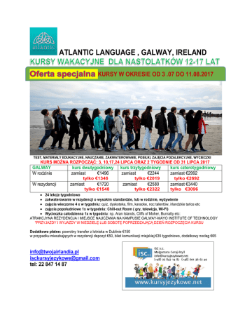 ATLANTIC LANGUAGE , GALWAY, IRELAND KURSY W OKRESIE OD 3 .07 DO 11.08.2017 TEST, MATERIAŁY EDUKACYJNE, NAUCZANIE, ZAKWATEROWANIE, POSIŁKI, ZAJĘCIA POZALEKCYJNE, WYCIECZKI KURS MOŻNA ROZPOCZĄĆ: 3, 10,17,24 LIPCA ORAZ 2 TYGODNIE OD 31 LIPCA 2017 GALWAY kurs dwutygodniowy kurs trzytygodniowy kurs czterotygodniowy W rodzinie zamiast €1496 zamiast €2244 zamiast €2992 tylko €1346 W rezydencji zamiast €1720 tylko €1548 tylko €2019 zamiast tylko €2692 €2580 zamiast €3440 tylko €2322 tylko €3096 24 lekcje tygodniowo zakwaterowanie w rezydencji o wysokim standardzie, lub w rodzinie, wyżywienie zajęcia wieczorne 4 x w tygodniu: quiz, dyskoteka, film, karaoke, noc talentów, irlandzkie tańce etc zajęcia popołudniowe 1x w tygodniu: Chill-out Room ( gry, telewizja, WI-FI) Wycieczka całodzienna 1x w tygodniu: np. Aran Islands, Cliffs of Moher, Bunratty etc: ATRAKCJYNA REZYDENCJA I MIEJSCE NAUCZANIA NA KAMPUSIE GALWAY-MAYO INSTITUTE OF TECHNOLOGY *PRZYJAZDY I WYJAZDY W NIEDZIELĘ LUB SOBOTĘ POPRZEDZAJĄCĄ DZIEŃ ROZPOCZĘCIA KURSU Dodatkowo płatne: powrotny transfer z lotniska w Dublinie €150 w przypadku mieszkających w rezydencji depozyt €50, bilet komunikacji miejskiej €35 tygodniowo, dodatkowy nocleg €65 [email protected] [email protected] tel: 22 847 14 87