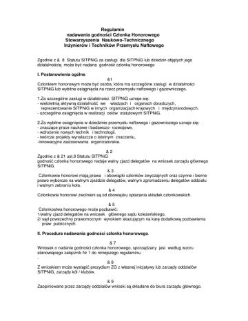 Regulamin nadawania godności Członka Honorowego Stowarzyszenia Naukowo-Technicznego Inżynierów i Techników Przemysłu Naftowego Zgodnie z & 8 Statutu SITPNiG za zasługi dla SITPNiG lub dziedzin objętych jego działalnością może być nadana godność członka honorowego I. Postanowienia ogólne. &1 Członkiem honorowym może być osoba, która ma szczególne zasługi w działalności SITPNiG lub wybitne osiągnięcia na rzecz przemysłu naftowego i gazowniczego. 1.Za szczególne zasługi w działalności SITPNiG uznaje się: - wieloletnią aktywną działalność we władzach i organach doradczych, reprezentowanie SITPNiG w innych organizacjach krajowych i międzynarodowych, - szczególne osiągnięcia w realizacji celów statutowych SITPNiG. 2.Za wybitne osiągnięcia w dziedzinie przemysłu naftowego i gazowniczego uznaje się: - znaczące prace naukowe i badawczo- rozwojowe, - wdrożenie nowych technik i technologii, - twórcze projekty wynalazcze o istotnym znaczeniu, -innowacyjne zastosowania organizatorskie. &2 Zgodnie z & 21 ust.9 Statutu SITPNiG godność członka honorowego nadaje walny zjazd delegatów na wniosek zarządu głównego SITPNiG. &3 Członkowie honorowi mają prawa i obowiązki członków zwyczajnych oraz czynne i bierne prawo wyborcze na walnym zjeździe delegatów, walnym zgromadzeniu delegatów oddziału i walnym zebraniu koła. &4 Członkowie honorowi zwolnieni są od obowiązku opłacania składek członkowskich. &5 Członkostwa honorowego może pozbawić: 1/walny zjazd delegatów na wniosek głównego sądu koleżeńskiego, 2/ sąd powszechny prawomocnym wyrokiem skazującym na karę dodatkową pozbawienia praw publicznych. II. Procedura nadawania godności członka honorowego. &7 Wniosek o nadanie godności członka honorowego, sporządzany jest według wzoru stanowiącego załącznik Nr 1 do niniejszego regulaminu. . &8 Z wnioskiem może wystąpić prezydium ZG z własnej inicjatywy lub zarządy oddziałów SITPNiG, zarządy kół / klubów. &9 Zaopiniowane przez zarządy oddziałów wnioski są składane do biura zarządu głównego. & 10 Wnioski opiniuje główna komisja organizacyjna. & 11 Zaopiniowane przez Główna Komisję organizacyjną wnioski są przedstawiane do zaakceptowania przez zarząd główny SITPNiG. & 12 Zarząd główny typuje wnioski w głosowaniu tajnym, przy czym wymagana jest akceptacja ¾ głosów prawomocnej liczby obecnych na posiedzeniu członków zarządu głównego SITPNiG. & 13 Wnioski zaakceptowane przez Zarząd Główny są przedkładane Walnemu Zjazdowi Delegatów SITPNiG. & 14 Zgodnie z & 58 ust.2 Statutu SITPNiG nadanie godności członka honorowego SITPNiG następuje w głosowaniu tajnym, przy czym wymagana jest akceptacja ¾ głosów prawomocnej liczby obecnych na walnym zjeździe delegatów SITPNiG. & 15 Członek honorowy otrzymuje Dyplom nadania Godności Członka Honorowego / Zał.nr. 2 / Dyplom podpisuje i wręcza podczas obrad walnego zjazdu delegatów przewodniczący walnego zjazdu delegatów SITPNiG. III. Postanowienia końcowe. & 16 1.Niniejszy regulamin zatwierdzono uchwałą nr 102 Zarządu Głównego SITPNiG w dniu 14.12.2006r. 2.Traci moc regulamin zatwierdzony uchwałą Zarządu Głównego SITPNiG w dniu 09.09.1988r. Załącznik Nr 1 do Regulaminu nadawania Godności Członka Honorowego SITPNiG Wniosek o nadanie Godności Członka Honorowego SITPNiG 1 Imię i nazwisko…………………………………………………………… imię ojca……………………… 2.Data i miejsce urodzenia……………………………………………….. 3.Adres domowy…………………………………………………………… 4.Wykształcenie i zawód………………………………………………….. 5.Miejsce pracy i stanowisko……………………………………………… 6 Data wstąpienia do SNT i SITPNiG…………………………………… 7. Posiadane odznaczenia: -państwowe / jakie rok nadania /………………………………………… -odznaki NOT /jakie, rok nadania/……………………………………….. -odznaki honorowe SITPNiG / jakie, rok nadania/…………………… -inne………………………………………………………………………… 8.Działalność w SITPNiG / pełnione funkcje: od …………… do……………………………….. od……………… do………………………………. od……………… do……………………………… 9. Szczególne zasługi w SITPNiG………………………………………. ……………………………………………………………………………….. 10. Wybitne osiągnięcia w dziedzinie przemysłu naftowego i gazowniczego……………………………. 11.Data uchwały Zarządu Koła SITPNiG …………………………………………. ………………………………………………………………………………… sekretarz przewodniczący /podpis/ /podpis/ 12.Data uchwały Zarządu Oddziału ………………………………………………………………………………… sekretarz prezes /podpis/ /podpis/ 13.Opinia Głównej Komisji Organizacyjnej …………………………………………………………………………………. sekretarz przewodniczący /podpis/ / podpis/ 14.Uchwała ZG SITPNiG /nr data, treść/ …………………………………………………………………………………… sekretarz generalny prezes /podpis/ /podpis/ 15.Uchwała WZD SITPNiG /nr data, treść/ ………………………………………………………………………………………… sekretarz WZD SITPNiG przewodniczący WZD SITPNiG /podpis/ /podpis Załącznik Nr 2 do Regulaminu nadawania Godności Członka Honorowego SITPNiG Stowarzyszenie NaukowoNaukowo-Techniczne Inżynierów i Techników Przemysłu Naftowego i Gazowniczego Miejscowość, dnia xx miesiąca xxxx roku X
