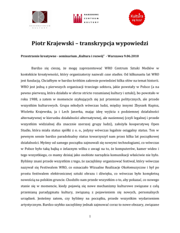 Piotr Krajewski – transkrypcja wypowiedzi Przestrzenie kreatywne - seminarium „Kultura i rozwój” - Warszawa 9.06.2010 Bardzo się cieszę, że mogę zaprezentować WRO Centrum Sztuki Mediów w kontekście kreatywności, który organizatorzy nazwali case studies. Od kilkunastu lat WRO jest fundacją. Chciałbym w bardzo krótkim zakresie powiedzieć kilka słów na temat historii. WRO jest jedną z pierwszych organizacji trzeciego sektora, jakie powstały w Polsce (a na pewno pierwszą, która działała w sferze stricte rozumianej kultury i sztuki), bo powstało w roku 1988, a zatem w momencie szykujących się już przemian politycznych, ale przede wszystkim kulturowych. Grupa młodych wówczas ludzi, między innymi Zbyszek Kupisz, Wioletta Krajewska, ja i Lech Janerka, mając ideę wyjścia z podziemnej działalności alternatywnej w kierunku działalności alternatywnej, ale naziemnej (czyli legalnej i przede wszystkim widzialnej dla znacznie szerszej grupy ludzi), założyła kooperatywę Open Studio, która miała status spółki z o. o., jedyny wówczas legalnie osiągalny status. Ten w pewnym sensie bardzo paradoksalny status towarzyszył nam przez kilka lat początkowej działalności. Myśmy od samego początku zajmowali się nowymi technologiami, co wówczas w Polsce było taką bajką o żelaznym wilku z uwagi na to, że komputerów, kamer wideo i tego wszystkiego, co mamy dzisiaj jako osobiste narzędzia komunikacji właściwie nie było. Byliśmy znani przede wszystkim z tego, że zaczęliśmy organizować festiwal, który wówczas nazywał się Festiwalem WRO, co oznaczało Wizualne Realizacje Okołomuzyczne i był po prostu festiwalem elektronicznej sztuki obrazu i dźwięku, co wówczas było kompletną nowością na polskim gruncie. Chodziło nam przede wszystkim o to, aby pokazać, co nowego stanie się w momencie, kiedy pojawią się nowe mechanizmy kulturowe związane z całą przemianą paradygmatu kultury, związaną z pojawieniem się nowych, personalnych urządzeń. Jesteśmy zatem, czy byliśmy na początku, przede wszystkim wydarzeniem artystycznym. Bardzo szybko zaczęliśmy jednak zajmować coraz to nowe obszary, związane 1 przede wszystkim z szerzej rozumianą działalnością kulturalną. W latach dziewięćdziesiątych uczestniczyliśmy w szerokim międzynarodowym ruchu związanym z pojawieniem się organizacji odwołujących się do tzw. kultury partycypacyjnej, co jest ważne z dzisiejszej perspektywy. W połowie lat dziewięćdziesiątych WRO zostało uznane za centrum innowacji kulturalnej przez kongres Cultural Competence w Austrii, z czego byliśmy dumni, ale co w Polsce nie miało żadnego znaczenia. Istotne było to, że prowadziliśmy bardzo szeroką dyskusję na temat kreatywności, powołując najróżniejsze międzynarodowe organizacje, których byliśmy współudziałowcem, takie, jak European Cultural Backbone, czyli koalicje instytucji działających na rzecz kultury, partycypacyjne i społeczeństwa otwartego itd. Wspominam o tym dlatego, że pierwsza porażka, jakiej doznaliśmy to kiedy grupa międzynarodowych instytucji, m. in. Ars Elektronika Linz, C3 z Budapesztu, ZKM Karlsruhe i my złożyły projekt związany z nowymi technologiami, ich implementacją i edukacją. Ten projekt na szczeblu europejskim przegrał z projektem złożonym przez firmę Phillips, dotyczącym kreatywnego rozwoju specjalnego modelu monitora. W związku z tym słowo kreatywność wówczas wydało mi się bardzo interesujące. Na tym tle widać, jak różni się zastosowanie, myślenie o kreatywności, o tym, czym ona właściwie jest. W naszym działaniu kreatywność jest rozumiana przede wszystkim jako potrzeba, która nie jest zaspokajana. Ona nie może być zaspokajana, może być tylko realizowana. Państwo rozumiecie oczywiście różnicę między zaspokajaniem a realizacją: potrzebę zaspokoić mogą przemysły kulturowe, produkty, których dostarczają, potrzeba kreatywności może być zaspokajana przez produkty, które są postrzegane jako produkty posiadające cechy kreatywności. Natomiast to, co my robimy, jest przede wszystkim dawanie samym sobie, ale też publiczności, szansy realizowania swojej kreatywności. Innymi słowy, kreatywność może być z jednej strony czymś w rodzaju nazwy marketingowej, cechą produktu postrzeganego jako bardziej kreatywny niż inny, np. skateboard jest postrzegany jako bardziej kreatywny niż narty, a z drugiej strony, jest to przede wszystkim możliwość realizacji pewnej potrzeby, której nie można zaspokoić przez produkt sformatowany. Innymi słowy, kreatywność jest bardzo bliska innowacji kulturalnej, w sensie kulturowym, ale i artystycznym. Dlatego wspominam o wątku w historii WRO związanym z uznaniem za centrum innowacji kulturalnej. 2 To, co robimy od roku 2007 ma nowy charakter. Od roku 1989 organizowaliśmy przede wszystkim wystawy, festiwale, które z czasem przybrały nazwę Międzynarodowego Biennale Sztuki Mediów WRO, w ubiegłym roku minęło 20 lat od pierwszego festiwalu. Natomiast na początku 2008 roku na mocy porozumienia z miastem zaczęliśmy działać w centrum Wrocławia, w przysposobionym specjalnie dla nas budynku, nazwanym Centrum Sztuki WRO, który jest przede wszystkim miejscem organizowania wystaw, ale nie tylko. Wszystkim wystawom, całemu naszemu działaniu towarzyszy bardzo szerokie myślenie o pracy z publicznością, z dziećmi, a z drugiej strony - także z artystami. Zaczynając od tych ostatnich, pracowaliśmy i pracujemy z wieloma artystami, wśród nich znajdują się artyści tak wybitni jak Mirosław Bałka czy Gary Hill, ale także artyści, których określa się mianem emergent. Potrafimy znaleźć wspólnie z nimi sposób kreowania poprzez wiedzę technologiczną takich prac, jakich ci artyści sami, bez pomocy kuratorskiej, ale i technologicznej ze strony WRO, nie byliby w stanie stworzyć. Innymi słowy, jest to rodzaj działania workshopowego, przezn
