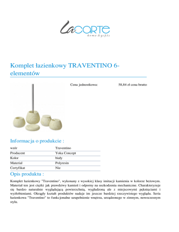 Komplet łazienkowy TRAVENTINO 6elementów Cena jednostkowa: 58,84 zł cena brutto Informacja o produkcie : wzór Producent Kolor Material Certyfikat Traventino Yoka Concept biały Polyresin Nie Opis produktu : Komplet łazienkowy "Traventino", wykonany z wysokiej klasy imitacji kamienia w kolorze beżowym. Materiał ten jest ciężki jak prawdziwy kamień i odporny na uszkodzenia mechaniczne. Charakteryzuje się bardzo naturalnie wyglądającą powierzchnią, wygładzoną ale z miejscowymi pęknięciami i wyżłobieniami. Okrągły kształt produktów nadaje im jeszcze bardziej rzeczywistego wyglądu. Seria łazienkowa "Traventino" to funkcjonalne uzupełnienie wnętrza, urządzonego w zimnym, nowoczesnym stylu. DOZOWNIK NA MYDLO travertino bejge Wymiary Długość: 10,5 cm Szerokość: 10,5 cm Wysokość: 13,5 cm KUBEK NA SZCZOTECZKI travertino bejge Wymiary Długość: 10 cm Szerokość: 10 cm Wysokość: 8 cm KUBEK DO ŁAZIENKI travertino bejge Wymiary Długość: 10,5 cm Szerokość: 10,5 cm Wysokość: 7,5 cm MYDELNICZKA traventino bejge Wymiary Długość: 12,5 cm Szerokość: 12,5 cm Wysokość: 3 cm POJEMNIK KOSMETYCZNY travertino bejge Wymiary Długość: 10,5 cm Szerokość: 10,5 cm Wysokość: 9 cm SZCZOTKA WC travertino bejge Wymiary Długość: 13 cm Szerokość: 13 cm Wysokość: 40,5 cm Powered by TCPDF (www.tcpdf.org)