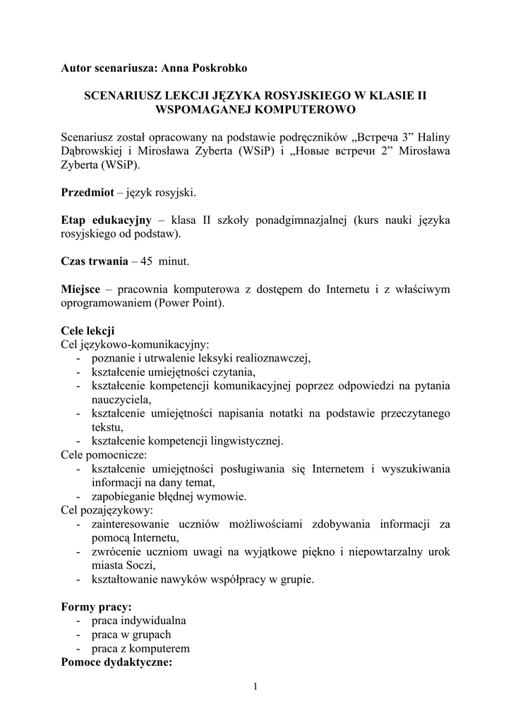 Autor scenariusza: Anna Poskrobko SCENARIUSZ LEKCJI JĘZYKA ROSYJSKIEGO W KLASIE II WSPOMAGANEJ KOMPUTEROWO Scenariusz został opracowany na podstawie podręczników „Встреча 3” Haliny Dąbrowskiej i Mirosława Zyberta (WSiP) i „Новые встречи 2” Mirosława Zyberta (WSiP). Przedmiot – język rosyjski. Etap edukacyjny – klasa II szkoły ponadgimnazjalnej (kurs nauki języka rosyjskiego od podstaw). Czas trwania – 45 minut. Miejsce – pracownia komputerowa z dostępem do Internetu i z właściwym oprogramowaniem (Power Point). Cele lekcji Cel językowo-komunikacyjny: - poznanie i utrwalenie leksyki realioznawczej, - kształcenie umiejętności czytania, - kształcenie kompetencji komunikacyjnej poprzez odpowiedzi na pytania nauczyciela, - kształcenie umiejętności napisania notatki na podstawie przeczytanego tekstu, - kształcenie kompetencji lingwistycznej. Cele pomocnicze: - kształcenie umiejętności posługiwania się Internetem i wyszukiwania informacji na dany temat, - zapobieganie błędnej wymowie. Cel pozajęzykowy: - zainteresowanie uczniów możliwościami zdobywania informacji za pomocą Internetu, - zwrócenie uczniom uwagi na wyjątkowe piękno i niepowtarzalny urok miasta Soczi, - kształtowanie nawyków współpracy w grupie. Formy pracy: - praca indywidualna - praca w grupach - praca z komputerem Pomoce dydaktyczne: 1 - komputery z dostępem do Internetu, płyta CD z prezentacjami w programie Power Point, podręcznik, mapa Rosji, plan Soczi Metody pracy: - aktywna, - wizualna, - ustno-słuchowa. Słowa kluczowe: Интернет, виртуальная экскурсия, вебстраница, демонстрация в программе Power Point, курорт, карта России, схема Сочи, пригород, достопримечательность, гостиница. Bibliografia 1. Koba G., Technologia informacyjna dla szkół ponadgimnazjalnych, Migra Sp. z o.o. 2002. 2. Korzon M., Zielińska J. i in., Kształcenie nauczycieli języków obcych. Scenariusze zajęć, Radom 1999. 3. Linki do stron rosyjskich dostępne na stronach internetowych www.turizm.ru/russia_sochi/index.htm i www.sochi-kurort.ru 4. Nowakowski Z., Sikorski W., Informatyka bez tajemnic, Warszawa 1994. 5. Sacha K., Mikrokomputer w szkole i w domu, Warszawa 1998. Temat: Сочи – летняя столица России. Przebieg lekcji Etapy lekcji Czas Tok lekcji Przewidywane odpowiedzi (min) uczniów / komentarze Здравствуйте! Здравствуйте! 2 Etap Дежурный, кто сегодня отсутствует на Uczniowie podają nazwiska organizacyjny nieobecnych osób. уроке? прочитаем домашнее Jeden z uczniów czyta pracę domową. Sprawdzenie pracy domowej 4 Давайте упражнение. Wstęp 2 Сегодня наш урок будет проходить в Uczniowie кабинете информатики. Мы будем nauczyciela. пользоваться, главным образом, программой Power Point и Интернетом. Каждый из нас знает, что Интернет стал уже частью нашей жизни и без него невозможно обойтись. Благодаря ему мы можем больше узнать о мире, почитать иностранную литературу, совершить 2 słuchają виртуальную экскурсию по музею, осмотреть достопримечательности города, послушать музыкальные произведения и т. д. Сегодня посетим один из живописнейших уголков России. Приглашаю вас на экскурсию! Dominanta lekcji 31 В России много прекрасных мест, которые Uczniowie стоит посмотреть. Тот, кто любит горы и nauczyciela. занимается альпинизмом, может отправиться на Урал. Тот, кто интересуется живой природой, может съездить в Астраханский заповедник и там восхищаться редкими растениями. Можно поехать также на юг России, где расположен прекрасный курорт Сочи. Там чистый воздух, золотые пляжи, прозрачная вода, а вокруг растут пальмы.1 słuchają – Посмотрите, пожалуйста, на карту Jeden z uczniów podchodzi России. Кто из вас покажет на карте город do mapy i pokazuje Soczi. Сочи? – Город лежит на Чёрном море. Nauczyciel dysponuje – Посмотрите сейчас на схему Сочи. planem miasta Soczi i okolic. – Скажите, пожалуйста, как называются – Пригороды Сочи это: Дагомыс, пригороды, которые входят в состав Лазаревское, Мацеста и Красная Сочи? Покажите их на схеме. Поляна. Uczniowie pokazują miejscowości na planie Soczi. – На каком море лежит город? – Пожалуйста, возьмите листки бумаги, на которых найдёте диалог. Прочитаем его по ролям, а потом будете отвечать на мои вопросы. – Вадим, ты летом будешь отдыхать вместе с родителями? – Нет, я собираюсь с друзьями в турпоход на юг России, а родители – на курорт. – Куда? -Они, по совету наших знакомых, едут в Сочи и будут жить в гостинице „