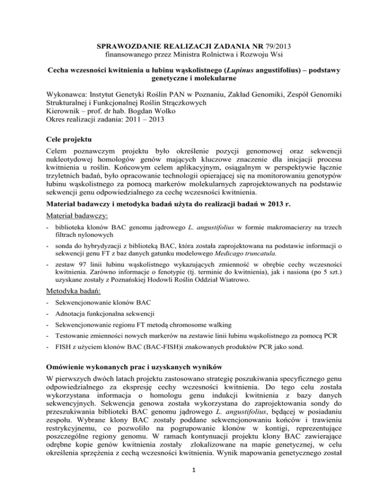 SPRAWOZDANIE REALIZACJI ZADANIA NR 79/2013 finansowanego przez Ministra Rolnictwa i Rozwoju Wsi Cecha wczesności kwitnienia u łubinu wąskolistnego (Lupinus angustifolius) – podstawy genetyczne i molekularne Wykonawca: Instytut Genetyki Roślin PAN w Poznaniu, Zakład Genomiki, Zespół Genomiki Strukturalnej i Funkcjonalnej Roślin Strączkowych Kierownik – prof. dr hab. Bogdan Wolko Okres realizacji zadania: 2011 – 2013 Cele projektu Celem poznawczym projektu było określenie pozycji genomowej oraz sekwencji nukleotydowej homologów genów mających kluczowe znaczenie dla inicjacji procesu kwitnienia u roślin. Końcowym celem aplikacyjnym, osiągalnym w perspektywie łącznie trzyletnich badań, było opracowanie technologii opierającej się na monitorowaniu genotypów łubinu wąskolistnego za pomocą markerów molekularnych zaprojektowanych na podstawie sekwencji genu odpowiedzialnego za cechę wczesności kwitnienia. Materiał badawczy i metodyka badań użyta do realizacji badań w 2013 r. Materiał badawczy: - biblioteka klonów BAC genomu jądrowego L. angustifolius w formie makromacierzy na trzech filtrach nylonowych - sonda do hybrydyzacji z biblioteką BAC, która została zaprojektowana na podstawie informacji o sekwencji genu FT z baz danych gatunku modelowego Medicago truncatula. - zestaw 97 linii łubinu wąskolistnego wykazujących zmienność w obrębie cechy wczesności kwitnienia. Zarówno informacje o fenotypie (tj. terminie do kwitnienia), jak i nasiona (po 5 szt.) uzyskane zostały z Poznańskiej Hodowli Roślin Oddział Wiatrowo. Metodyka badań: - Sekwencjonowanie klonów BAC - Adnotacja funkcjonalna sekwencji - Sekwencjonowanie regionu FT metodą chromosome walking - Testowanie zmienności nowych markerów na zestawie linii łubinu wąskolistnego za pomocą PCR - FISH z użyciem klonów BAC (BAC-FISH)i znakowanych produktów PCR jako sond. Omówienie wykonanych prac i uzyskanych wyników W pierwszych dwóch latach projektu zastosowano strategię poszukiwania specyficznego genu odpowiedzialnego za ekspresję cechy wczesności kwitnienia. Do tego celu została wykorzystana informacja o homologu genu indukcji kwitnienia z bazy danych sekwencyjnych. Sekwencja genowa została wykorzystana do zaprojektowania sondy do przeszukiwania biblioteki BAC genomu jądrowego L. angustifolius, będącej w posiadaniu zespołu. Wybrane klony BAC zostały poddane sekwencjonowaniu końców i trawieniu restrykcyjnemu, co pozwoliło na pogrupowanie klonów w kontigi, reprezentujące poszczególne regiony genomu. W ramach kontynuacji projektu klony BAC zawierające odrębne kopie genów kwitnienia zostały zlokalizowane na mapie genetycznej, w celu określenia sprzężenia z cechą wczesności kwitnienia. Wynik mapowania genetycznego został 1 zweryfikowany przy zastosowaniu metod cytogenetycznych (BAC-FISH). Trzy klony BAC poddano całkowitemu sekwencjonowaniu w celu określenia sekwencji genu odpowiedzialnego za ekspresję tej cechy u łubinu wąskolistnego. Badania w 2013 r. prowadzono w następujących etapach: 1. Sekwencjonowanie regionu genomu zawierającego gen FT u linii nie wymagającej wernalizacji w celu poznania różnic na poziomie DNA odpowiadających za ekspresję cechy termoneutralności. W toku mapowania sekwencji z regionu FT (w roku 2012 – zadanie 2) zaobserwowano szereg loci polimorficznych, obejmujących od jednego do kilku nukleotydów. Na podstawie adnotacji funkcjonalnej sekwencji wykazano, że nie powinny one mieć wpływu na ekspresję cechy. W związku z tym zaprojektowano kolejne startery flankujące region na początku sekwencji genu, odpowiadające pozycjom 71987–72005 pz i 72817–72840 pz z klonu BAC 133N08. Przeprowadzenie sekwencjonowania amplifikowanych produktów PCR wykazało delecję około 1600 pz, występującą w linii termoneutralnej. Na podstawie danych literaturowych stwierdzono, że istnieje wysokie prawdopodobieństwo przyłączania się w tym miejscu czynników wpływających na transkrypcję genu FT, zwłaszcza tych o działaniu represyjnym. Innymi słowy, brak tej sekwencji u linii termoneutralnej uniemożliwia hamowanie ekspresji genu FT po osiągnięciu odpowiedniego etapu rozwoju rośliny. 2. Opracowanie markerów molekularnych do selekcji termoneutralnych genotypów łubinu wąskolistnego. Na podstawie analizy porównawczej regionu genomu zawierającego gen FT dla dwóch linii: termoneutralnej i wymagającej wernalizacji, zidentyfikowano locus z INDELem ok. 1600 pz. Posłużył on do zaprojektowania starterów do PCR. Odpowiada on regionowi 71987-72840 pz w klonie BAC 133N08. Dodatkowo, w celu objęcia starterami większego zakresu zmienności sekwencji, zostały zaprojektowane startery flankujące badany region. Wszystkie markery wykorzystują polimorfizm długości produktu PCR, a więc nie wymagają stosowania kosztownych metod detekcji. 3. Testowanie zmienności nowych markerów molekularnych na zestawie linii łubinu wąskolistnego Do testowania użyteczności opracowanych markerów genetycznych do selekcji materiału hodowlanego ukierunkowanej na termoneutralność został wykorzystany zestaw 97 linii łubinu wąskolistnego wykazujących zmienność w obrębie cechy wczesności kwitnienia. Zarówno informacje o fenotypie (tj. terminie do kwitnienia), jak i nasiona (po 5 szt.) uzyskane zostały z kolekcji PHR Oddział Wiatrowo. Jako matryca do reakcji PCR posłużył DNA roślinny wyizolowany z tkanki liści. Dla pary starterów F75/R75 przeprowadzono amplifikację na matrycy DNA wszystkich linii. W wątpliwych przypadkach reakcję powtórzono (do 3 razy). Dla linii nr. 53 – Palestyna uzyskano fenotyp pośredni. Produkt reakcji PCR został zsekwencjonowany. Dla 15 linii nie otrzymano żadnego produktu amplifikacji. W przypadkach, których nie otrzymano żadnego produktu amplifikacji przy użyciu pary starterów F75/R75, przeprowadzono amplifikację z zastosowaniem pozostałych par starterów w różnych kombinacja