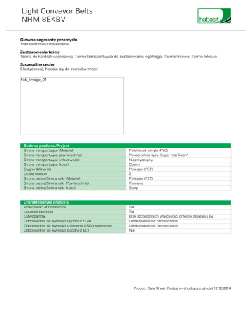 Light Conveyor Belts NHM-8EKBV Główne segmenty przemysłu Transport bliski materiałów Zastosowania taśmy Taśma do kontroli wyjściowej, Taśma transportująca do zastosowania ogólnego, Taśma liniowa, Taśma łukowa Szczególne cechy Elastyczność, Nadaje się do zwrotów mocy Fab_Image_01 Budowa produktu/Projekt Strona transportująca (Materiał) Strona transportująca (powierzchnia) Strona transportująca (właściwości) Strona transportująca (kolor) Cięgno (Materiał) Liczba warstw Strona bieżna/Strona rolki (Materiał) Strona bieżna/Strona rolki (Powierzchnia) Strona bieżna/Strona rolki (kolor) Polichlorek winylu (PVC) Powierzchnia typu "Super mat finish" Nieprzyczepny Czarny Poliester (PET) 2 Poliester (PET) Tkaniana Szary Charakterystyka produktu Właściwości antystatyczne Łączenie bez kleju Łatwopalność Odpowiednie do żywności (zgodny z FDA) Odpowiednie do żywności (zalecenia USDA spełnione) Odpowiednie do żywności (zgodny z EU) Tak Tak Brak szczególnych właściwości przeciw zapalaniu się Użytkowanie nie przewidziane Użytkowanie nie przewidziane Nie Product Data Sheet (Rodzaj wychodzący z użycia) 12.12.2016 Light Conveyor Belts NHM-8EKBV Dane techniczne Grubość Masa taśmy (waga taśmy) Dopuszczalna temperatura pracy min. (ciągła) Dopuszczalna temperatura pracy maks. (ciągła) Coefficient of friction between running side and driving pulley of steel Coefficient of friction between running side and driving pulley with friction cover Coefficient of friction between running side and slider bed of pickled steel sheet Coefficient of friction between running side and slider bed of phenolic resin Coefficient of friction between running side and slider bed of stainless steel sheet Bezłączeniowa szrokość produkcyjna 1.90 2.10 -10 70 0.15 mm kg/m² °C °C - 0.35 - 0.25 - 0.15 - 0.15 - 3000 mm 0.07 0.43 14 158 118.1 inch lb/sqft °F °F inch Joining related properties Metoda łączenia Średnica rolki (minimalna) Minimalna średnica rolki z przeciwzgięciem Odpowiednia do pracy po stole Może pracować na rolkach Odpowiednia na noski Cichobieżność Odpowiedni do pracy na wykrywaczach metalu Flexproof 10 x 80 30 mm 1.18 inch 30 mm 1.18 inch Tak Tak Nie Nie Tak Wszystkie dane są wartościami przybliżonymi w standardowych warunkach klimatycznych: 23°C/73°F, 50% względnej wilgotności (DIN 50005/ISO 554) i bazuja na głównej metodzie łączenia. Product Data Sheet (Rodzaj wychodzący z użycia) 12.12.2016 Light Conveyor Belts NHM-8EKBV Odporność chemiczna Link do informacji o Odporności Chemicznej: http://www.habasit.com/en/chemical-resistance.htm Tryb użytkowania/transportowania Buforowanie, Łukowy, Zmieniać kierunek, Poziomy Obliczenie Dla większości zastosowań kalkulacja nie jest wymagana. Jeżeli mimo wszystko kalkulacja byłaby potrzebna: proszę skontaktować się z Habasit'em. Rekomendacja Nie schodzić poniżej naprężenia początkowego (epsilon) ~ 0.3% W celu uzyskania szczegółowych informacji patrz "wymagania dot. magazynowania i obsługi pasów i taśm", bądź skontaktuj się z Habasit'em, Chronić taśmy i pasy przed światłem słonecznym/promieniami UV/kurzem i brudem. Taśmy i pasy zapasowe przechowywać w chłodym i suchym miejscu i w miarę możliwości w ich oryginalnym opakowaniu. Ten produkt nie został przetestowany zgodnie ze standardem ATEX (atmosfera z zagrożeniem wybuchu - przepisy prawne ATEX 95 lub dyrektywa UE 94/9) i w związku z tym musi zostać sprawdzony przez użytkownika w środowisku pracy. Grupa produktu Podgrupa produktu Numer elementu Numer taryfy celnej PVC Belts Taśmy transpotujące i procesowe S100067337 59111000 Disclaimer Product Application Disclaimer (valid for ALL Habasit products and mentioned on all PDS) This disclaimer is made by and on behalf of Habasit and its affiliated companies, directors, employees, agents and contractors (hereinafter collectively "HABASIT") with respect to the products referred to herein (the "Products"). SAFETY WARNINGS SHOULD BE READ CAREFULLY AND ANY RECOMMENDED SAFETY PRECAUTIONS BE FOLLOWED STRICTLY! Please refer to the Safety Warnings herein, in the Habasit catalogue as well as installation and operating manuals. All indications / information as to the application, use and performance of the Products are recommendations provided with due diligence and care, but no representations or warranties of any kind are made as to their completeness, accuracy or suitability for a particular purpose. The data provided herein are based on laboratory application with small-scale test equipment, running at standard conditions, and do not necessarily match product performance in industrial use. New knowledge and experience may lead to re-assessments and modifications within a short period of time and without prior notice. EXCEPT AS EXPLICITLY WARRANTED BY HABASIT, WHICH WARRANTIES ARE EXCLUSIVE AND IN LIEU OF ALL OTHER WARRANTIES, EXPRESS OR IMPLIED, THE PRODUCTS ARE PROVIDED "AS IS". HABASIT DISCLAIMS ALL OTHER WARRANTIES, EITHER EXPRESS OR IMPLIED, INCLUDING, BUT NOT LIMITED TO, IMPLIED WARRANTIES OF MERCHANTABILITY, FITNESS FOR A PARTICULAR PURPOSE, NON-INFRINGEMENT, OR ARISING FROM A COURSE OF DEALING, USAGE, OR TRADE PRACTICE, ALL OF WHICH ARE HEREBY EXCLUDED TO THE EXTENT ALLOWED BY APPLICABLE LAW. BECAUSE CONDITIONS OF USE IN INDUSTRIAL APPLICATION ARE OUTSIDE OF HABASIT'S CONTROL, HABASIT DOES NOT ASSUME ANY LIABILITY CONCERNING THE SUITABILITY AND PROCESS ABILITY OF THE PRODUCTS, INCLUDING INDICATIONS ON PROCESS RESULTS AND OUTPUT. Product Data Sheet (Rodzaj wychodzący z użycia) 12.12.2016