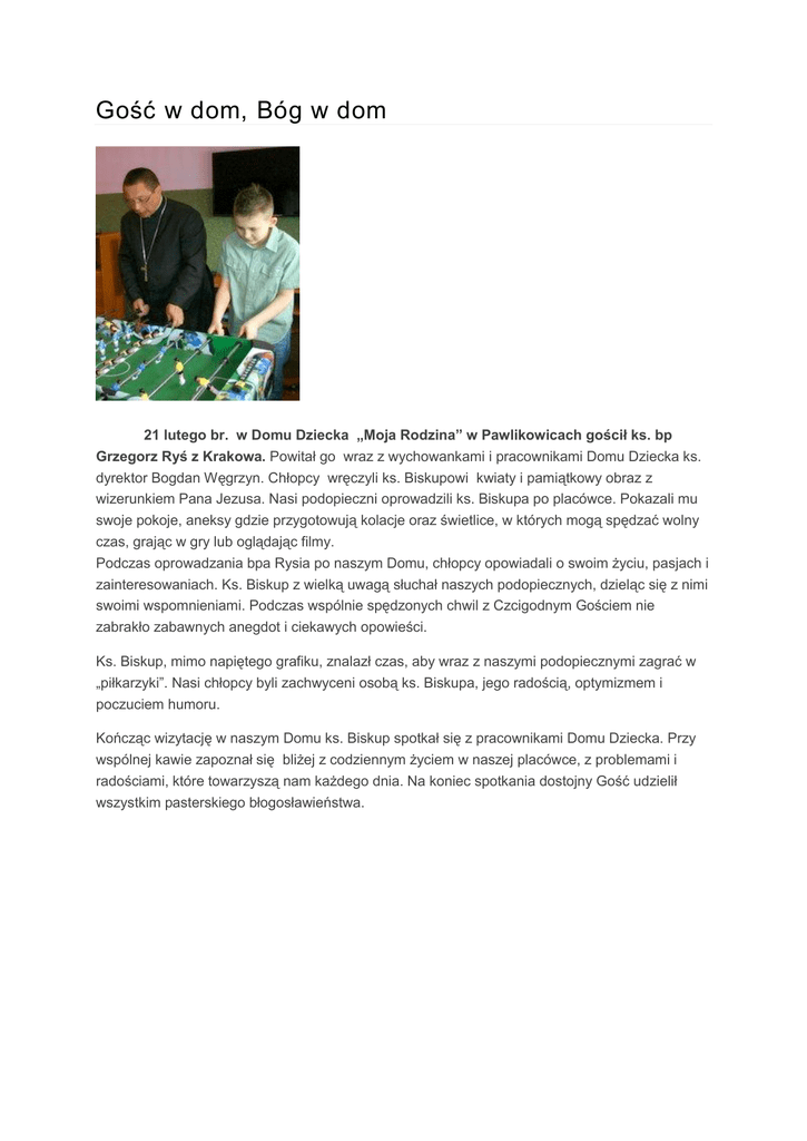 Gość w dom, Bóg w dom 21 lutego br. w Domu Dziecka „Moja Rodzina” w Pawlikowicach gościł ks. bp Grzegorz Ryś z Krakowa. Powitał go wraz z wychowankami i pracownikami Domu Dziecka ks. dyrektor Bogdan Węgrzyn. Chłopcy wręczyli ks. Biskupowi kwiaty i pamiątkowy obraz z wizerunkiem Pana Jezusa. Nasi podopieczni oprowadzili ks. Biskupa po placówce. Pokazali mu swoje pokoje, aneksy gdzie przygotowują kolacje oraz świetlice, w których mogą spędzać wolny czas, grając w gry lub oglądając filmy. Podczas oprowadzania bpa Rysia po naszym Domu, chłopcy opowiadali o swoim życiu, pasjach i zainteresowaniach. Ks. Biskup z wielką uwagą słuchał naszych podopiecznych, dzieląc się z nimi swoimi wspomnieniami. Podczas wspólnie spędzonych chwil z Czcigodnym Gościem nie zabrakło zabawnych anegdot i ciekawych opowieści. Ks. Biskup, mimo napiętego grafiku, znalazł czas, aby wraz z naszymi podopiecznymi zagrać w „piłkarzyki”. Nasi chłopcy byli zachwyceni osobą ks. Biskupa, jego radością, optymizmem i poczuciem humoru. Kończąc wizytację w naszym Domu ks. Biskup spotkał się z pracownikami Domu Dziecka. Przy wspólnej kawie zapoznał się bliżej z codziennym życiem w naszej placówce, z problemami i radościami, które towarzyszą nam każdego dnia. Na koniec spotkania dostojny Gość udzielił wszystkim pasterskiego błogosławieństwa.