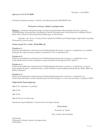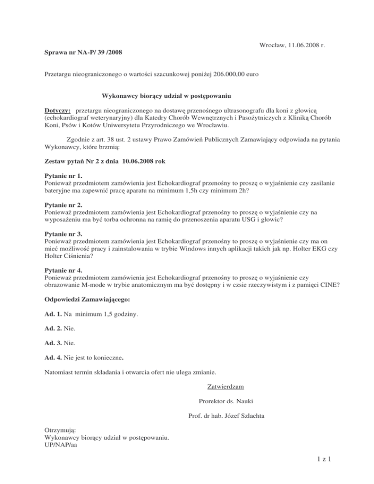 Wrocław, 11.06.2008 r. Sprawa nr NA-P/ 39 /2008 Przetargu nieograniczonego o warto ci szacunkowej poni ej 206.000,00 euro Wykonawcy bior cy udział w post powaniu Dotyczy: przetargu nieograniczonego na dostaw przeno nego ultrasonografu dla koni z głowic (echokardiograf weterynaryjny) dla Katedry Chorób Wewn trznych i Paso ytniczych z Klinik Chorób Koni, Psów i Kotów Uniwersytetu Przyrodniczego we Wrocławiu. Zgodnie z art. 38 ust. 2 ustawy Prawo Zamówie Publicznych Zamawiaj cy odpowiada na pytania Wykonawcy, które brzmi : Zestaw pyta Nr 2 z dnia 10.06.2008 rok Pytanie nr 1. Poniewa przedmiotem zamówienia jest Echokardiograf przeno ny to prosz o wyja nienie czy zasilanie bateryjne ma zapewni prac aparatu na minimum 1,5h czy minimum 2h? Pytanie nr 2. Poniewa przedmiotem zamówienia jest Echokardiograf przeno ny to prosz o wyja nienie czy na wyposa eniu ma by torba ochronna na rami do przenoszenia aparatu USG i głowic? Pytanie nr 3. Poniewa przedmiotem zamówienia jest Echokardiograf przeno ny to prosz o wyja nienie czy ma on mie mo liwo pracy i zainstalowania w trybie Windows innych aplikacji takich jak np. Holter EKG czy Holter Ci nienia? Pytanie nr 4. Poniewa przedmiotem zamówienia jest Echokardiograf przeno ny to prosz o wyja nienie czy obrazowanie M-mode w trybie anatomicznym ma by dost pny i w czsie rzeczywistym i z pami ci CINE? Odpowiedzi Zamawiaj cego: Ad. 1. Na minimum 1,5 godziny. Ad. 2. Nie. Ad. 3. Nie. Ad. 4. Nie jest to konieczne. Natomiast termin składania i otwarcia ofert nie ulega zmianie. Zatwierdzam Prorektor ds. Nauki Prof. dr hab. Józef Szlachta Otrzymuj : Wykonawcy bior cy udział w post powaniu. UP/NAP/aa 1z1