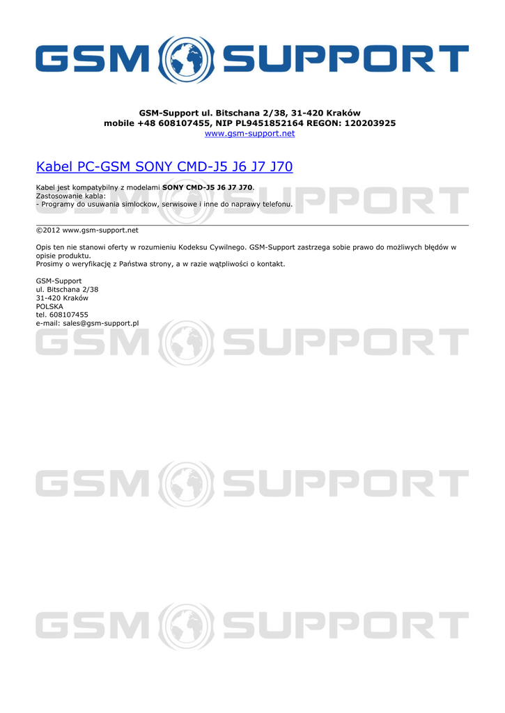 GSM-Support ul. Bitschana 2/38, 31-420 Kraków mobile +48 608107455, NIP PL9451852164 REGON: 120203925 www.gsm-support.net Kabel PC-GSM SONY CMD-J5 J6 J7 J70 Kabel jest kompatybilny z modelami SONY CMD-J5 J6 J7 J70. Zastosowanie kabla: - Programy do usuwania simlockow, serwisowe i inne do naprawy telefonu. ©2012 www.gsm-support.net Opis ten nie stanowi oferty w rozumieniu Kodeksu Cywilnego. GSM-Support zastrzega sobie prawo do możliwych błędów w opisie produktu. Prosimy o weryfikację z Państwa strony, a w razie wątpliwości o kontakt. GSM-Support ul. Bitschana 2/38 31-420 Kraków POLSKA tel. 608107455 e-mail: [email protected] Powered by TCPDF (www.tcpdf.org)