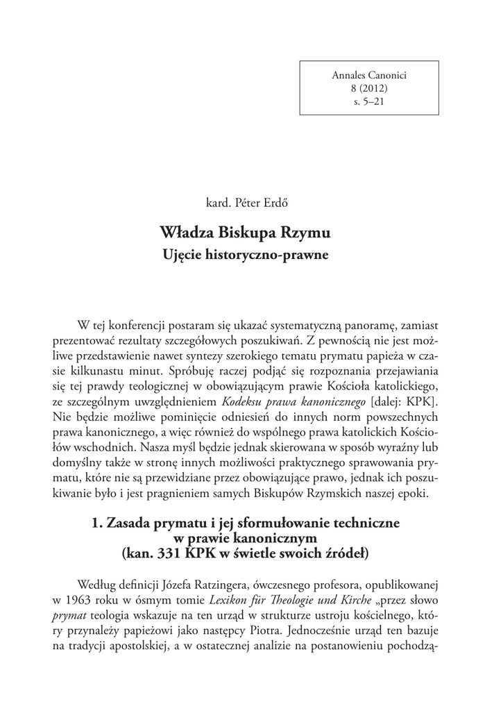 Annales Canonici 8 (2012) s. 5–21 kard. Péter Erdő Władza Biskupa Rzymu Ujęcie historyczno-prawne W tej konferencji postaram się ukazać systematyczną panoramę, zamiast prezentować rezultaty szczegółowych poszukiwań. Z pewnością nie jest możliwe przedstawienie nawet syntezy szerokiego tematu prymatu papieża w czasie kilkunastu minut. Spróbuję raczej podjąć się rozpoznania przejawiania się tej prawdy teologicznej w obowiązującym prawie Kościoła katolickiego, ze szczególnym uwzględnieniem Kodeksu prawa kanonicznego [dalej: KPK]. Nie będzie możliwe pominięcie odniesień do innych norm powszechnych prawa kanonicznego, a więc również do wspólnego prawa katolickich Kościołów wschodnich. Nasza myśl będzie jednak skierowana w sposób wyraźny lub domyślny także w stronę innych możliwości praktycznego sprawowania prymatu, które nie są przewidziane przez obowiązujące prawo, jednak ich poszukiwanie było i jest pragnieniem samych Biskupów Rzymskich naszej epoki. 1. Zasada prymatu i jej sformułowanie techniczne w prawie kanonicznym (kan. 331 KPK w świetle swoich źródeł) Według definicji Józefa Ratzingera, ówczesnego profesora, opublikowanej w 1963 roku w ósmym tomie Lexikon für Theologie und Kirche „przez słowo prymat teologia wskazuje na ten urząd w strukturze ustroju kościelnego, który przynależy papieżowi jako następcy Piotra. Jednocześnie urząd ten bazuje na tradycji apostolskiej, a w ostatecznej analizie na postanowieniu pochodzą- kard. Péter Erdő 6 cym od Pana, jego historyczna forma i jego poznanie od zawsze uczestniczą jednakże w historyczności Kościoła, w jego narodzeniu i dojrzewaniu, jak również w jego byciu wystawionym na zagrożenia i pokusy”1. To specjalne posłannictwo Biskupa Rzymskiego zawiera różne aspekty, między innymi z pewnością honorową precedencję, ale jeszcze więcej, prymat jurysdykcyjny, charyzmat nieomylności, w specjalny sposób zdefiniowany na Soborze Watykańskim I. Co więcej, poza obszarem nieomylnych deklaracji, należy mieć na uwadze także ten specyficzny dar dany św. Piotrowi, który został sformułowany w Ewangelii Łukasza w następujący sposób: „Ja prosiłem za Tobą, żeby nie ustała Twoja wiara. Ty zaś, nawróciwszy się, utwierdzaj swoich braci” (Łk 22, 32). W obowiązującym prawie kanonicznym urząd prymatu papieża jest obecny przede wszystkim, choć nie w sposób wyłączny, jako prymat jurysdykcji, lub też, według terminologii kodeksu z roku 1983, jako prymat władzy rządzenia (kan. 129 § 1 KPK). Nawet jeżeli pojęcie prymatu nie zostało wyraźnie wymienione w opisie kanonicznym urzędu papieża, który znajduje się w KPK (kan. 331–333; por. kan. 43–45 Kodeksu kanonów Kościołów wschodnich [dalej: KKKW]), ten sam kodeks z 1983 roku trzy razy używa wyrażenia pimatus2. W kan. 591, który omawia instytuty życia konsekrowanego, jest powiedziane, że „Papież, na mocy swojego prymatu obejmującego cały Kościół, może wyjmować instytuty życia konsekrowanego spod kierownictwa ordynariuszy miejsca i poddawać je tylko sobie lub innej władzy kościelnej”. W tym kontekście prymat oznacza jednak specjalną władzę rządzenia. W kan. 1273 jest wyrażona zasada, zgodnie z którą „Biskup Rzymu, na mocy prymatu rządzenia, jest najwyższym zarządcą i szafarzem wszystkich dóbr kościelnych”. Natomiast w kan. 1417 § 1 stwierdzono, że: „Z racji prymatu Biskupa Rzymskiego wolno każdemu wiernemu swoją sprawę, czy to sporną, czy karną, z trybunału każdego stopnia i w każdym stadium sporu, przenieść do rozpatrzenia Stolicy Świętej lub do niej ją wnieść”. Także w tych przypadkach, słowo „prymat” oznacza specjalny stan dotyczący władzy rządzenia. Jeśli chodzi o wyraźny opis urzędu papieża, bez używania słowa „prymat”, prawodawca przekazuje doktrynę i dyscyplinę uściślaną przez stulecia. W rze1 J. Ratzinger, Primat, [w:] Lexikon für Theologie und Kirche, t. 8, red. J. Höfer, K. Rahner, Freiburg 1963, kol. 761. 2 Por. X. Ochoa, Index verborum ac locutionum Codicis Iuris Canonici, Roma 1983, s. 345. Władza Biskupa Rzymu. Ujęcie historyczno-prawne 7 czy samej kan. 331 brzmi: „Biskup Kościoła Rzymskiego, w którym trwa urząd udzielony przez Pana samemu Piotrowi, pierwszemu z Apostołów, a który ma być przekazywany jego następcom, jest Głową Kolegium Biskupów, Zastępcą Chrystusa i Pasterzem całego Kościoła tutaj na ziemi. Dlatego, z racji swojego urzędu, posiada on najwyższą, pełną, bezpośrednią i powszechną władzę zwyczajną w Kościele, którą może wykonywać zawsze w sposób nieskrępowany”. Żeby zobaczyć, jak organiczny związek istnieje między tym kanonem a długą tradycją Kościoła doktrynalną i dyscyplinarną, warto rzucić okiem na jego źródła3. W poprzednim kodeksie z 1917 roku cytowanemu kanonowi odpowiada kan. 218. Tamten kanon jednak używa innego języka i zawiera niektóre pojęcia, które nie są wyakcentowane w tej samej formie w obowiązującym prawodawstwie. W rzeczy samej, w kodeksie pio-benedyktyńskim czytamy: „§ 1. Romanus Pontifex, Beati Petri in primatu Successor, habet non solum primatum honoris, sed supremam et plenam potestatem iurisdictionis in universam Ecclesiam tum in rebus quae ad fidem et mores, tum in iis quae ad disciplinam et regimen Ecclesae per totum orbem diffusae pertinent. § 2. Haec potestas est vere episcopalis, ordinaria et immediata tum in omnes et singulas ecclesias, tum in omnes et singulos pastores et fideles, a quavis humana auctoritate independens” (kan. 218 KPK z 1917). Kanon poprzedniego kodeksu, jak widzimy, już w opisie urzędu papieża używa słowa „prymat”, i jednocześnie mówi o najwyższej i pełnej władzy jurysdykcji, rozróżniając obszar wiary i obyczajów oraz obszar dyscypliny. W bardzo bogatym spisie źródeł tego kanonu kodeksu pio-benedyktyńskiego4 znajdujemy między innymi