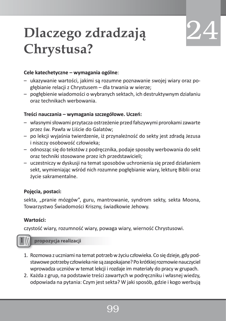 Dlaczego zdradzają Chrystusa? 24 Cele katechetyczne – wymagania ogólne: – ukazywaniewartości,jakimisąrozumnepoznawanieswojejwiaryorazpogłębianierelacjizChrystusem–dlatrwaniawwierze; – pogłębieniewiadomościowybranychsektach,ichdestruktywnymdziałaniu oraztechnikachwerbowania. Treści nauczania – wymagania szczegółowe. Uczeń: – własnymisłowamiprzytaczaostrzeżenieprzedfałszywymiprorokamizawarte przezśw.PawławLiściedoGalatów; – polekcjiwyjaśniatwierdzenie,iżprzynależnośćdosektyjestzdradąJezusa iniszczyosobowośćczłowieka; – odnoszącsiędotekstówzpodręcznika,podajesposobywerbowaniadosekt oraztechnikistosowaneprzezichprzedstawicieli; – uczestniczywdyskusjinatematsposobówuchronieniasięprzeddziałaniem sekt,wymieniającwśródnichrozumnepogłębianiewiary,lekturęBibliioraz życiesakramentalne. Pojęcia, postaci: sekta, „pranie mózgów”, guru, mantrowanie, syndrom sekty, sekta Moona, TowarzystwoŚwiadomościKriszny,świadkowieJehowy. Wartości: czystośćwiary,rozumnośćwiary,powagawiary,wiernośćChrystusowi. propozycja realizacji 1 Propozycja realizacji: 1.Rozmowazuczniaminatematpotrzebwżyciuczłowieka.Cosiędzieje,gdypodstawowepotrzebyczłowiekaniesązaspokajane?Pokrótkiejrozmowienauczyciel wprowadzauczniówwtematlekcjiirozdajeimmateriałydopracywgrupach. 2.Każdazgrup,napodstawietreścizawartychwpodręcznikuiwłasnejwiedzy, odpowiadanapytania:Czymjestsekta?Wjakisposób,gdzieikogowerbują 99 sekty?Naczympolegapsychomanipulacjawsektach?Jakzmieniasięczłowiek,którywchodzidosekty?Cechyihierarchiasekt. 3.Prezentacja pracy w grupach. Nauczyciel uzupełnia wypowiedzi uczniów (jeżeliniewszystkozostałoprzeznichopracowane). 4.NauczycielodsyłauczniówdotekstubiblijnegoGa1,6–7.Poprzeczytaniu tekstuzadajepytanie:JakrozumiejątentekstPisma?Czydziśsąludzie,którzy chcielibyodmienićEwangelię? 5.UczniowieodczytująfragmentyPismaŚwiętego(Iz43,10–11iDz4,10–12), którezwracająuwagęnafakt,żetoJezusjestjedynymzbawicielem. 6.Notatkawłasnauczniabądźprzygotowanaprzeznauczyciela. propozycja pracypracy na lekcji propozycja na lekcji 3 inna 12Inna Lekcjamożebyćpoświęconaposzczególnymgrupomkultowym.Wytypowani uczniowieprzygotująkrótkącharakterystykękonkretnejsekty.Warto,bywtej charakterystyce posłużyli się zamieszczonym poniżej kwestionariuszem, jak poznać,żedanagrupajestsektą. Jak rozpoznać sektę? Stale pojawiają się nowe grupy religijne, ekonomiczne, terapeutyczne, edukacyjne.Niektóreznichsąniebezpieczne,ponieważstosująwobec swoichczłonkówniedozwolonetechnikimanipulacji.Niewszystko,oczym jesteśmyinformowaniprzezwerbującychnaulicyczyogłaszającychjakieś spotkanieludzi,jestdobreipożytecznedlanas.Niektóregrupymogąbyć niebezpiecznedladuchowegoicielesnegozdrowiaczłowieka,dlaczłonków naszychrodzin.Dlategoten,ktouczestniczynawetzczystejciekawości wspotkaniachtakichgrup,narażasięnadużeryzyko.Sąsytuacje,wktórychkażdystajesięzagrożony. ZinicjatywyrodzicówiludzidotkniętychproblemempsychicznegoiduchowegouzależnieniaprzygotowanowBerlinietestdlagrupreligijnych, światopoglądowychiideologicznych,któregowypełnieniepomożezorientowaćsię,czymamydoczynieniazsektą.Należyprzekreślićstwierdzenia, któreniepasujądobadanejgrupy.Jeśliniemożnaprzekreślićkażdego z tych stwierdzeń – należy zachować w kontakcie z grupą szczególną ostrożność! 100 1. Już pierwszy kontakt z grupą otworzył całkowicie nowe widzenie świata (tzw. przeżycie kluczowe). 2. Obraz świata jest bardzo prosty i wyjaśnia rzeczywiście każdy problem. 3. W grupie znajdujemy wszystko, czego do tej pory na próżno szukaliśmy. 4. Grupa ma mistrza lub przywódcę, ojca, guru lub największego myśliciela, który jedynie posiada całą prawdę i często jest czczony jak Bóg. 5. Świat zmierza nieuchronnie ku katastrofie i tylko grupa wie, jak go uratować. 6. Grupa jest elitą. Pozostała ludzkość jest chora i zagubiona. Jeżeli nie będzie w grupie współuczestniczyć – nie może się uratować. 7. Grupa odrzuca naukę w szkołach i na uczelniach. Jedynie nauka grupy jest uważana za wartościową i prawdziwą. 8. Grupa odrzuca racjonalne myślenie, umysł, rozum jako negatywne, sataniczne, nieoświecone. 9. Krytyka i odrzucenie przez stojących z zewnątrz jest właśnie dowodem, że grupa ma rację. 10. Grupa ocenia siebie jako prawdziwą rodzinę lub wspólnotę. 11. Grupa chce, by wszelkie dawne relacje z rodziną, przyjaciółmi i środowiskiem zostały zerwane, ponieważ przeszkadzają nam w rozwoju. 12. Grupa oddziela się od reszty świata poprzez ubiór, sposób odżywiania się, własny język, ograniczanie swobody w relacjach międzyludzkich. 13. Grupa żąda ścisłego posłuszeństwa regułom albo dyscypliny, ponieważ jest to jedyna droga do zbawienia. 14. Grupa narzuca sposób zachowań seksualnych, np. kontakt z partnerami za zgodą kierownictwa, seks grupowy, całkowity zakaz kontaktów seksualnych dla osób niższych w hierarchii grupy. 15. Cały czas jest wypełniony zadaniami, np. sprzedażą książek, czasopism, werbowaniem nowych członków, udziałem w kolejnych kursach, medytacją. 16. Jeżeli obiecany przez grupę sukces bądź uzdrowienie nie nastąpią, grupa uzna, że sami jesteśmy za to odpowiedzialni, ponieważ nie zaangażowaliśmy się dostatecznie lub nie wierzyliśmy wystarczająco silnie. 17. Członkiem grupy powinniśmy zostać natychmiast, już dzisiaj. 18. Nie istnieje możliwość uzyskania obiektywnego obrazu grupy, gdyż ważniejsze od refleksji jest przeżycie, zgodnie z zasadą: Tego nie da się po prostu wyjaśnić. Proszę przyjść do nas i wziąć udział w spotkaniu. Kiedy przeżyjecie – zrozumiecie. 101 Innąmetodąpracynalekcjijestodegraniescenekteatralnych–tematykasekt. Mała,3–4-osobowagrupazastanawiasię,jakmożeodegraćwerbunekdosekty(pomagawtymtekstzpodręcznikaizamieszczonepowyżejuzupełnienie). Resztaklasyzastanawiasięnadewentualnymiodpowiedziami,