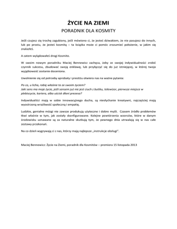 ŻYCIE NA ZIEMI PORADNIK DLA KOSMITY Jeśli czujesz się trochę zagubiony, jeśli mówiono ci, że jesteś dziwakiem, że nie pasujesz do innych, lub po prostu, że jesteś kosmitą – ta książka może ci pomóc zrozumieć położenie, w jakim się znalazłeś. A zatem wylądowałeś drogi Kosmito. W swoim nowym poradniku Maciej Bennewicz zachęca, żeby ze swojej indywidualności zrobić czynnik sukcesu, zbudować swoją enklawę, lub przyłączyć się do już istniejącej, w której twoja wyjątkowość zostanie doceniona. Uwolnienie się od potrzeby aprobaty i prestiżu otwiera nas na ważne pytania: Po co, u licha, robię właśnie to ze swoim życiem? Jaki sens ma moje życie, jeśli sensem już nie jest ciuch z butiku, telewizor, pierwsze miejsce w plebiscycie, kariera, albo uścisk dłoni prezesa? Indywidualiści mają w sobie innowacyjnego ducha, są niesłychanie kreatywni, najczęściej mają wyostrzoną wrażliwość społeczną i empatię. Ludzkie, genialne mózgi nie zawsze produkują użyteczne i dobre myśli. Czasem źródło problemów tkwi właśnie w tym, jak zostały skonfigurowane. Kolejne powtórzenia wzorców, które w danym środowisku uznawane są za naturalne skutkują tym, że pewnego dnia utrwalają się w nas całe zestawy przekonań. Na co dzień wygrywają ci z nas, którzy mają najlepsze „instrukcje obsługi”. Maciej Bennewicz: Życie na Ziemi, poradnik dla Kosmitów – premiera 15 listopada 2013