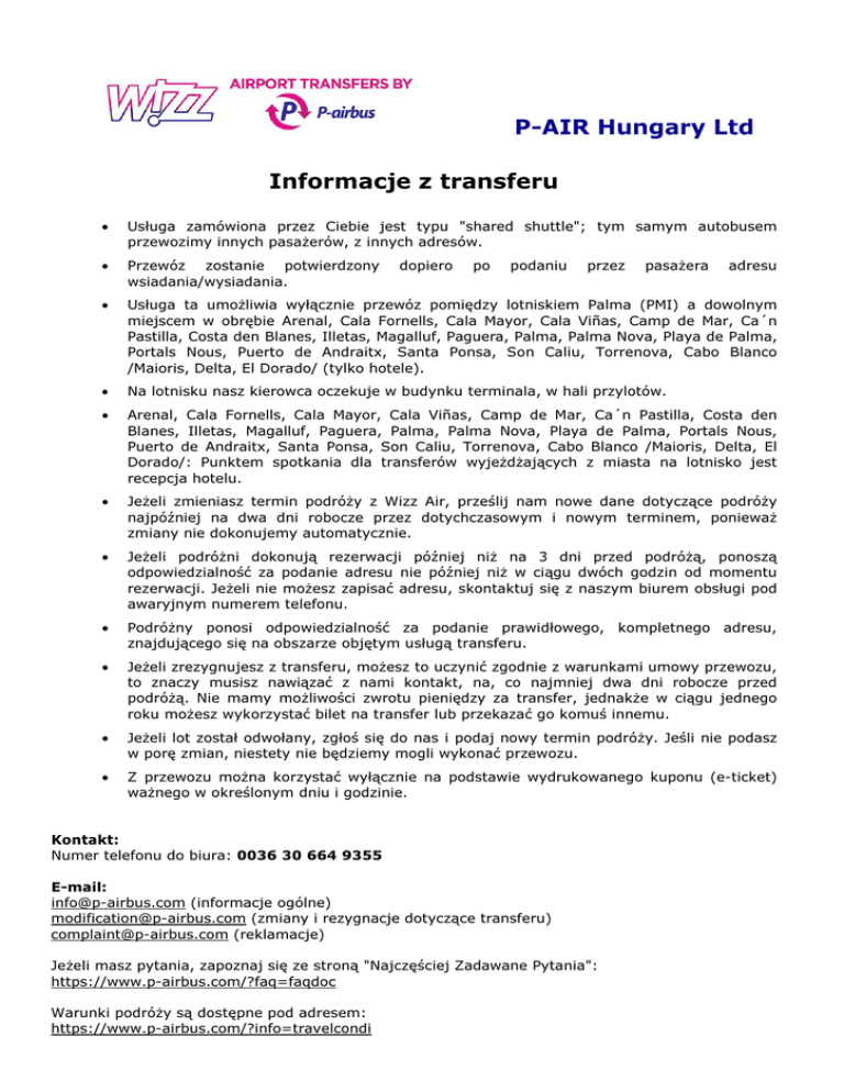 P-AIR Hungary Ltd Informacje z transferu • Usługa zamówiona przez Ciebie jest typu "shared shuttle"; tym samym autobusem przewozimy innych pasażerów, z innych adresów. • Przewóz zostanie potwierdzony wsiadania/wysiadania. • Usługa ta umożliwia wyłącznie przewóz pomiędzy lotniskiem Palma (PMI) a dowolnym miejscem w obrębie Arenal, Cala Fornells, Cala Mayor, Cala Viñas, Camp de Mar, Ca´n Pastilla, Costa den Blanes, Illetas, Magalluf, Paguera, Palma, Palma Nova, Playa de Palma, Portals Nous, Puerto de Andraitx, Santa Ponsa, Son Caliu, Torrenova, Cabo Blanco /Maioris, Delta, El Dorado/ (tylko hotele). • Na lotnisku nasz kierowca oczekuje w budynku terminala, w hali przylotów. • Arenal, Cala Fornells, Cala Mayor, Cala Viñas, Camp de Mar, Ca´n Pastilla, Costa den Blanes, Illetas, Magalluf, Paguera, Palma, Palma Nova, Playa de Palma, Portals Nous, Puerto de Andraitx, Santa Ponsa, Son Caliu, Torrenova, Cabo Blanco /Maioris, Delta, El Dorado/: Punktem spotkania dla transferów wyjeżdżających z miasta na lotnisko jest recepcja hotelu. • Jeżeli zmieniasz termin podróży z Wizz Air, prześlij nam nowe dane dotyczące podróży najpóźniej na dwa dni robocze przez dotychczasowym i nowym terminem, ponieważ zmiany nie dokonujemy automatycznie. • Jeżeli podróżni dokonują rezerwacji później niż na 3 dni przed podróżą, ponoszą odpowiedzialność za podanie adresu nie później niż w ciągu dwóch godzin od momentu rezerwacji. Jeżeli nie możesz zapisać adresu, skontaktuj się z naszym biurem obsługi pod awaryjnym numerem telefonu. • Podróżny ponosi odpowiedzialność za podanie prawidłowego, kompletnego adresu, znajdującego się na obszarze objętym usługą transferu. • Jeżeli zrezygnujesz z transferu, możesz to uczynić zgodnie z warunkami umowy przewozu, to znaczy musisz nawiązać z nami kontakt, na, co najmniej dwa dni robocze przed podróżą. Nie mamy możliwości zwrotu pieniędzy za transfer, jednakże w ciągu jednego roku możesz wykorzystać bilet na transfer lub przekazać go komuś innemu. • Jeżeli lot został odwołany, zgłoś się do nas i podaj nowy termin podróży. Jeśli nie podasz w porę zmian, niestety nie będziemy mogli wykonać przewozu. • Z przewozu można korzystać wyłącznie na podstawie wydrukowanego kuponu (e-ticket) ważnego w określonym dniu i godzinie. dopiero po podaniu przez Kontakt: Numer telefonu do biura: 0036 30 664 9355 E-mail: [email protected] (informacje ogólne) [email protected] (zmiany i rezygnacje dotyczące transferu) [email protected] (reklamacje) Jeżeli masz pytania, zapoznaj się ze stroną "Najczęściej Zadawane Pytania": https://www.p-airbus.com/?faq=faqdoc Warunki podróży są dostępne pod adresem: https://www.p-airbus.com/?info=travelcondi pasażera adresu